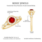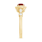 Delicate vintage artistry meets modern brilliance in this Lab Grown Ruby Engagement Ring. The design captures the romance of antique jewelry with a touch of contemporary elegance. At its center lies a 5 MM round cut lab grown ruby. The ruby is encircled by a halo of glittering round cut diamonds, each one carefully set to amplify its fiery sparkle. Adding depth and texture, the shank features intricate beaded detailing that enhances the ring’s vintage charm. Tiny diamond side stones shimmer along the band, bringing subtle light and movement to the piece. The combination of AAAA quality lab grown ruby and sparkling HI-SI quality diamonds creates a look that feels romantic. The craftsmanship reflects timeless attention to detail, offering a piece that feels luxurious yet meaningful. Crafted with an eco-friendly, lab-grown ruby, this Vintage Looking Engagement Ring is a thoughtful choice for anyone who values sustainability and ethical beauty. The durable design ensures lasting brilliance, perfect for a lifetime of love and memories. Packaged beautifully and ready to gift, this Ruby and Diamond Ring is a keepsake of style, love, and conscious sophistication.
