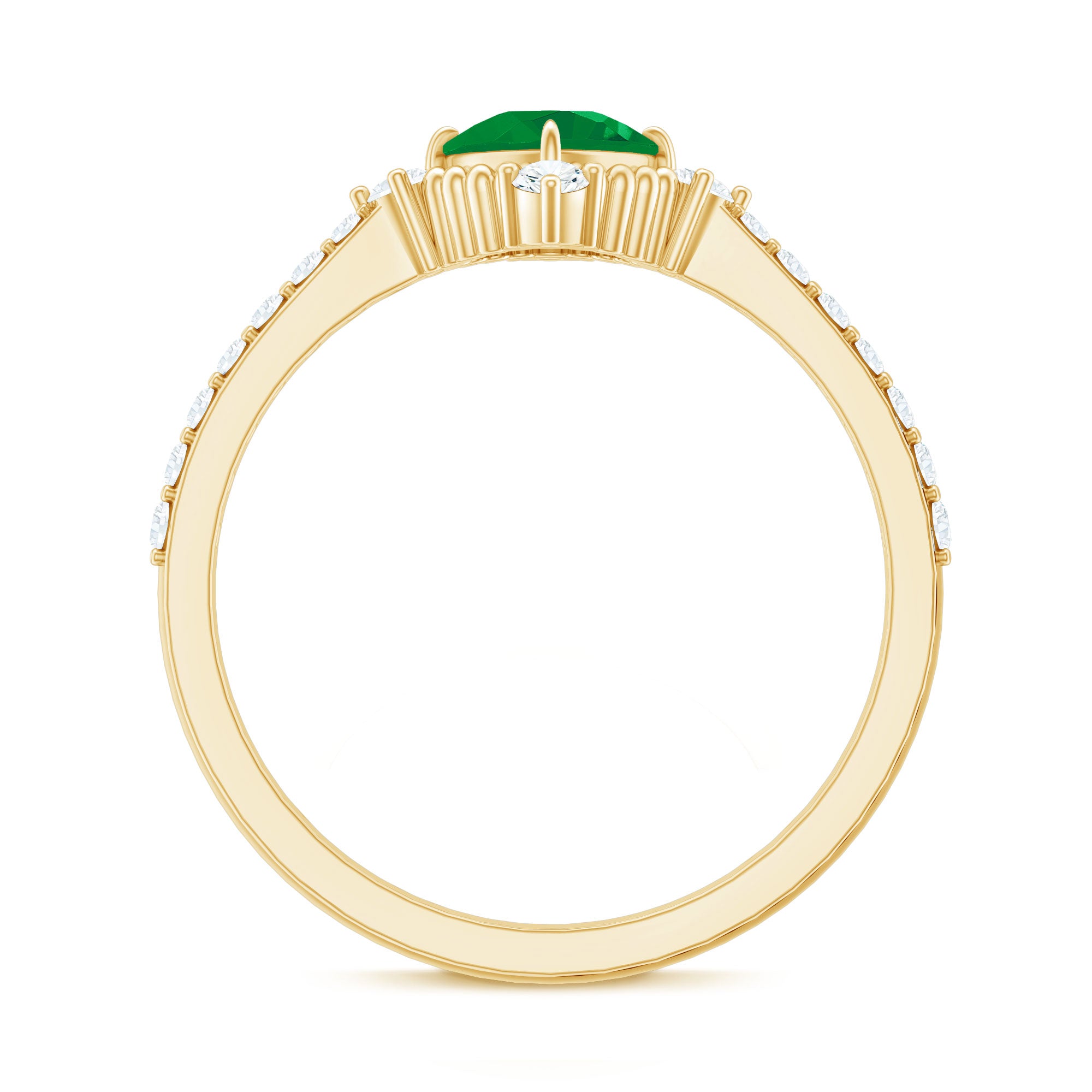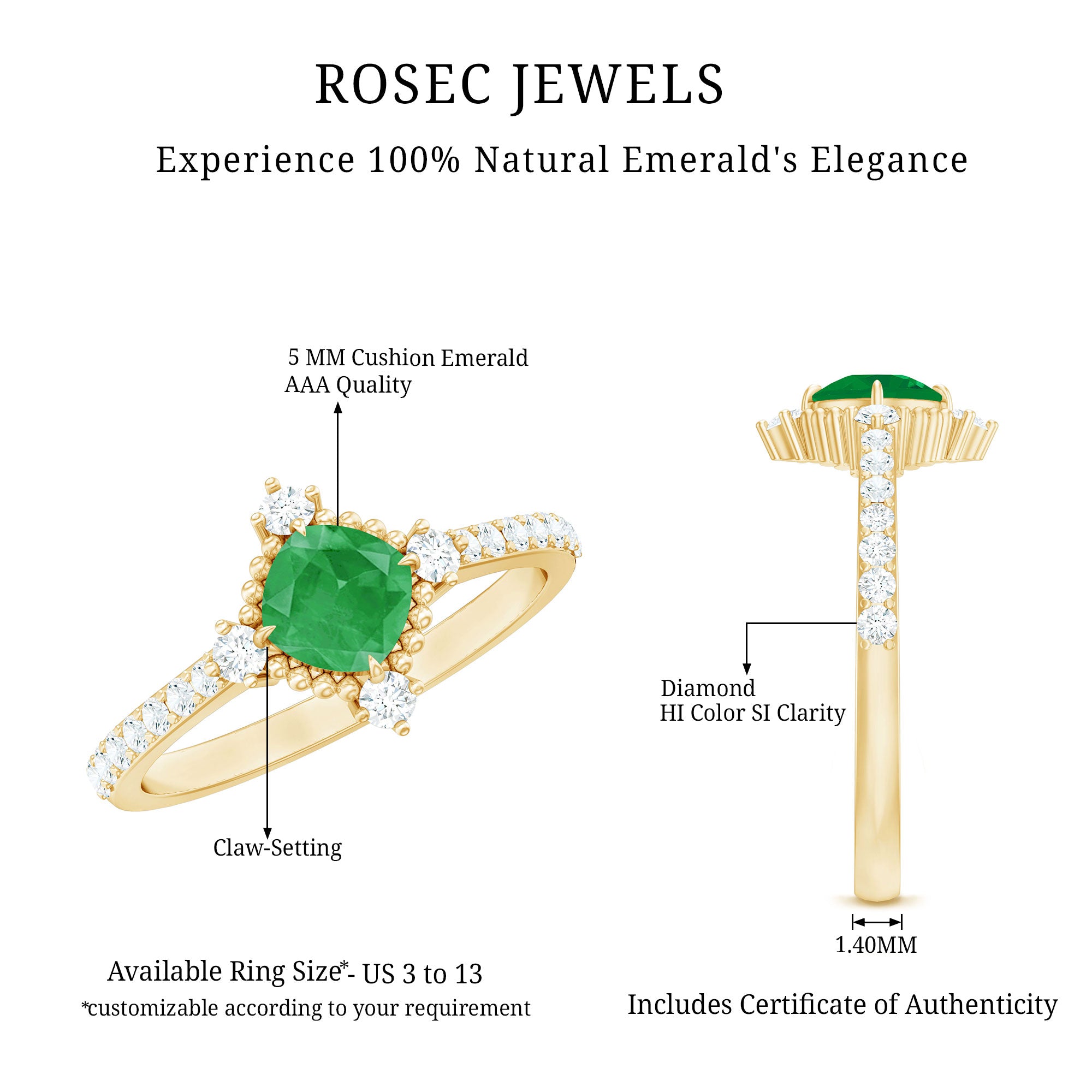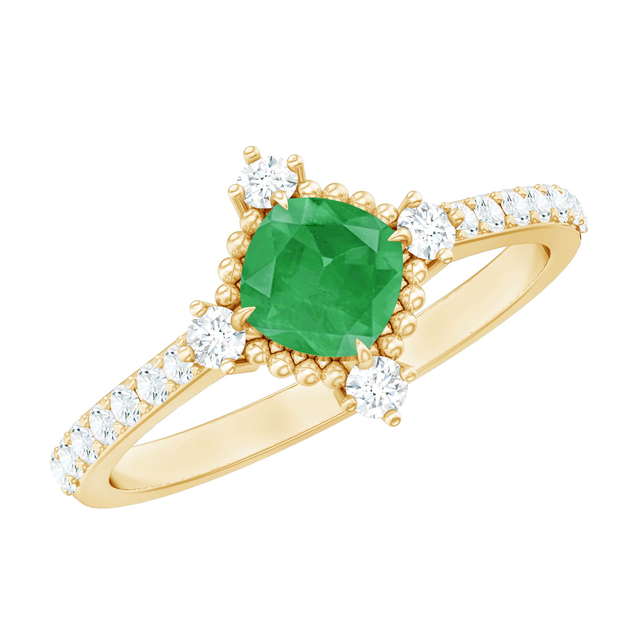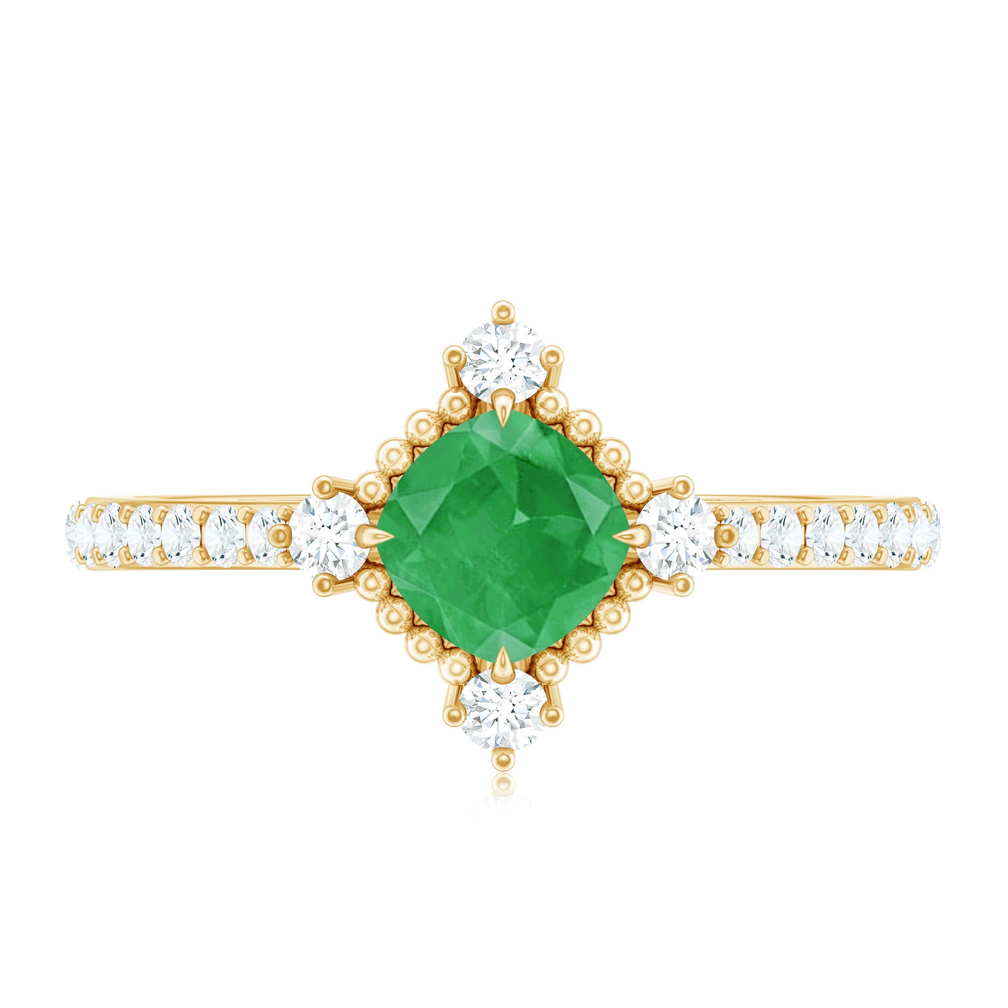 Move into a world where timeless elegance meets modern romance with this Vintage Inspired Engagement Ring. At its center, a 5 mm Cushion Cut Emerald is set diagonally in Claw Setting, surrounded by sparkling Diamond stones and intricate Beaded Detailing. Flanked by sparkling Diamond Side Stones, this Cushion Cut Engagement Ring captures the essence of vintage charm while shining with contemporary brilliance, making it a piece that feels both nostalgic and unique. Presented in a sophisticated jewelry box and offered in multiple sizes, this Emerald Diamond Ring ensures the perfect fit for your beloved’s hand, transforming a simple gesture into a lifetime memory. This Emerald Ring for Women is a treasure meant to be cherished, admired and passed down through generations. Whether it graces a proposal under the stars or becomes a daily reminder of a shared journey, its beauty reflects the devotion, passion and endless possibilities of your love.