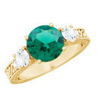This Antique Looking Engagement Ring is a beautiful blend of elegance and meaning, designed to capture the essence of your love story. The striking 8 mm Round Shape Lab Created Emerald set in Prong Setting takes center stage, symbolizing hope, growth, and harmony. It is flanked by Round Shape Moissanite stones, adding extra sparkle and a touch of modern sophistication. The mesmerizing band features engraved detailing that enhances the overall brilliance. This captivating 3 Stone Engagement Ring holds special meaning, representing the past you have shared, the present moment of your engagement, and the bright future that lies ahead together. This Lab Grown Emerald Ring is a timeless symbol of enduring love and deep connection. This Past Present Future Ring ensures a perfect fit and comfortable wear for daily elegance. It comes carefully packaged in a beautiful jewelry box, ready to be gifted and cherished. Whether it is for a proposal, anniversary, or a special celebration, this Lab Emerald Engagement Ring is the perfect choice for your beloved. Its meaningful symbolism makes it a piece she will always keep close to her heart, as a token of your everlasting love.
