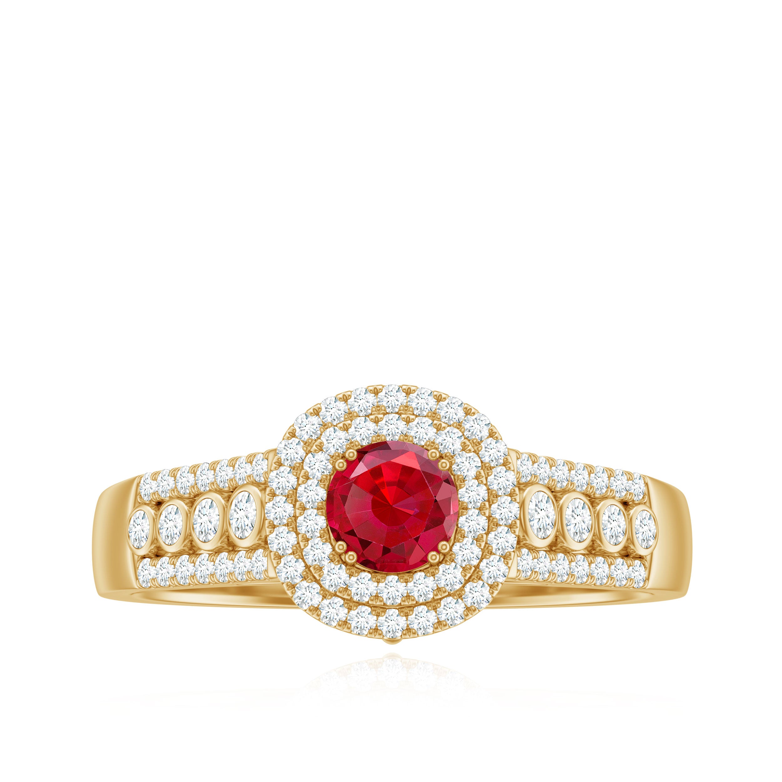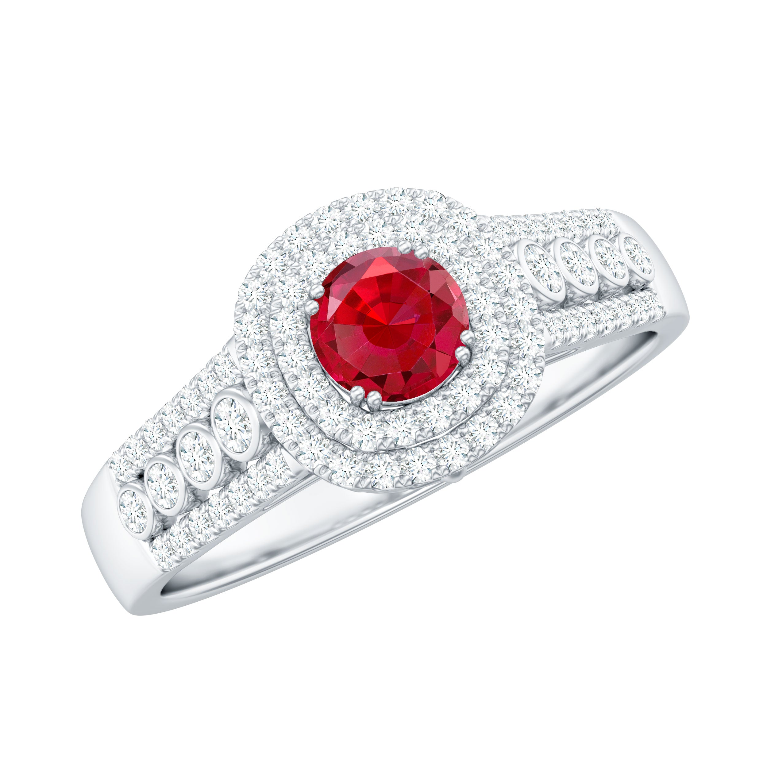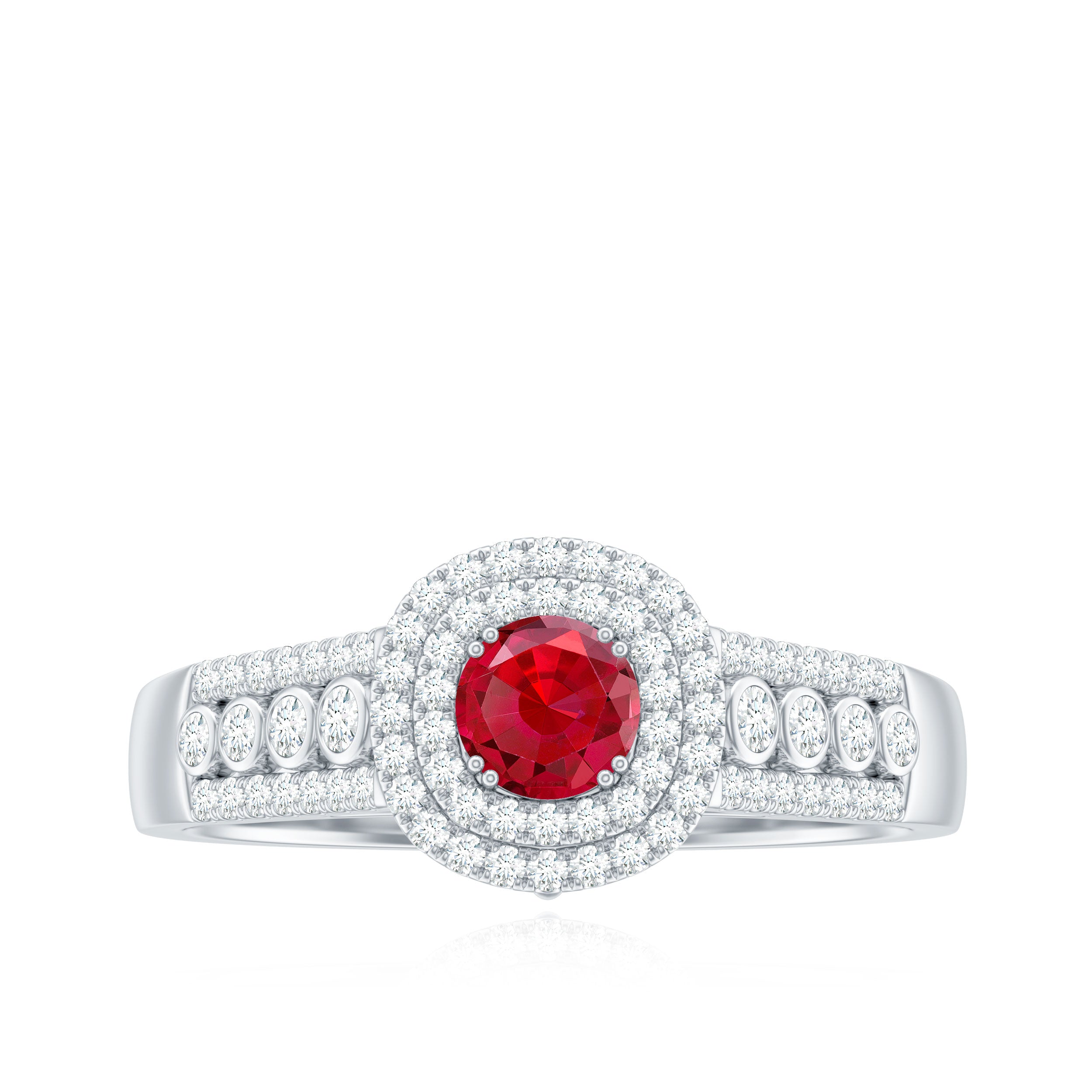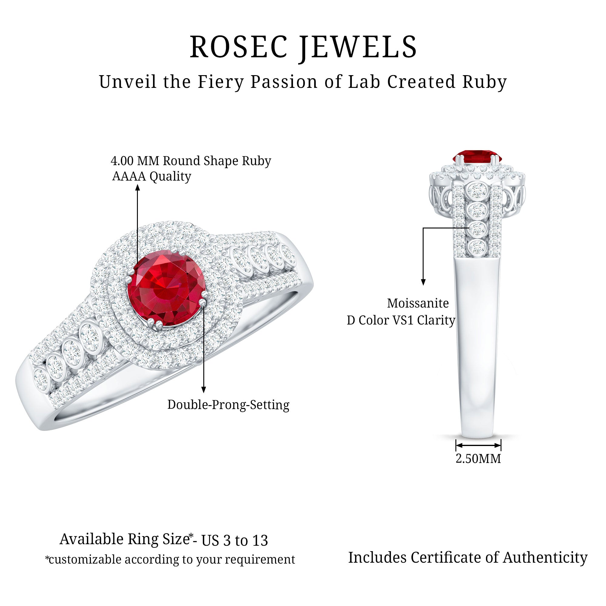 Step into the spotlight with a ring that is bold, sparkly, and full of charm. Designed with a vintage soul and a modern twist, this Lab Created Ruby Engagement Ring brings together all the right details to make your moment unforgettable. It is handcrafted with a 4 MM round shaped ruby, set neatly in prongs. Surrounding it is a dazzling double halo of moissanites, creating a burst of sparkle that grabs attention without saying a word. What makes this Ruby and Moissanite Ring extra special is the wide band. It is crafted with three rows of brilliant moissanite stones that add even more shine and give off that gorgeous Art Deco-inspired vibe. Every part of this Antique Looking Engagement Ring is meant to catch the light and turn heads, all while keeping things elegant and timeless. The rich red hue of the AAAA quality lab ruby paired with the icy brilliance of D color and VS1 clarity moissanites creates a perfect contrast that stands out from the usual designs. It arrives beautifully packed in a jewelry box and comes with a certificate of authenticity, so you know you are getting something truly special. Romantic and a little bit vintage, this Double Halo Ring is all about love that sparkles just as much as it lasts.