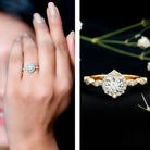 This Moissanite Engagement Ring will make her feel special on the big day. This ring is embellished with the 6 MM Round Shape Moissanite delicately placed in Prong Setting encircled by a Halo of Petite Moissanite. This Classic Engagement Ring is inspired by the vintage jewelry collection. Declare your feelings for your partner by getting this Vintage Inspired Engagement Ring as it will stay close to her forever. The shank of the ring is decorated with Moissanite along with the beaded detailing. Celebrate your bond with this stunning Halo Ring that beholds the shine of D-Vs1 Quality Moissanite.