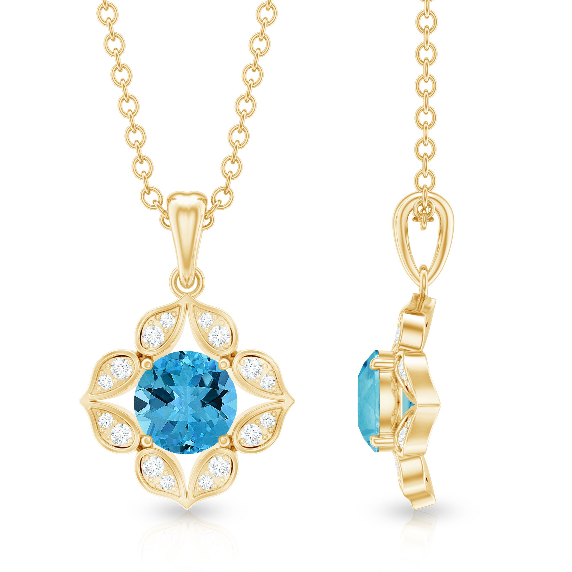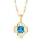 Enhance your bridal ensemble with the breathtaking beauty of this exquisite Natural Swiss Blue Topaz Pendant. The antique design showcases a round Swiss Blue Topaz center stone, radiating its deep blue allure, elegantly encircled by a halo of sparkling Diamond gemstones. This pendant is the perfect choice for brides-to-be seeking a timeless and elegant piece of jewelry to adorn themselves on their special day.