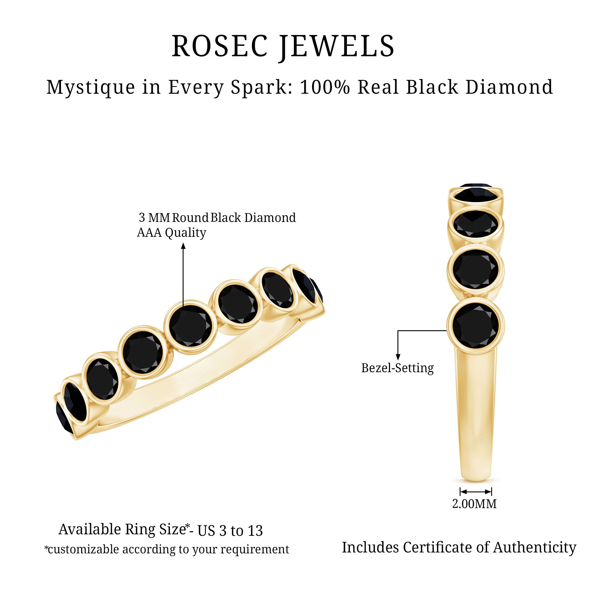 Be in the limelight with this Eternity Ring. It features with Round Cut Black Diamond in Bezel Setting. This Birthstone Ring for Girls is crafted in Solid Gold.
