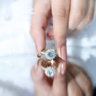 Unleash your inner diva with the Aquamarine Statement Ring. This ring showcases a round-cut aquamarine encircled by a halo of clustered Moissanite gems. The striking design enhances your appearance and adds a touch of elegance to your ensemble.