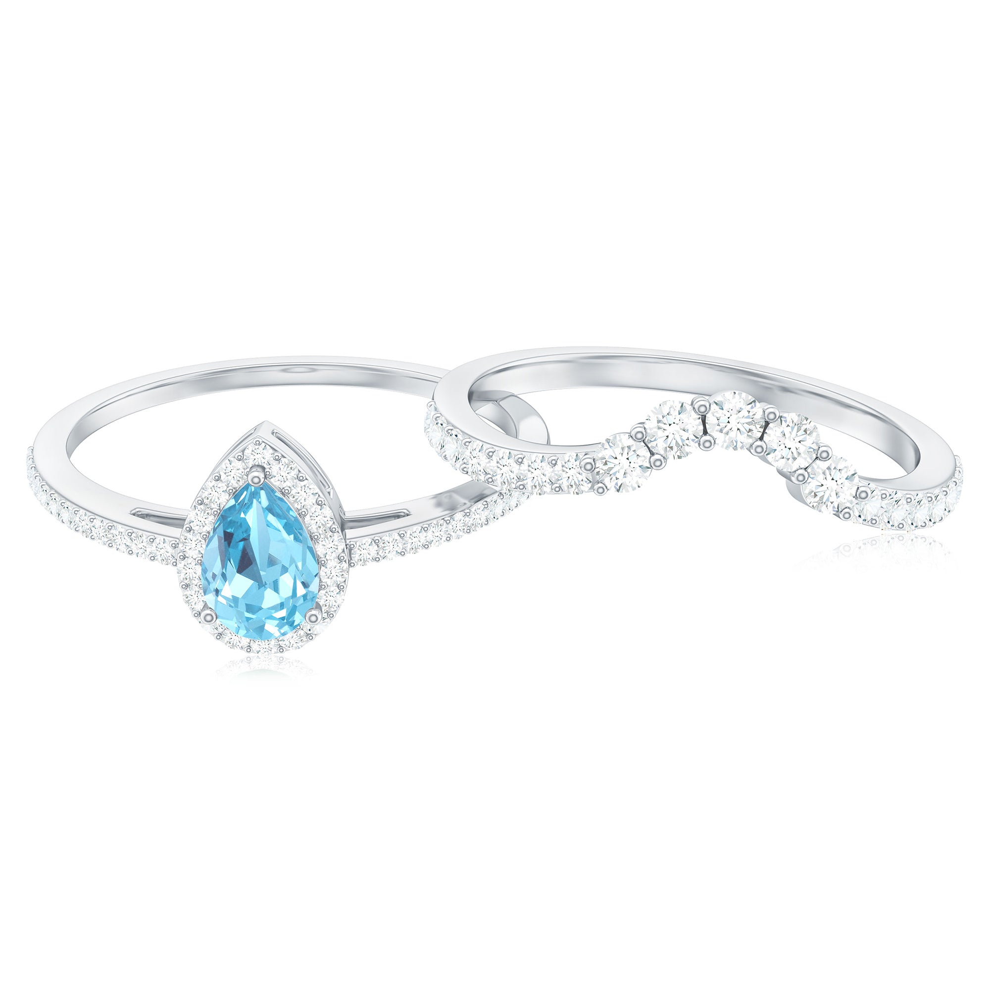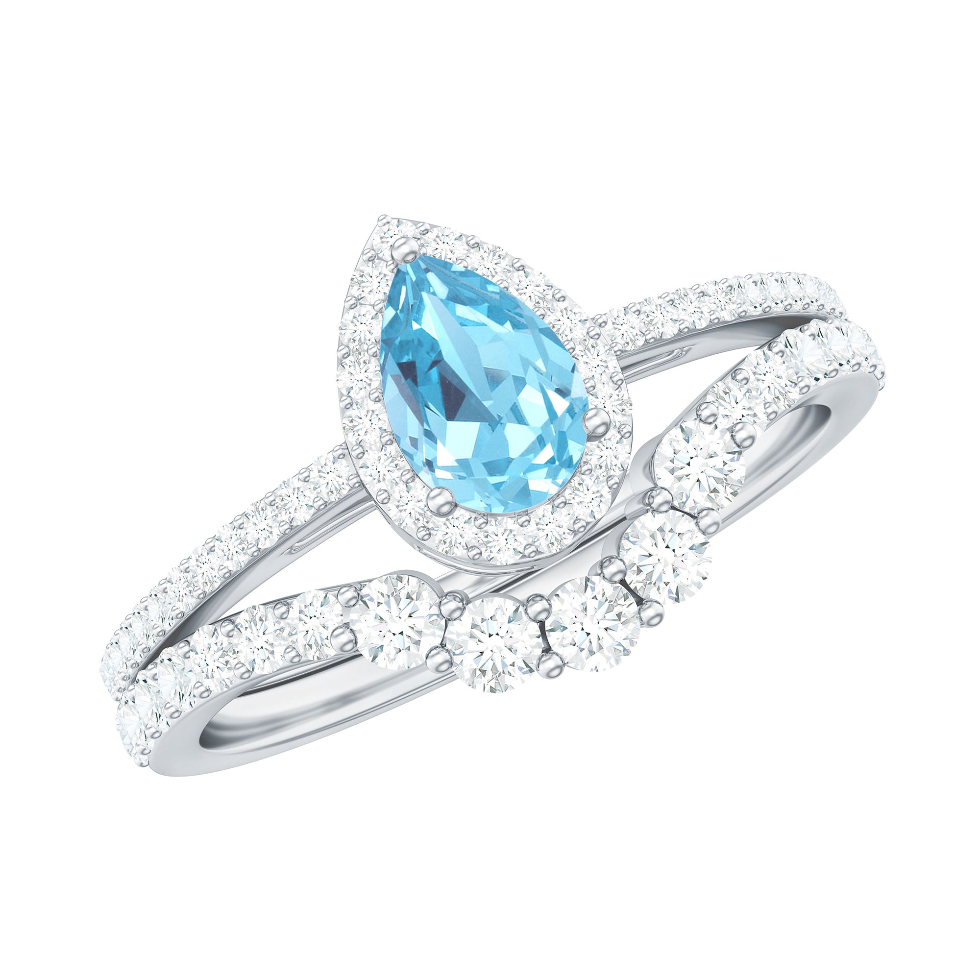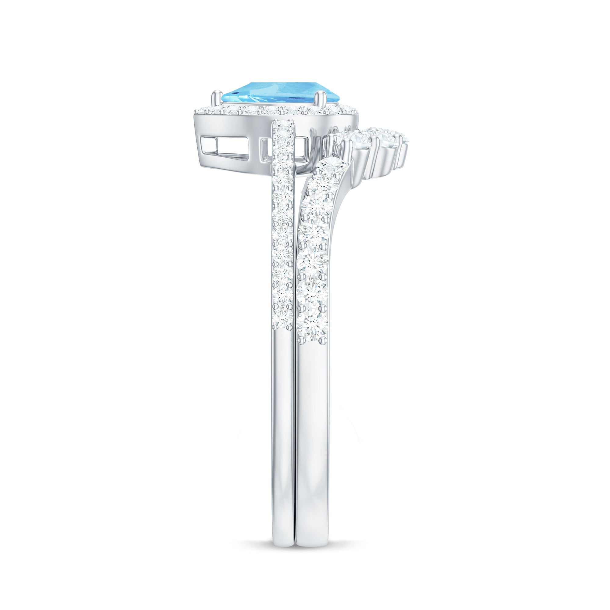 Aquamarine Designer Teardrop Ring Set with Diamond Halo