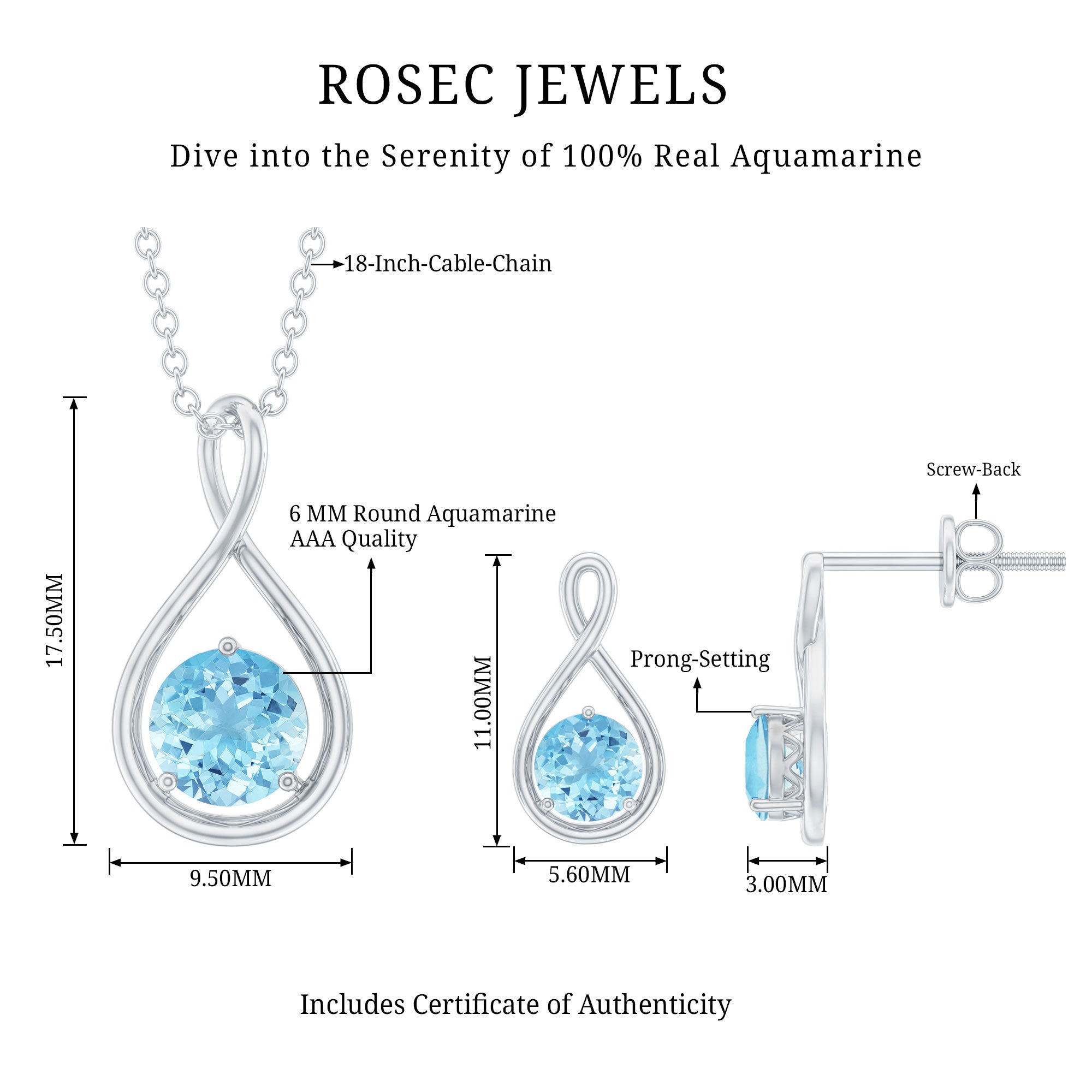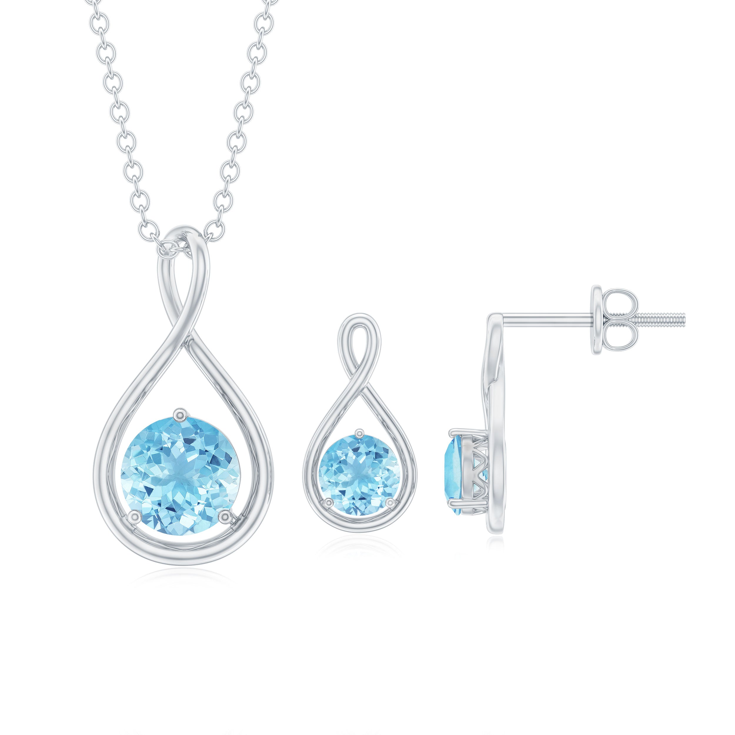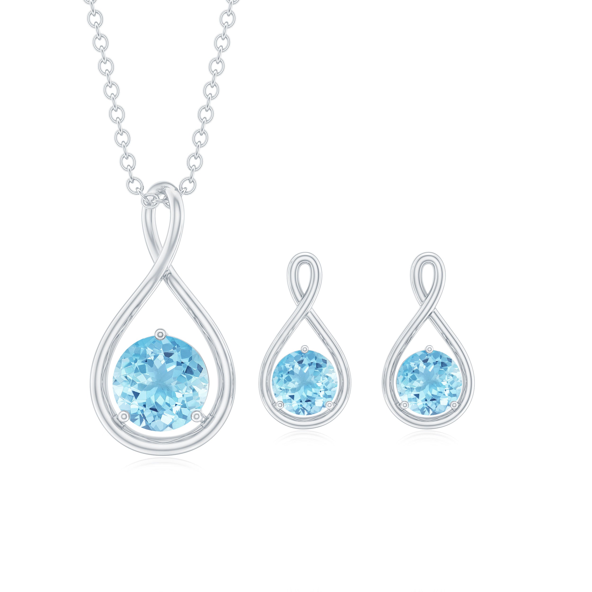 Dazzle in our Infinity Jewelry Set featuring a 6 MM Round Cut Aquamarine Solitaire in a unique Infinity style Pendant and 4 MM Solitaires in Infinity Earrings, this classic Infinity Earrings and Necklace Set will add grace and elegance to your look.
