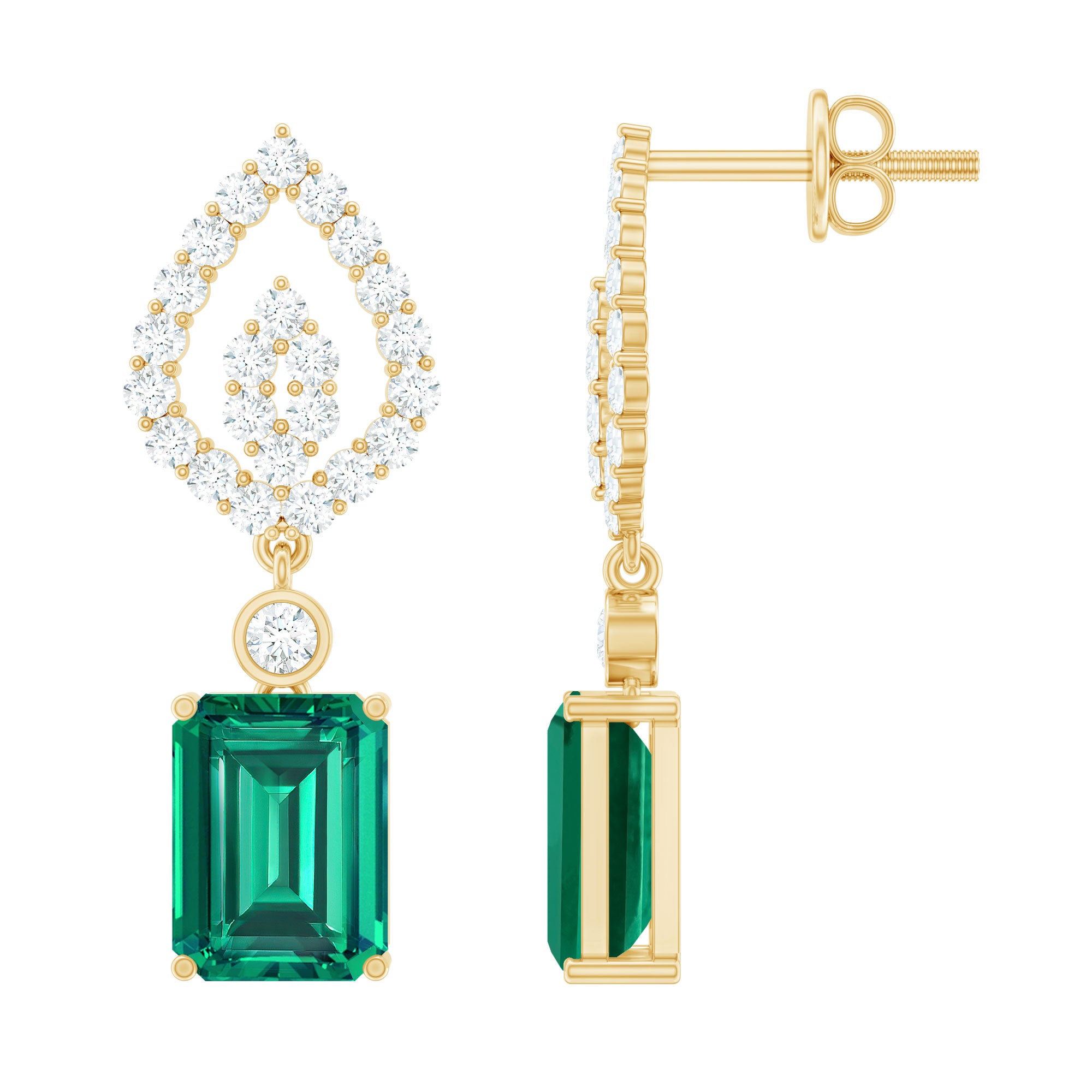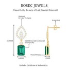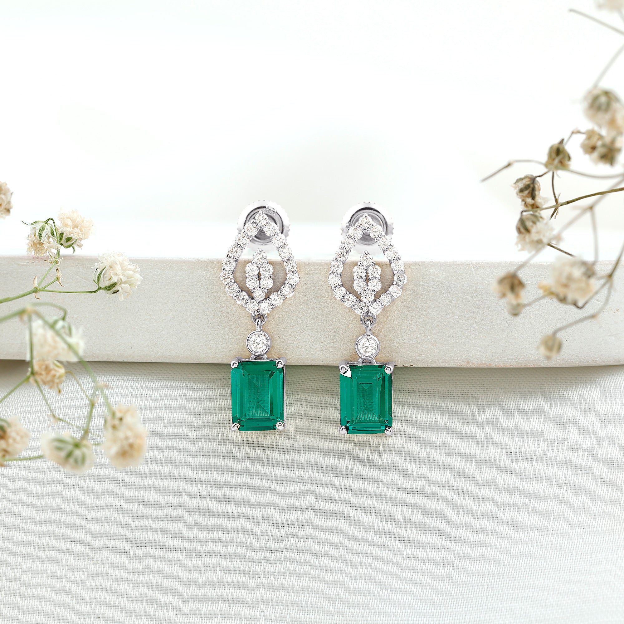 Versatility meets style with these Art Deco Lab Created Emerald Earrings. An 6x8mm Emerald Cut Lab Created Emerald gracefully hangs down from the top design, adorned with Round Lab Grown Diamond Accent to make these Earrings. Whether youre attending a formal gala or a casual gathering, these Art Deco Earrings are designed to complement your attire, adding a touch of grace and refinement to any look. The earring shines with Aaaa Quality Emerald and Ef-Vs Quality Diamonds. Experience the comfort of wearing these earrings for extended periods without compromising on style. The lightweight design of these Emerald Diamond Earrings ensures that you can showcase this remarkable piece with ease, allowing you to enjoy the event without any discomfort.