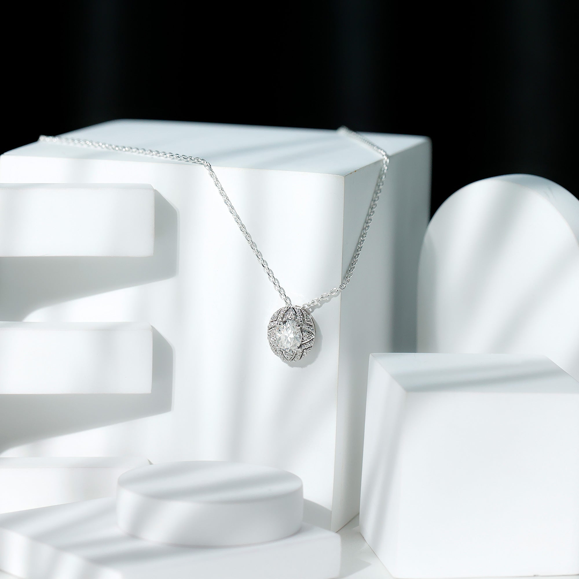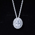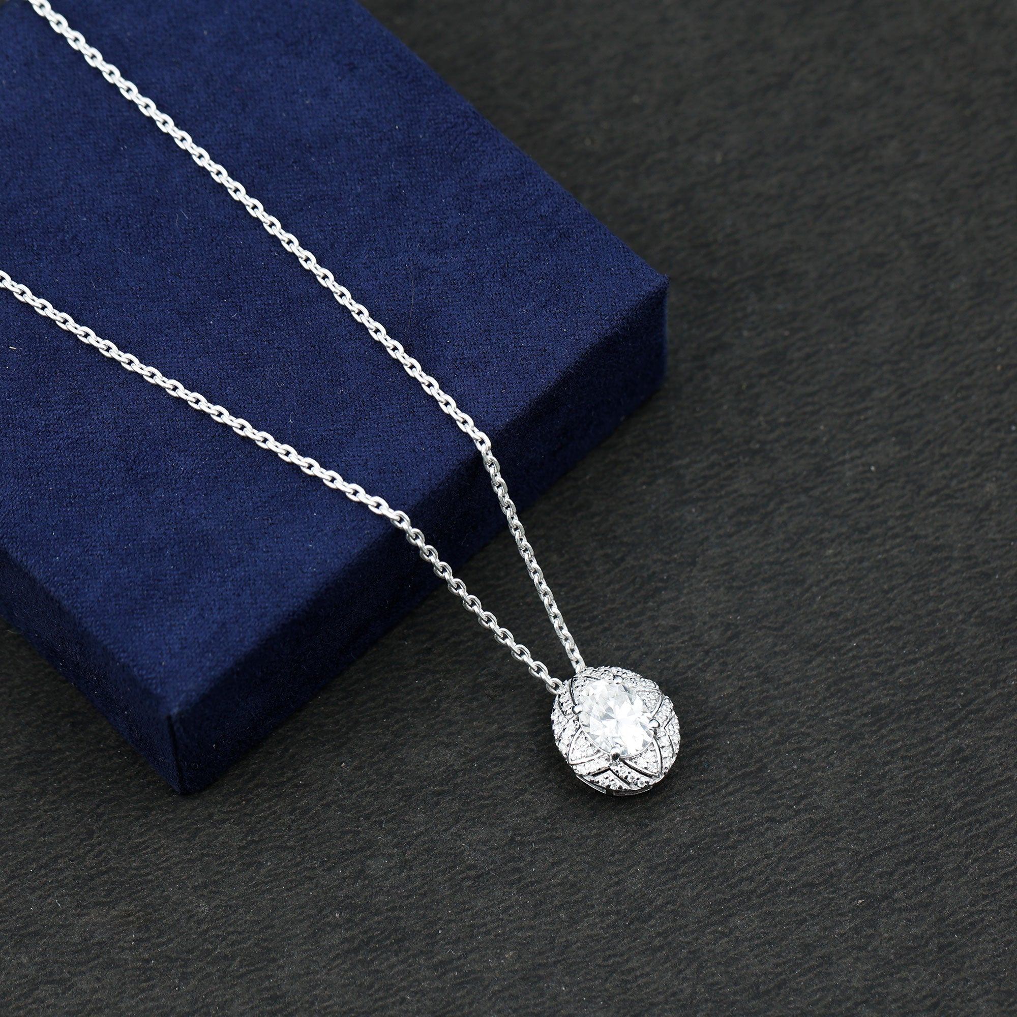 Be the talk of the town with this sparkling Moissanite Pendant Necklace, precisely crafted with 14K White Gold Plated Silver. The pendant features a 7X9 MM Oval Shape Moissanite secured in Prong Setting and adorned with smaller Moissanite stones that beautify the overall look. This Art Deco Pendant dazzles unmatchable shine of D-VS1 Quality Moissanite and is accentuated with a Hidden Bail. This Statement Pendant dangles in a sturdy cable chain which makes it perfectly sit on the neckline. The Designer Necklace will be delivered to you in a signature velvet pouch with the certificate of authenticity.