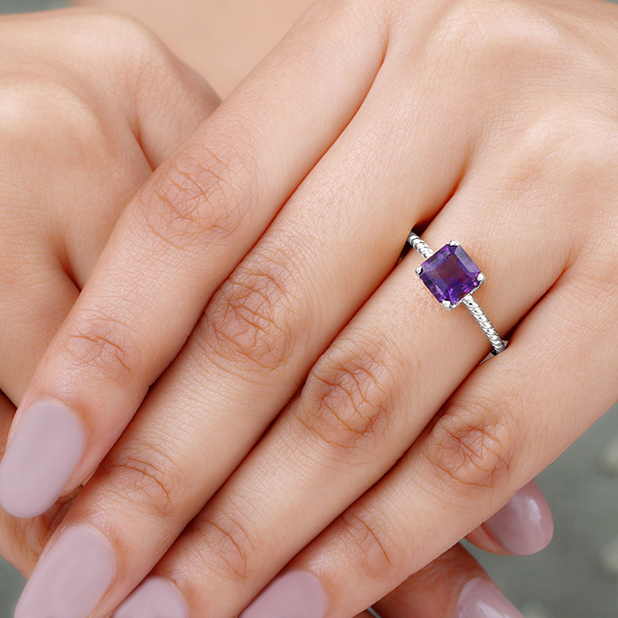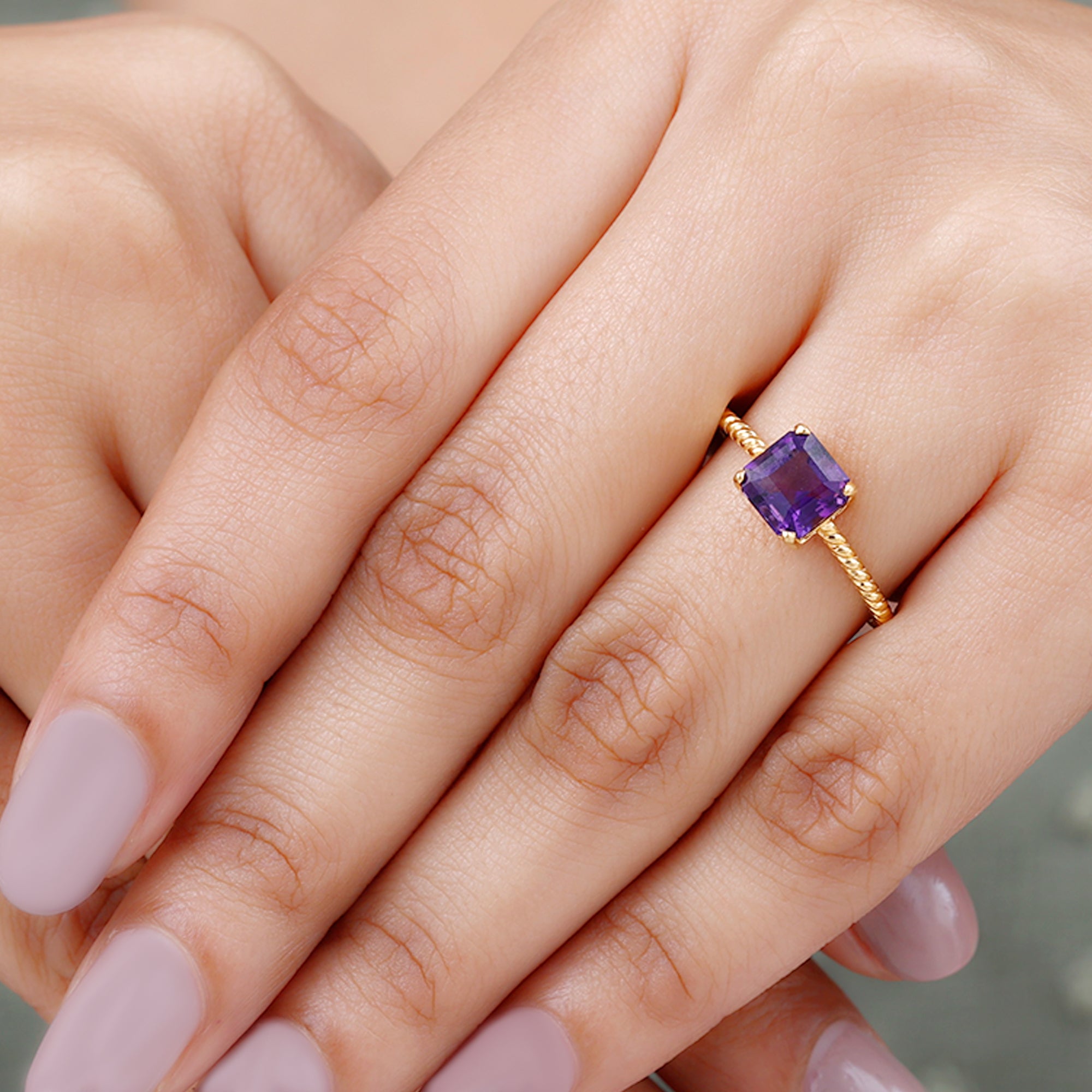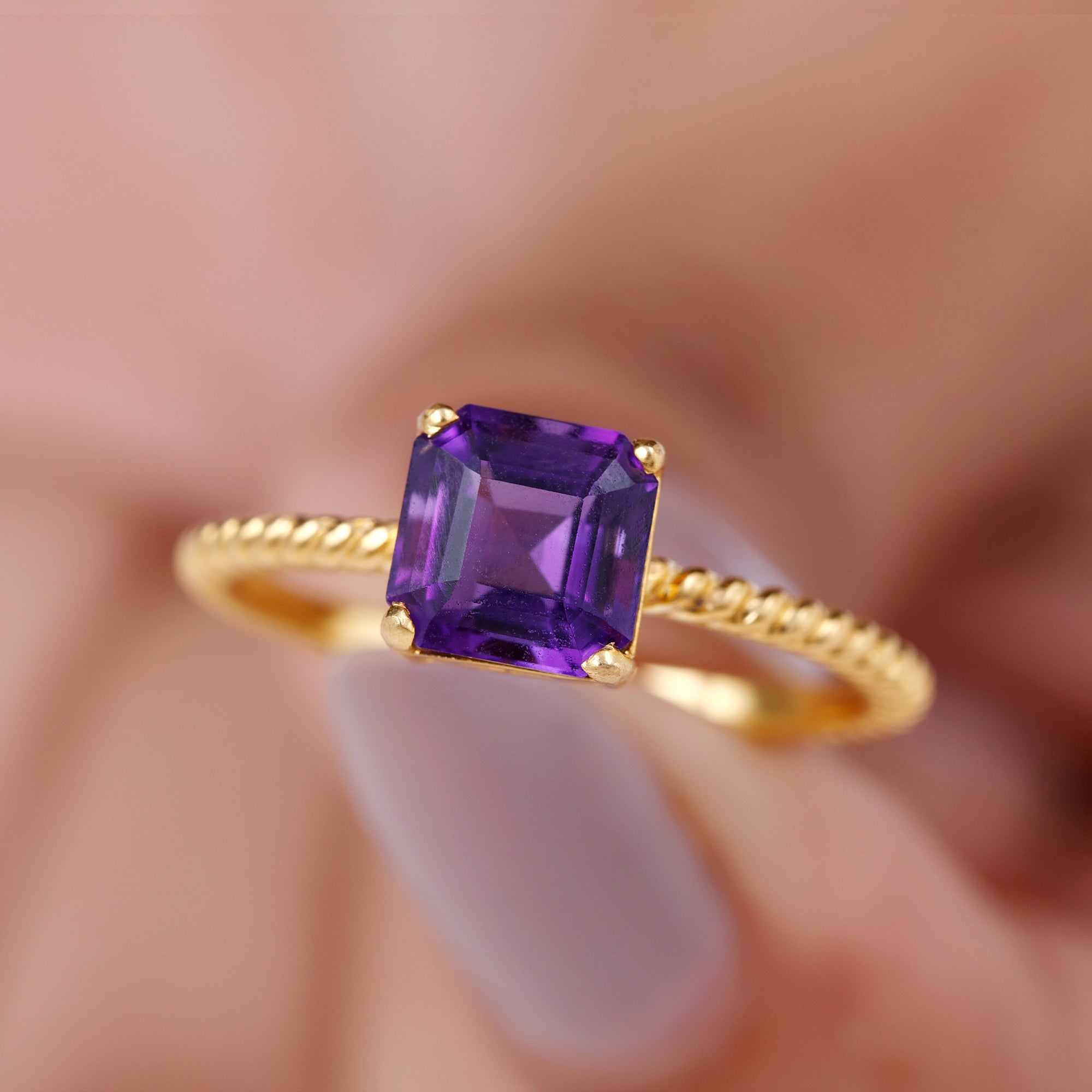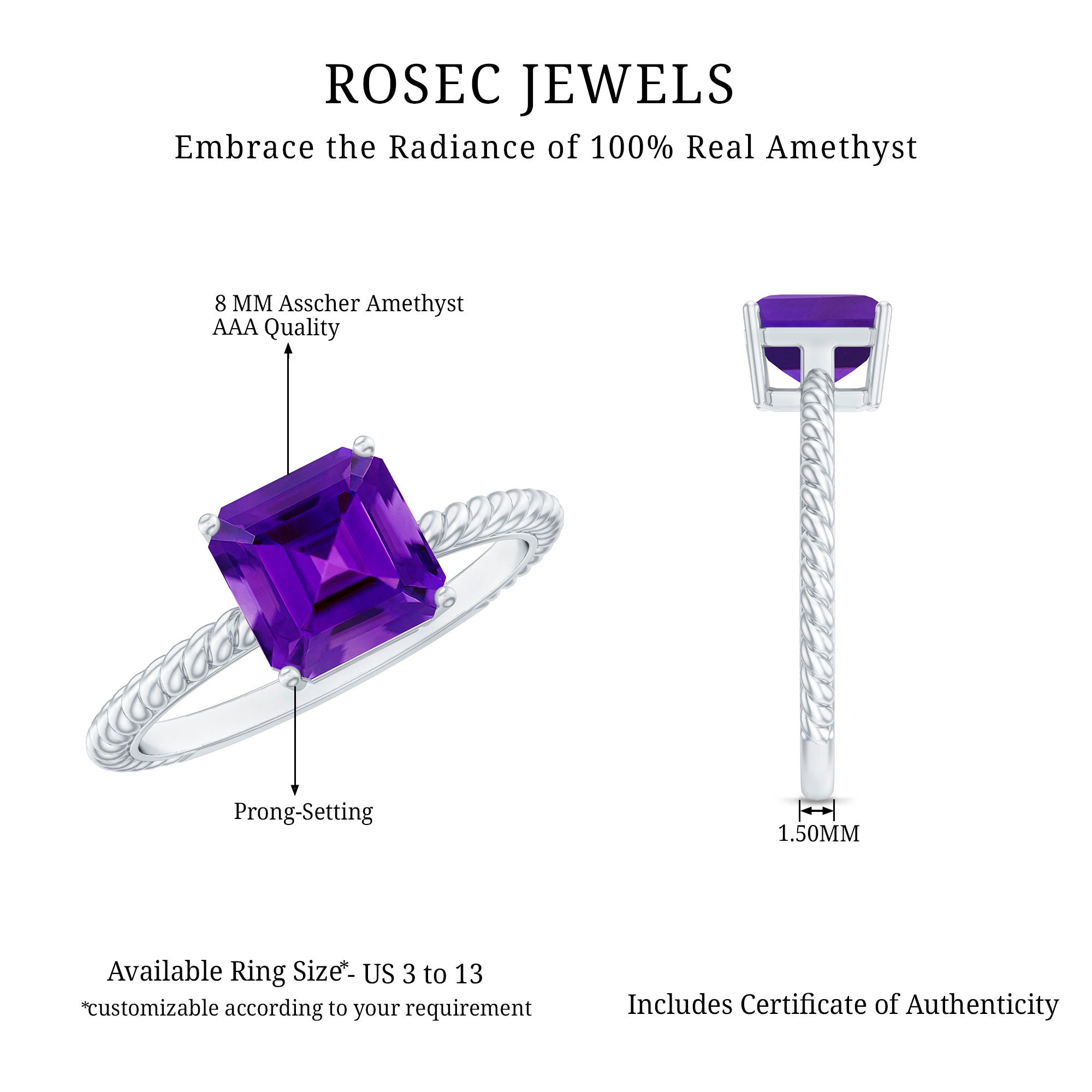 Enhance your shopping experience by adding this Solitaire Ring to your cart, a flawless choice for a birthday gift to cherish. Featuring an Asscher Cut Amethyst set in a secure Prong Setting, adorned with intricate Twisted Rope Detailing along the shank, its a token of love shell treasure.