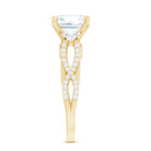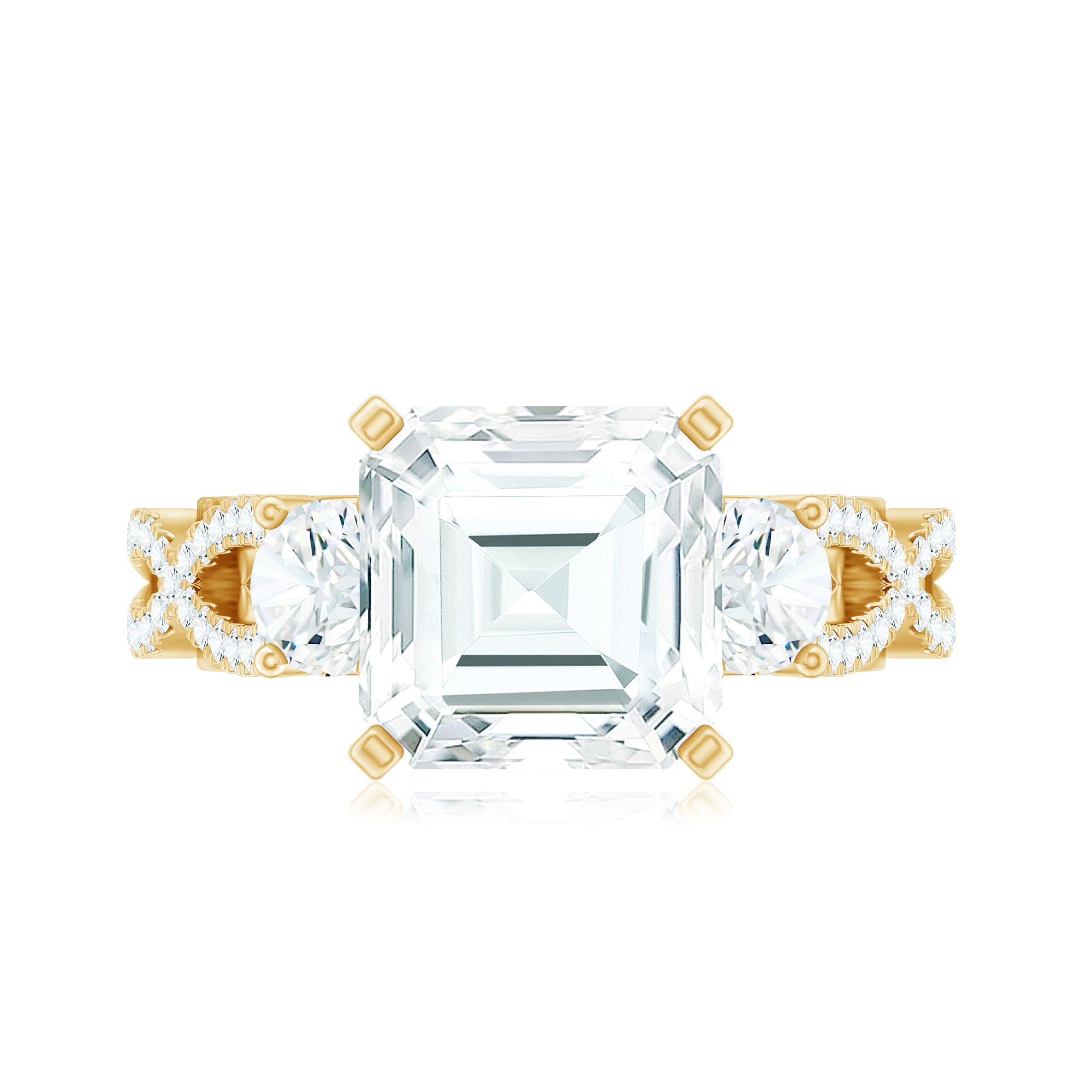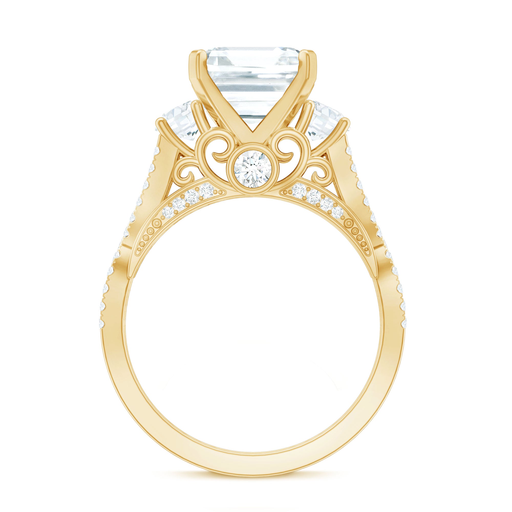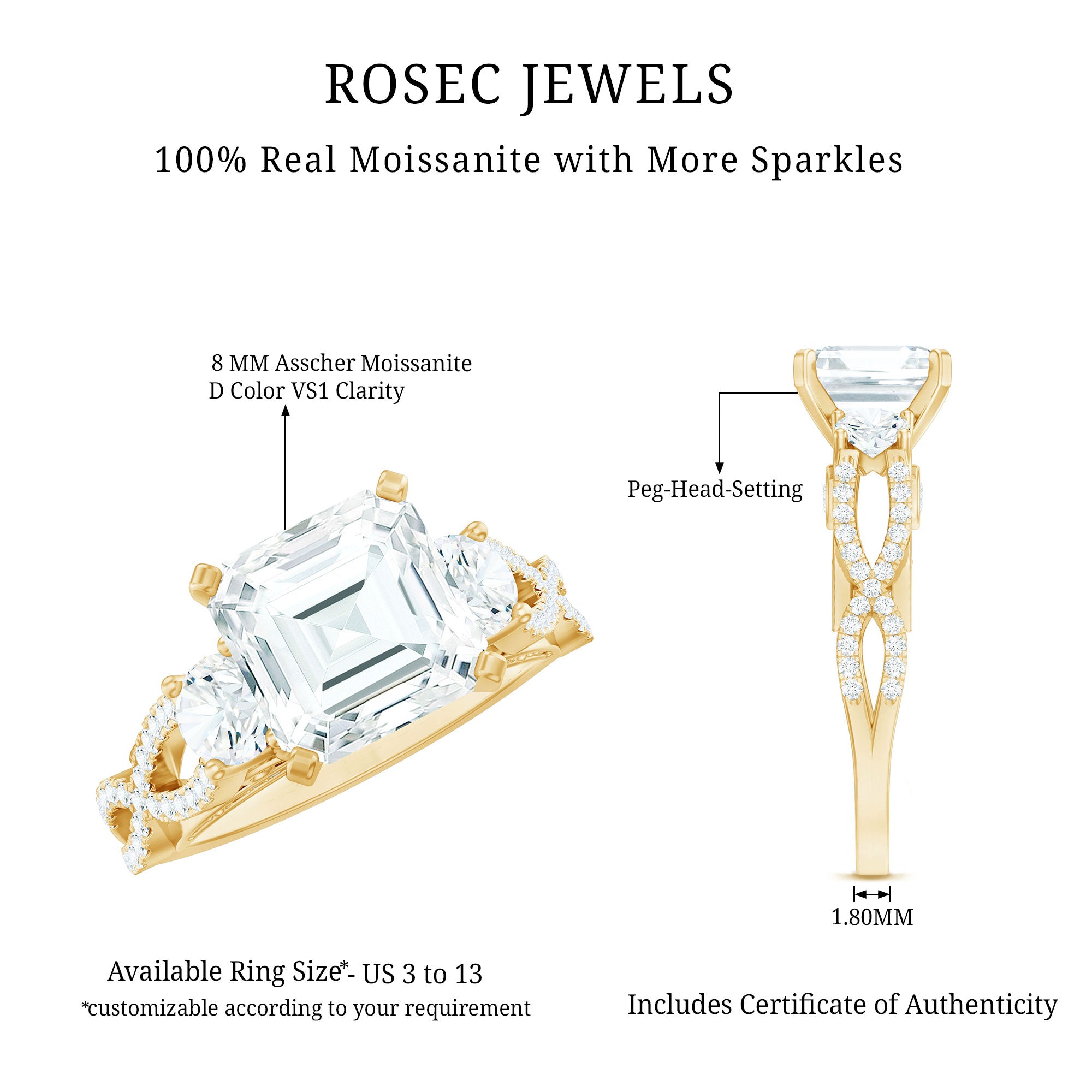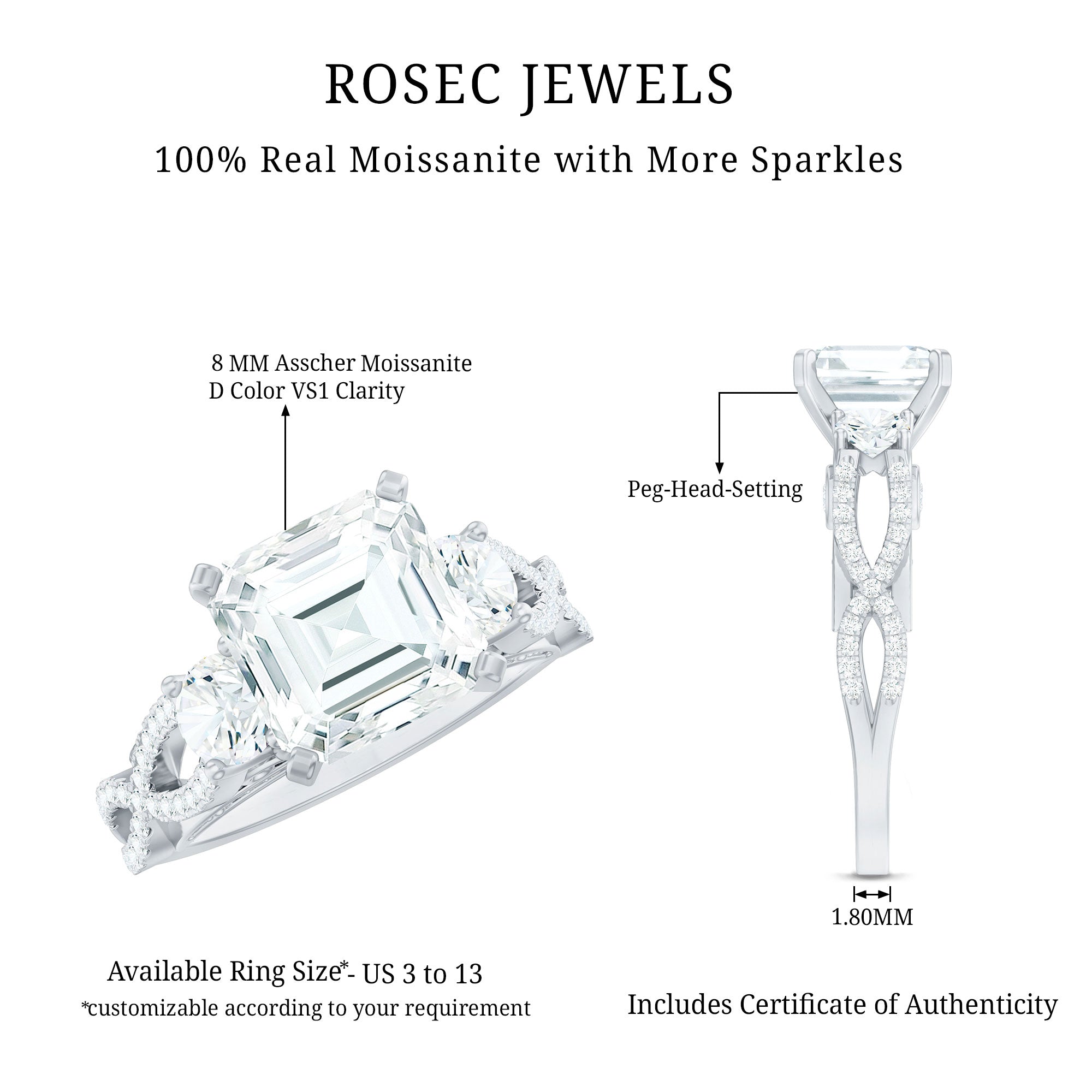 A stunning fusion of vintage artistry and timeless elegance, this Asscher Cut Moissanite Engagement Ring captures the essence of classic romance. At its heart lies an 8 MM Asscher cut moissanite, expertly set in peg head setting. Flanking the center stone are two round moissanites, nestled both side of the main gem that creates a soft, flowing symmetry. The band is adorned with intricately set round stones, gracefully forming a crossover pattern that evokes the delicate curves of antique design. Each shimmering accent stone adds depth and radiance, enhancing the overall brilliance of the Vintage Moissanite Ring. Underneath the center stone, a gallery of vintage-inspired scrollwork embraces a bezel-set round moissanite, offering a hidden touch of beauty only visible upon closer admiration, a true nod to heirloom craftsmanship. From the romantic under-gallery to the crossover band encrusted with sparkling gems, every element is a celebration of refined elegance and handcrafted detail. This Criss Cross Engagement Ring is a masterpiece of vintage design, crafted to be treasured for generations. Whether worn as an engagement ring, a proposal ring, or a personal statement, it speaks to the enduring beauty of love stories written in sparkle.