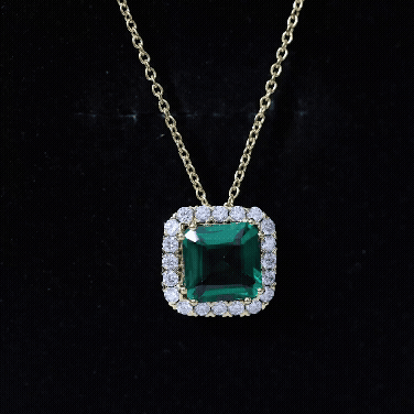 Make a bold and timeless statement with this stunning Lab Grown Emerald Necklace, a true showstopper for every special occasion. Handcrafted in 14k yellow gold plated silver, the Halo Pendant showcases a mesmerizing 9 MM Asscher Cut Lab Grown Emerald, held securely in double claw setting that allows the gemstone’s rich green hue to shine from every angle. Encircling the vibrant emerald is a dazzling halo of Round Brilliant Cut Moissanite, adding brilliant contrast and depth to the design. Suspended from a durable cable chain, the Green Stone Necklace sits beautifully on the neckline, making it a perfect piece to wear with everything from formal evening wear to a chic cocktail outfit. The fine craftsmanship and classic design make this Emerald and Moissanite Necklace a versatile piece that transitions effortlessly from a day celebration to an elegant night event. The AAAA quality lab grown emerald offers intense color and clarity, while the D-VS1 quality moissanite halo provides exceptional sparkle, together creating a radiant focal point that draws attention in the most elegant way. With its vintage inspired appeal and modern glamour, this Asscher Cut Necklace is a treasure that will be cherished for years to come.