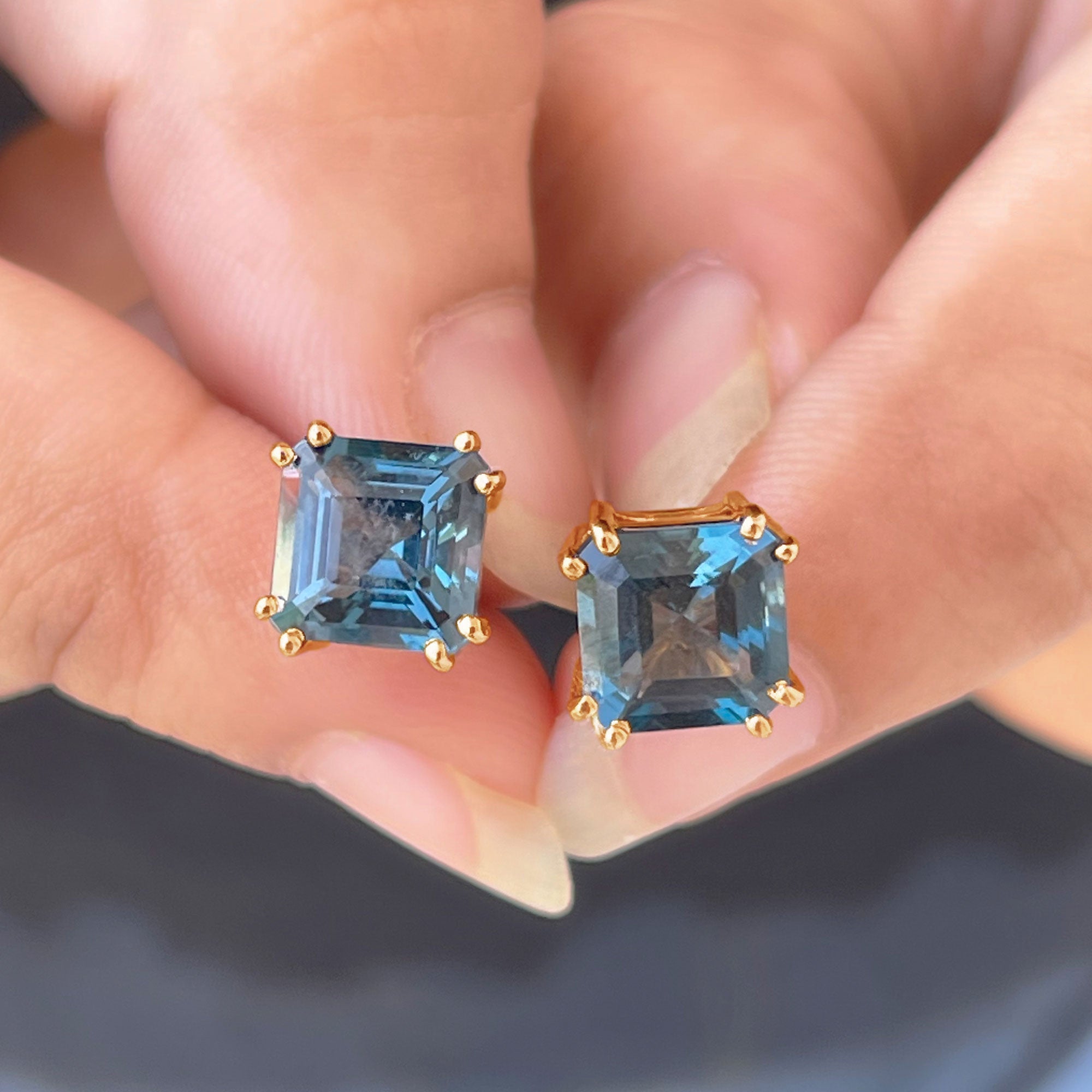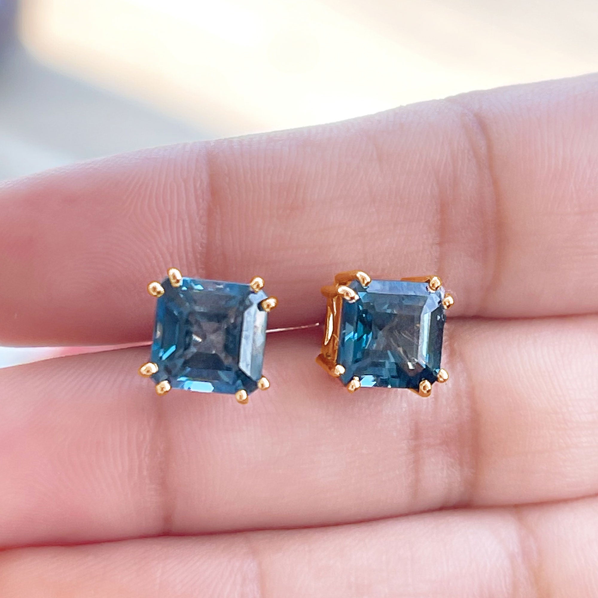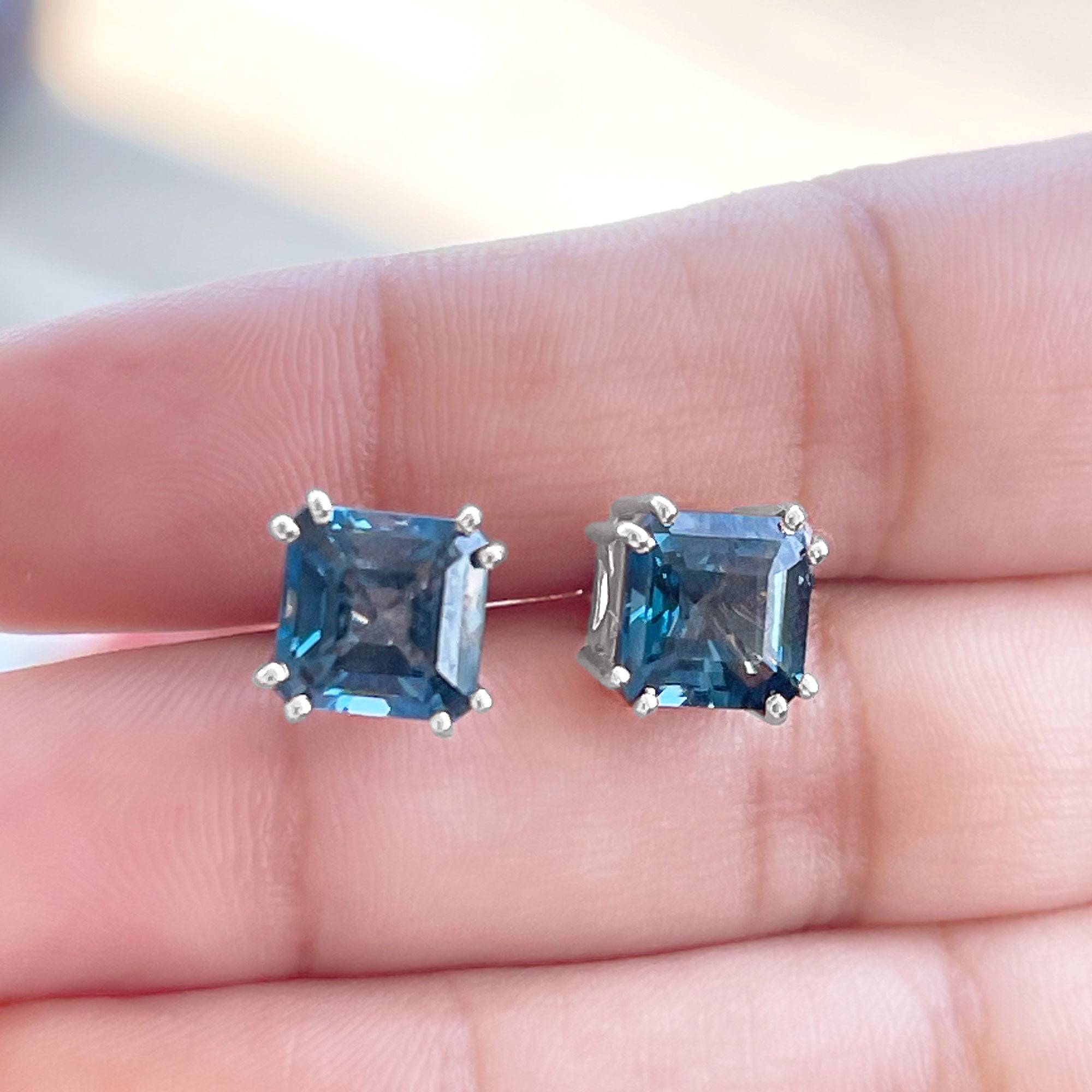 Brilliant color meets timeless style in these elegant London Blue Topaz Stud Earrings. Each earring features a striking 8 MM London Blue Topaz, of AAA quality for exceptional clarity, durability, and long-lasting shine. Set in a secure double prong setting, the Asscher cut shows off its lines and sharp facets, giving each stone a modern and eye-catching sparkle. This unique shape adds depth and character, making the Solitaire Studs a beautiful addition to any jewelry collection. London Blue Topaz is the December birthstone, symbolizing peace, strength, and harmony, making these Asscher Cut Earrings a meaningful gift for anyone born in that month or for someone who loves vibrant gemstones. Designed with screw back closures, the London Blue Topaz Earrings stay comfortably and safely in place throughout the day. Their classic yet bold style makes them perfect for gifting or for treating yourself to a touch of refined beauty.