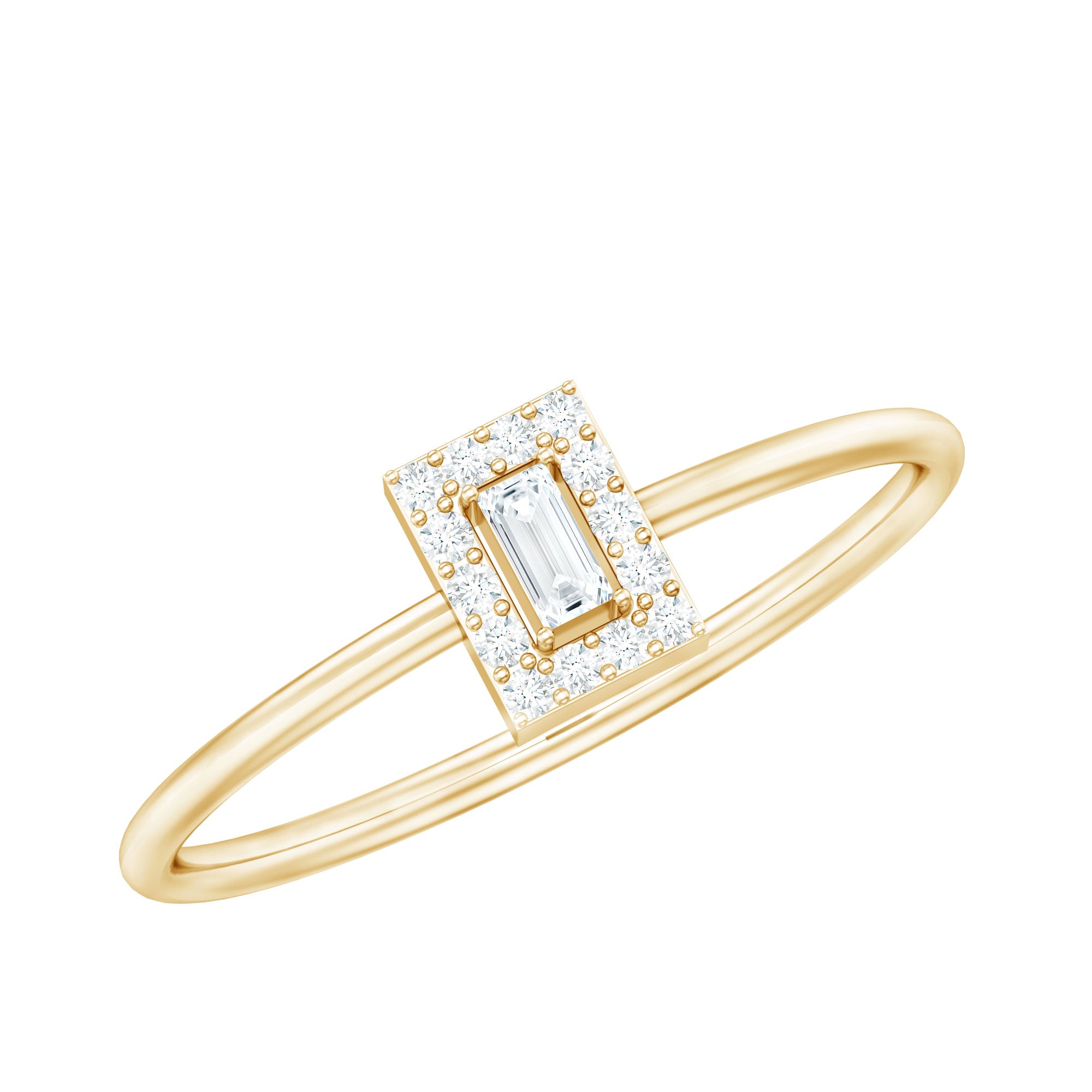 Signifying a devoted promise, this Natural Diamond Ring represents an unbreakable bond and reflects a unique style. This Promise Ring for Her is elegant and represents a meaningful symbol that elevates a relationship to a committed status. Show your devotion with this modern Baguette Shape Diamond set in the center in a prong setting with a halo of Round brilliant cut Diamonds. Sleek and sophisticated, this April Birthstone Ring is a piece she would adore on her finger. Adding a touch of elegance, this Pre Engagement Ring by brilliance signifies the couple’s commitment and serves as an outward reminder of true love and dedication.