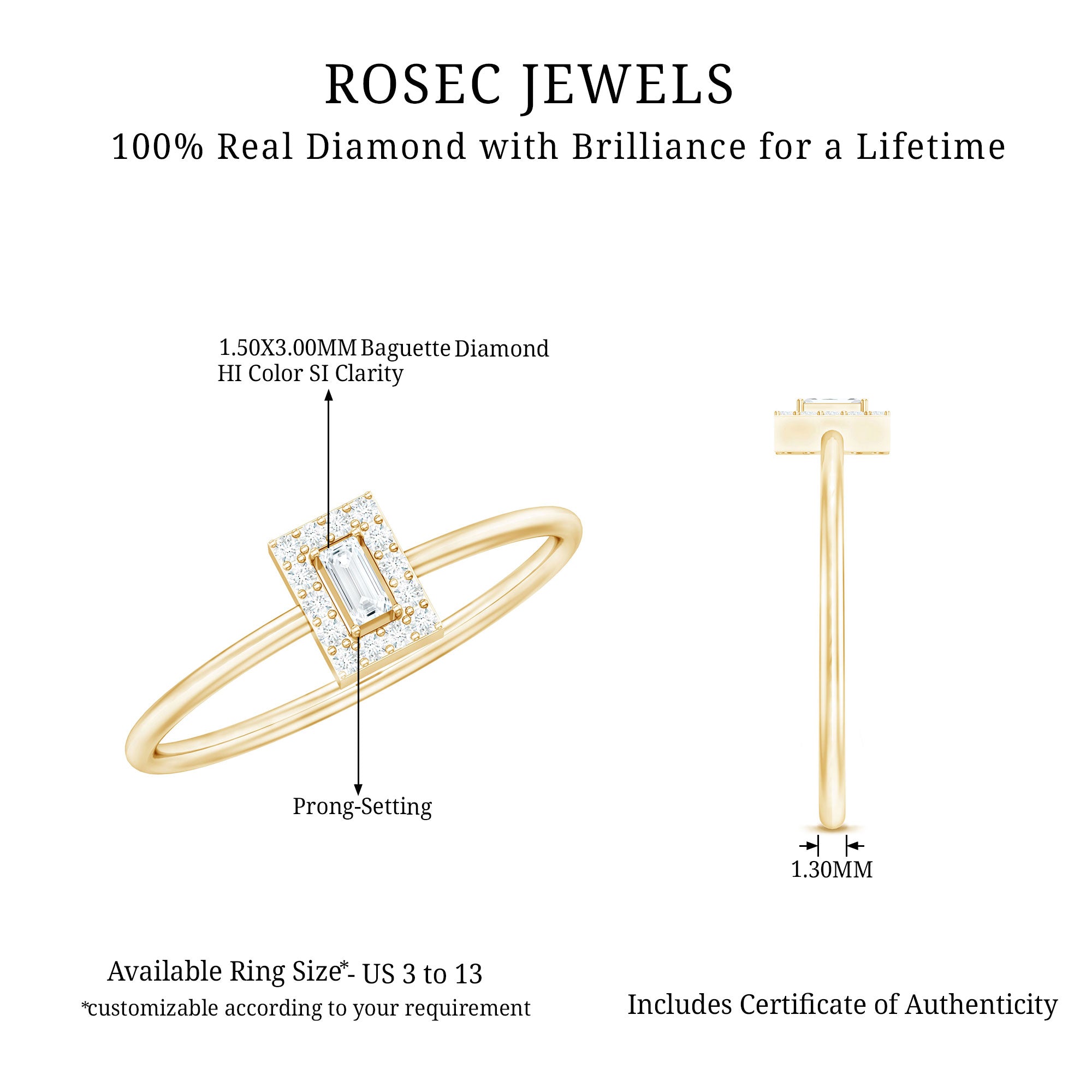Signifying a devoted promise, this Natural Diamond Ring represents an unbreakable bond and reflects a unique style. This Promise Ring for Her is elegant and represents a meaningful symbol that elevates a relationship to a committed status. Show your devotion with this modern Baguette Shape Diamond set in the center in a prong setting with a halo of Round brilliant cut Diamonds. Sleek and sophisticated, this April Birthstone Ring is a piece she would adore on her finger. Adding a touch of elegance, this Pre Engagement Ring by brilliance signifies the couple’s commitment and serves as an outward reminder of true love and dedication.