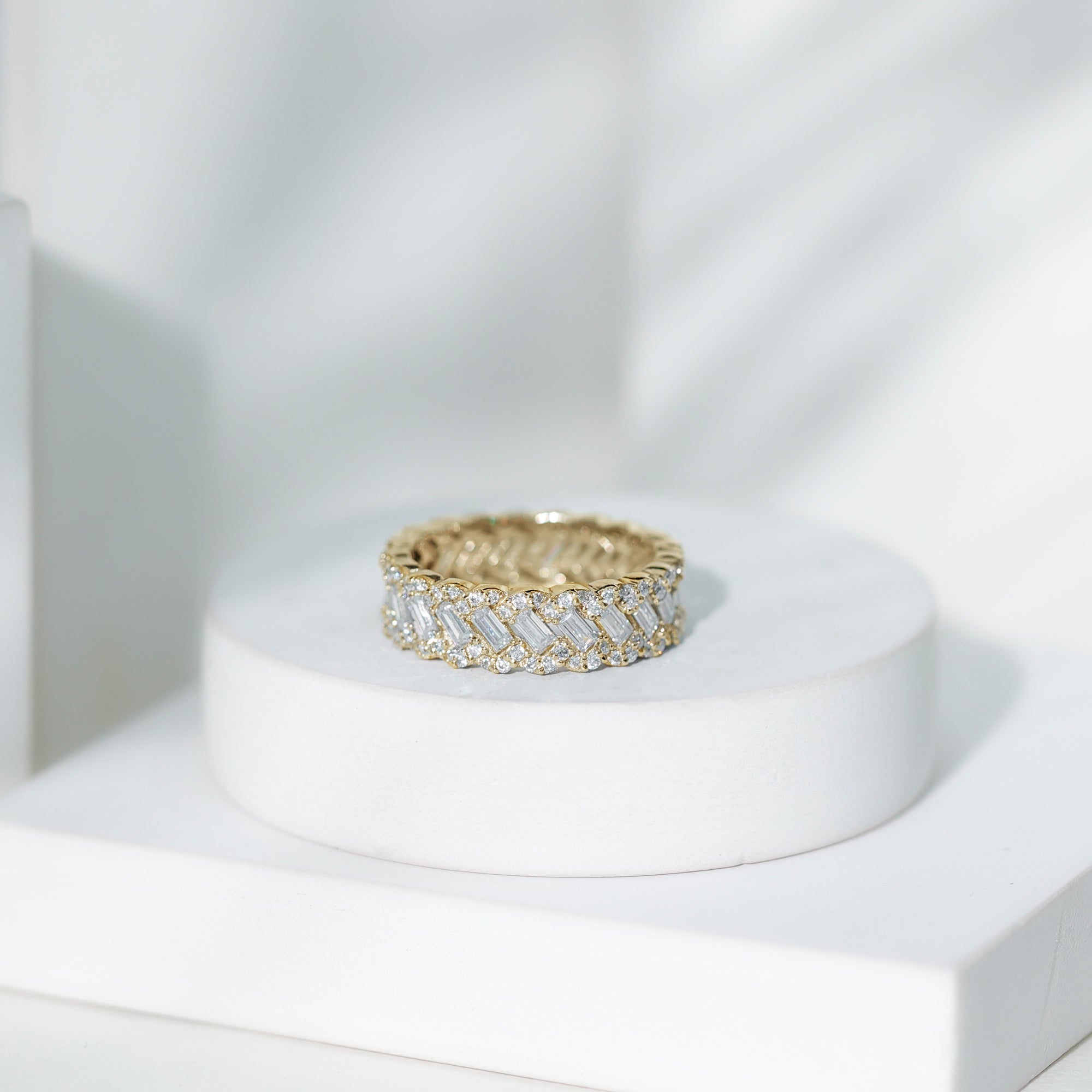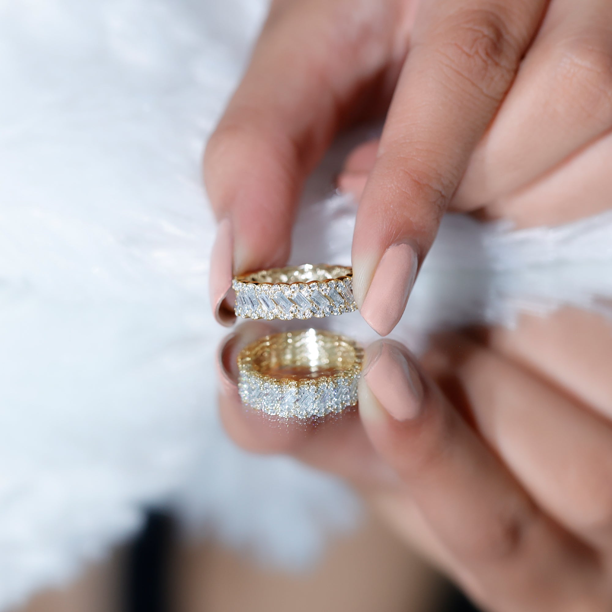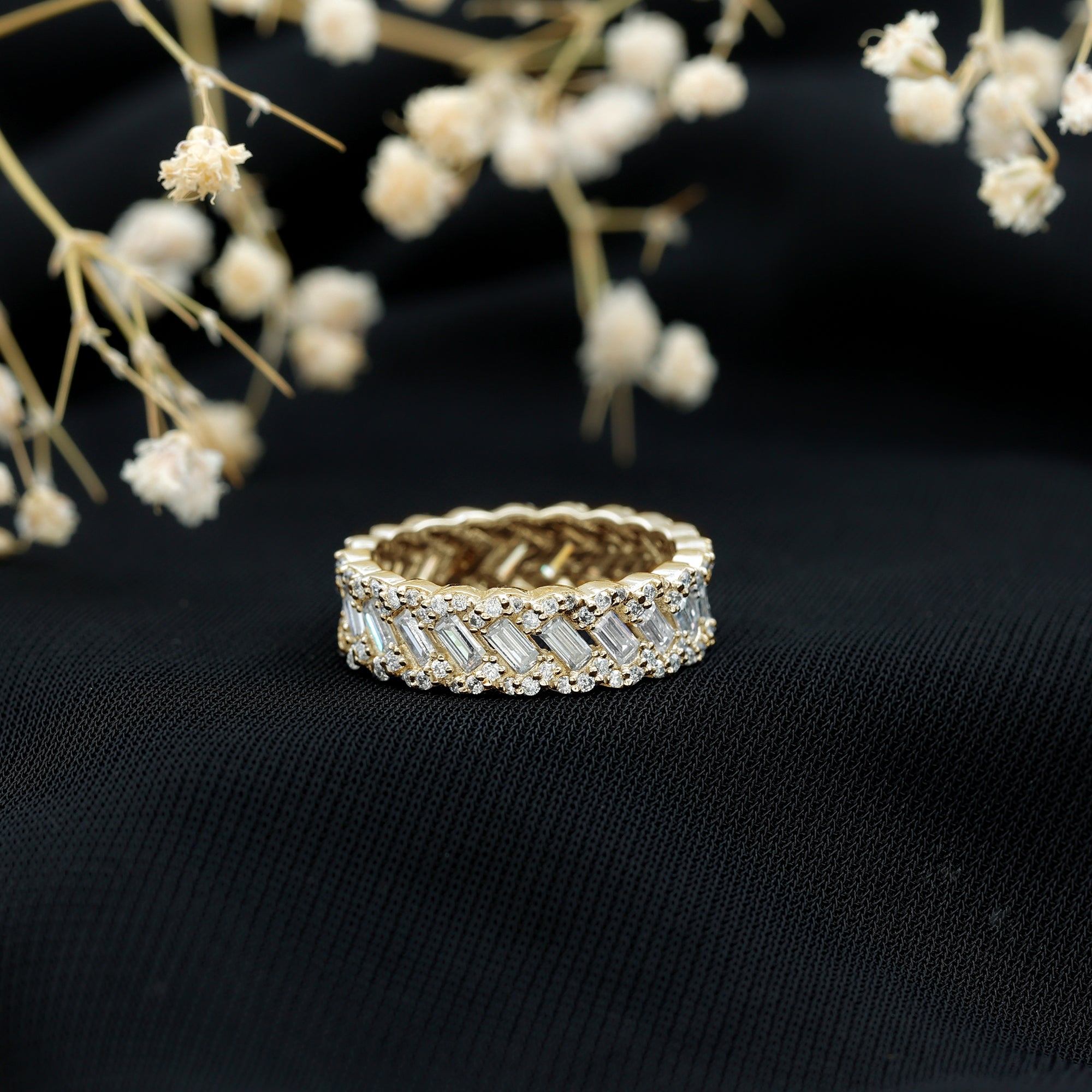 Shining with soft sparkle and graceful style, this Moissanite Eternity Ring brings a special touch to any meaningful moment. The Braided Band is beautifully designed with a mix of baguette and round cut moissanite stones, arranged in a pattern that gently twists around the finger. This braided-inspired look creates a smooth flow of light, making the Moissanite Wedding Band stand out without being too bold. Made as a full eternity band, the stones go all the way around, symbolizing a love that never ends. The Wedding Anniversary Band feels comfortable on the hand, making it perfect for everyday wear or for special occasions. Whether worn alone for a simple look or paired with other rings to create a layered style, it fits many tastes and outfits. You can choose from several metal colors and types to match your style, and the Wide Wedding Band is available in US sizes 3 to 13. This makes it easy to find the perfect fit for anyone. Its timeless design makes it a piece to treasure for years.