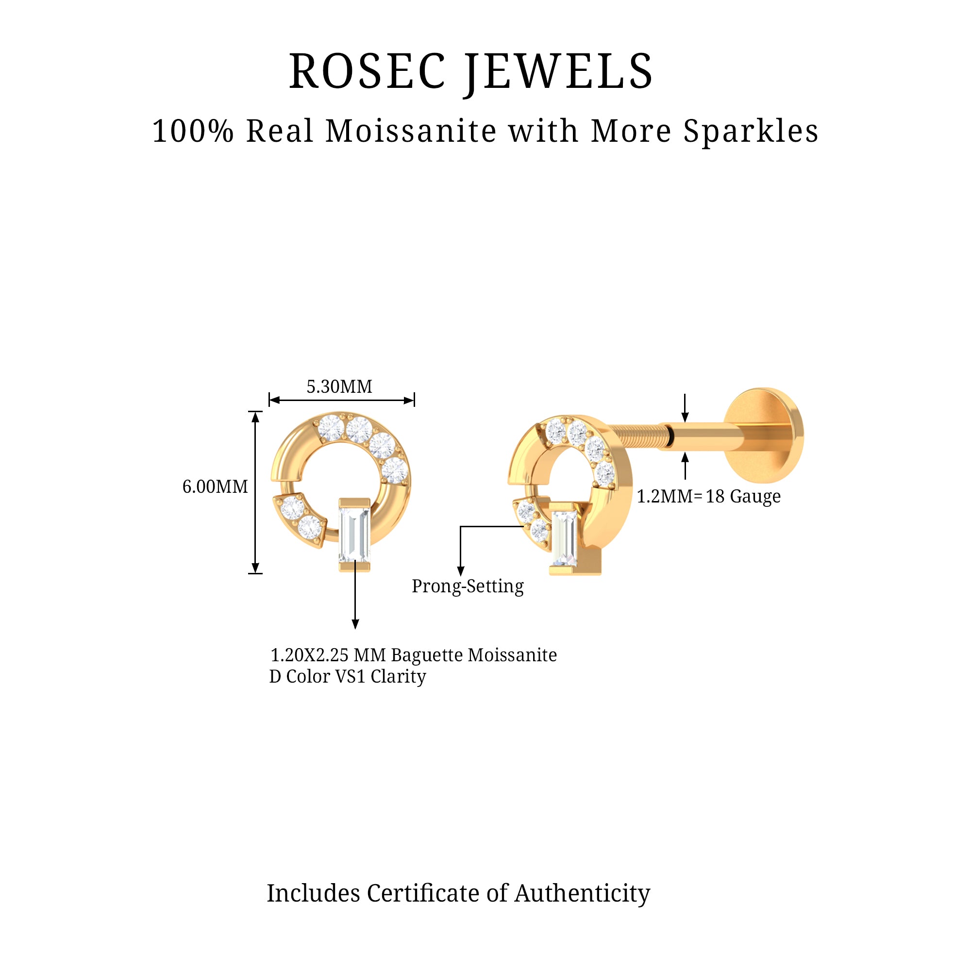 This Moissanite Open Circle Earring is adorned with Baguette Cut Moissanite in Bar Setting and Round Cut Moissanites over a circular Gold frame. This Minimalist Earring can be worn on multiple piercings such as Helix, Cartilage, Conch, or Upper Lobe, highlighting your unique style. Whether you present this Moissanite Earring as a priceless gift to your loved ones or wear it yourself to stand out from the crowd, it is sure to add a touch of elegance to any outfit.