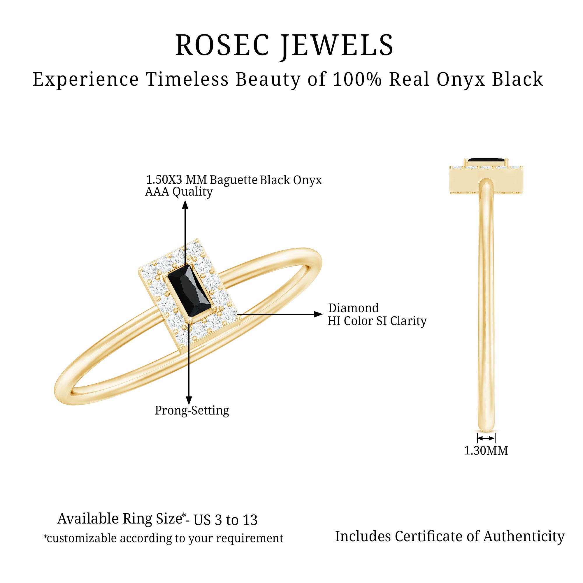 Designed to honor a heartfelt promise, this Black Onyx Promise Ring captures the meaning of loyalty, love, and connection in a refined and elegant way. At the center sits a baguette cut black onyx, securely held in prong setting. Framing the onyx is a delicate halo of round diamonds, carefully placed to add a soft, radiant glow. The contrast between the dark center and the sparkling white stones creates a classic look with modern charm. Whether you are marking a promise, celebrating a personal milestone, or simply looking for a ring with deeper meaning, this design speaks with quiet elegance. The minimalist profile makes this Dainty Promise Ring for Her easy to wear alone or pair with other pieces, while its thoughtful design ensures it stands out in its own subtle way. Made with AAA quality black onyx and HI-SI quality diamonds, every element is crafted with care and precision. Available in a wide range of sizes, this Onyx and Diamond Ring is easy to find just the right fit. The Baguette Cut Ring comes packaged in a beautiful jewelry box and includes a gemstone certificate for added peace of mind. Stylish and symbolic, this Halo Ring is a lasting reminder of a bond built on trust, love, and shared moments, perfect for gifting or keeping close to your heart.
