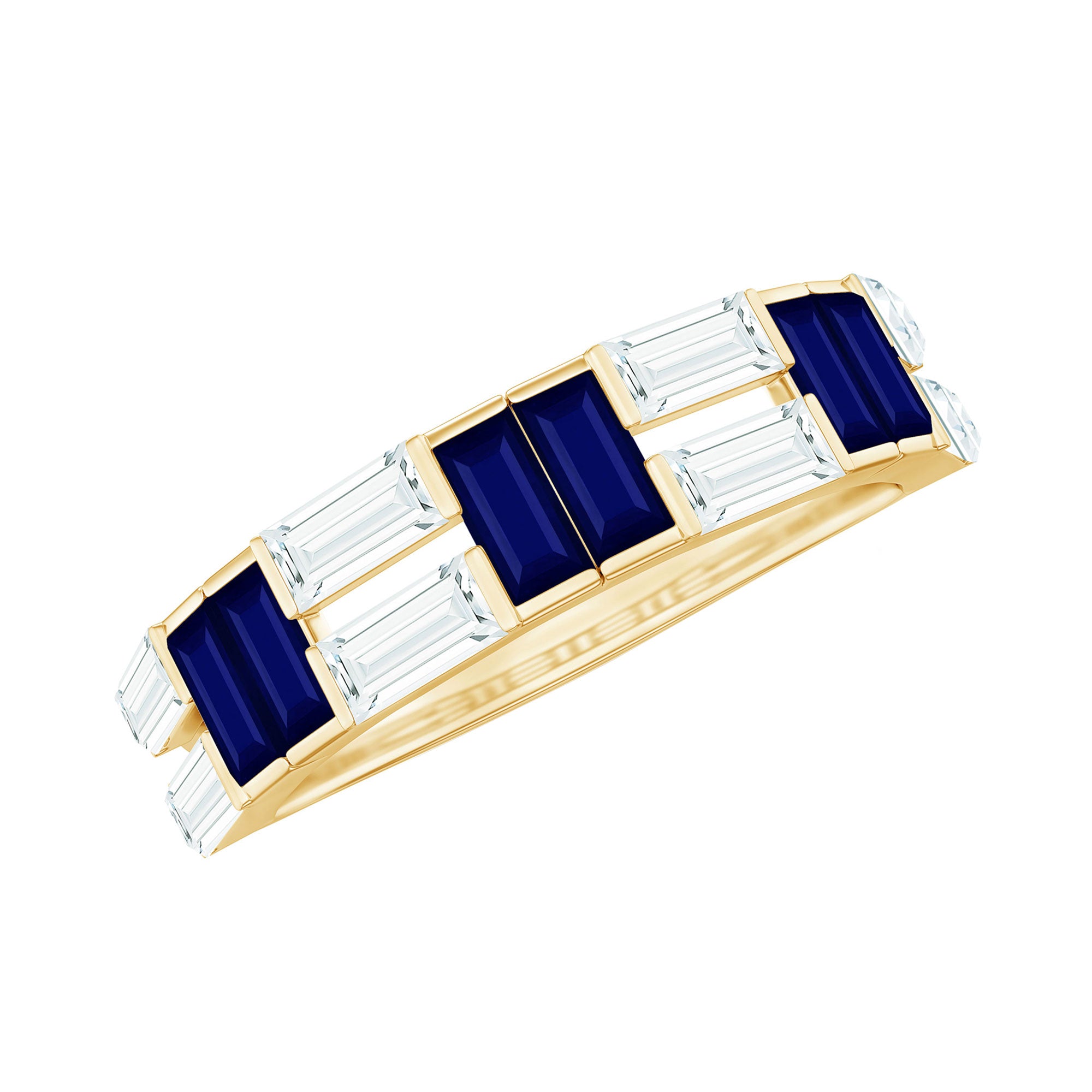 This Blue Sapphire Band Ring is a stunning gemstone jewelry. Adorned with Baguette Cut Blue Sapphire in Bar Setting and Moissanite on Half Eternity Band.
