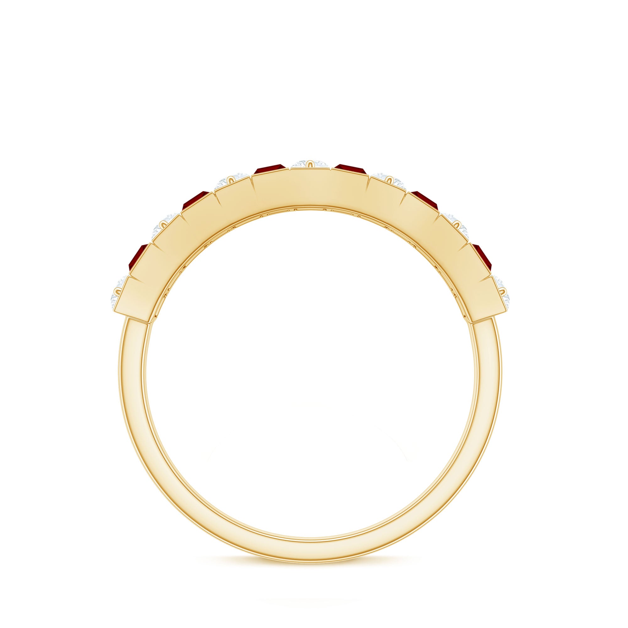 Make your Valentines Day special by gifting your loved one this beautiful Baguette Half Eternity Band Ring. This Semi Eternity Ring features a half band design, adorned with Baguette Shape Lab Created Rubies set in a bar setting and round Diamond set in a prong setting, all crafted in gold metal. This Created Ruby Half Eternity Band Ring is sure to delight your lady love.