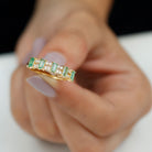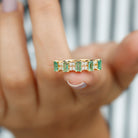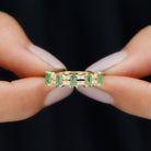 Grace your special moments with the timeless beauty of this Emerald and Diamond Eternity Band. Designed with a balance of elegance and charm, this Half Eternity Band features striking baguette cut emeralds set at even distances along the band. Between the emeralds, two fine rows of shimmering diamonds add a soft sparkle, enhancing the brilliance of the green gemstones. The combination of AAA quality emeralds and HI-SI quality diamonds gives the Emerald Wedding Band a refined yet modern appeal, making it a perfect choice for those who appreciate both classic and contemporary design. Thoughtfully crafted with precision and care, this Baguette Wedding Band is ideal for anniversaries, weddings, or meaningful celebrations. Its half eternity style allows for comfort while maintaining an elegant presence on the hand. The sleek band can be worn alone for a graceful statement or stacked with an engagement ring or other bands for a layered, sophisticated look. With its perfect blend of sparkle, color, and fine craftsmanship, this Emerald Stackable Ring will remain a treasured piece for years to come, bringing beauty and elegance to every occasion.