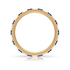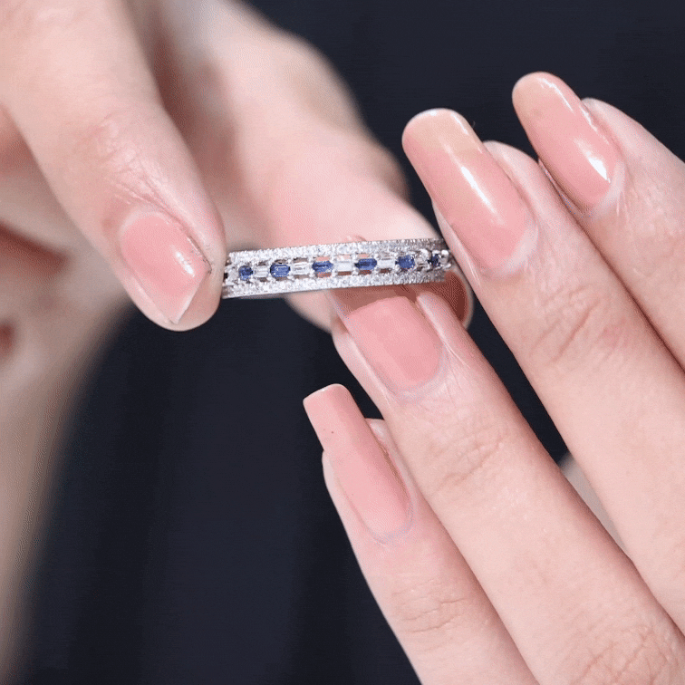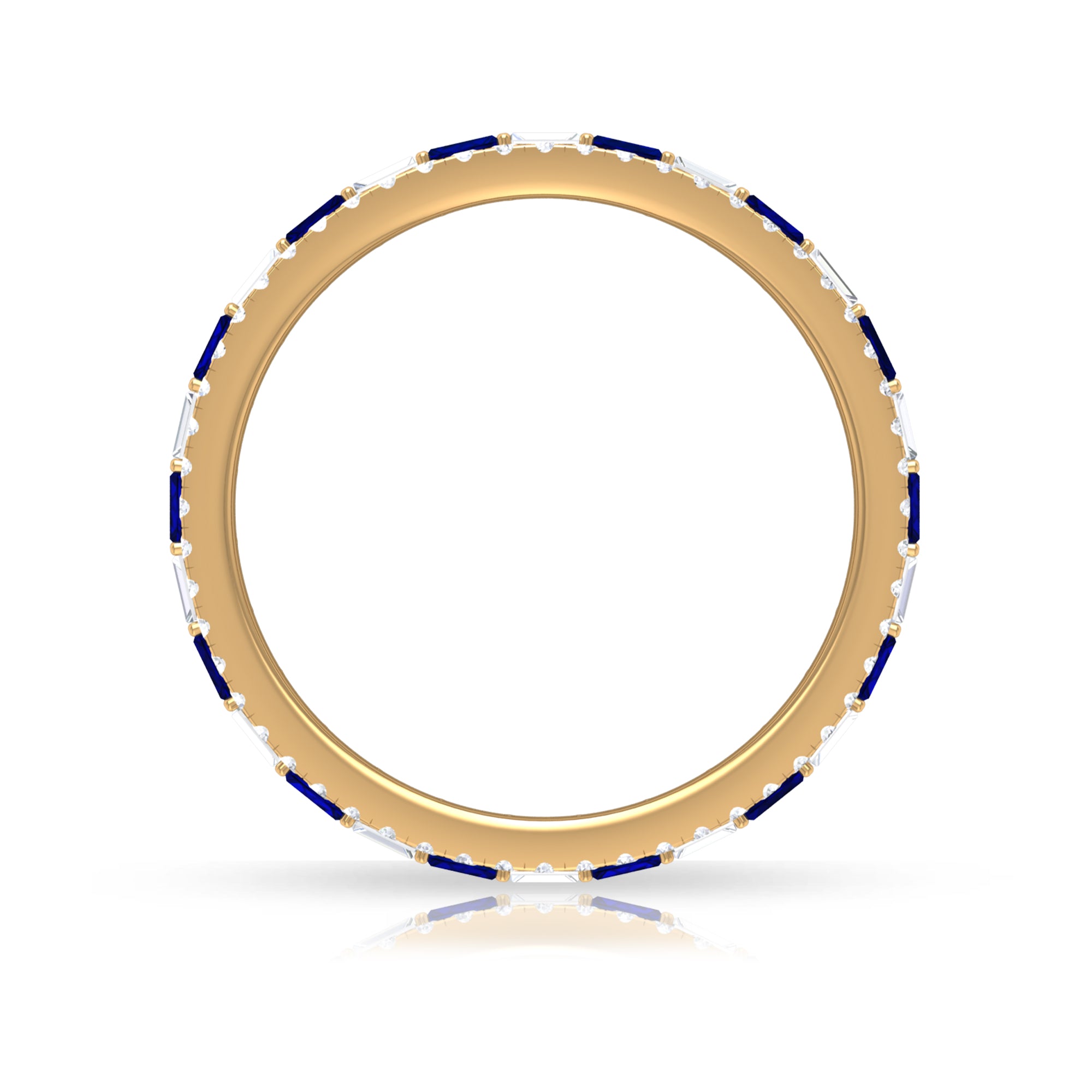 This exquisite wedding band ring features a captivating combination of Baguette Cut created blue sapphire and Baguette and Round Shape Moissanite stones, meticulously set alternately in a secure Prong Setting. This Eternity Band Ring is a stunning and sophisticated choice that will leave a lasting impression.