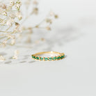 Whether you prefer a minimalistic approach to jewelry or are interested in a stackable ring option, this exquisite Emerald Half Eternity Ring is the perfect choice for you. The delicate design features beautiful baguette-cut lab created Emerald stones set in east west style and creating an elegant and sophisticated look. The shared prong setting adds to the charm of this Stackable Eternity Ring, ensuring that the created emeralds dazzle and catch the light from every angle. This Minimalist Band Ring exudes luxury and will surely enhance your style with its sparkling allure. The straightforward design makes it easy to wear daily, perfect for a wedding band, anniversary ring, or a thoughtful gift. This Baguette Cut Wedding Band strikes a balance between elegance and simplicity, providing a timeless look that complements other rings or shines on its own. Meticulously made with a focus on detail, the Emerald Stackable Ring merges artistry with contemporary craftsmanship.