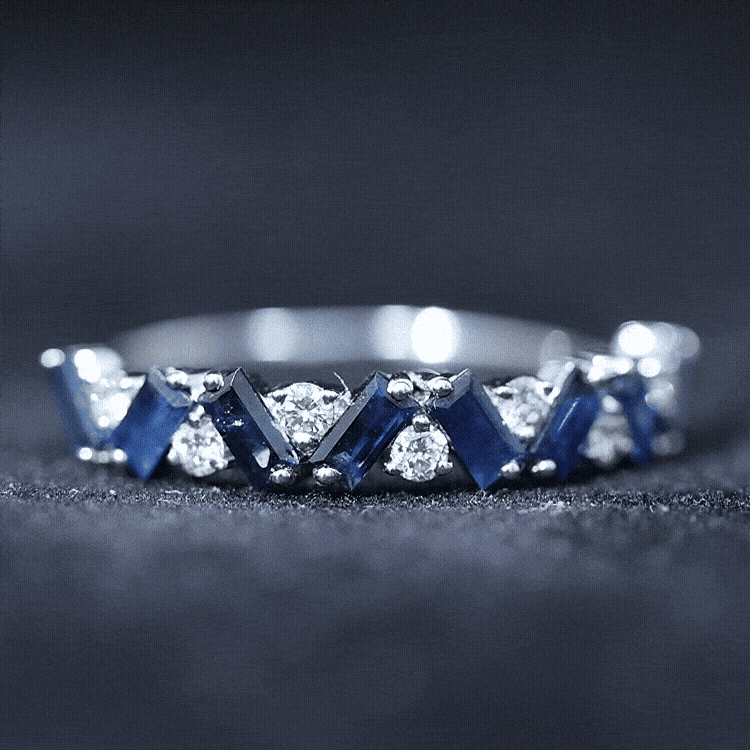 Turn heads while you flaunt this stunning Blue Sapphire Eternity Ring in your gorgeous hands. The Half Eternity Ring showcases Baguette Cut Blue Sapphire Gemstones and Round Cut moissanite stones set in a zig zag pattern in prong setting. Mesmerizing Solid Gold Build makes this Eternity Ring for Women a perfect gift for surprising your precious one on valentines day.
