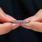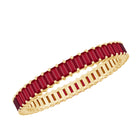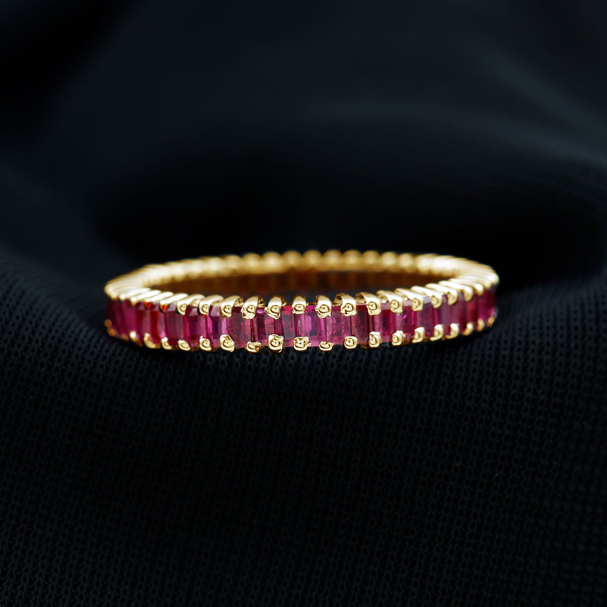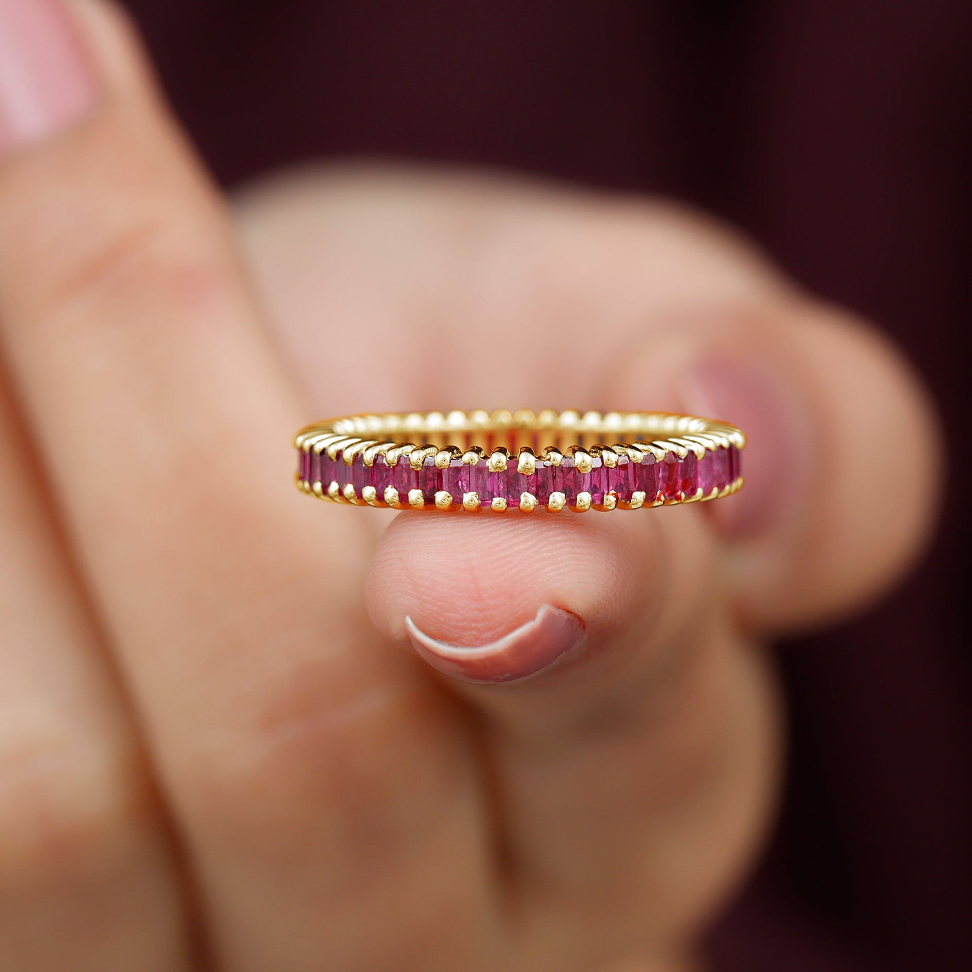 Elegantly designed for styling, this Eternity Ring is crafted with Baguette Cut Ruby Gemstone in Shared Prong Setting So grab it soon to gift it to your wife on your Anniversary so that she can complement her outfit with this Eternity Ring for an elegant look.