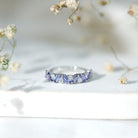 Add a touch of elegance to your jewelry collection with this stunning Tanzanite Eternity Ring. Designed to blend timeless beauty with modern charm, it is a perfect gift for anniversaries, engagements, weddings, or any special occasion. This beautiful Half Eternity Wedding Band features alternatingly set baguette cut tanzanites and round brilliant cut lab grown diamonds that sparkle brightly, creating a beautiful contrast. The stones are set carefully around half of the band to form a continuous line, symbolizing eternal love and connection. Made for everyday comfort and long-lasting wear, this Tanzanite Stackable Ring is handcrafted in 14k white gold plated silver. It also comes in multiple ring sizes, so you can find the perfect fit. To make your gift even more special, it comes in a premium jewelry box and includes a Certificate of Authenticity for the gemstones. Whether you are celebrating a relationship milestone or just treating yourself, this Tanzanite and Diamond Ring is a meaningful and eye-catching piece that you will treasure for years to come.