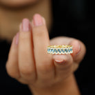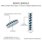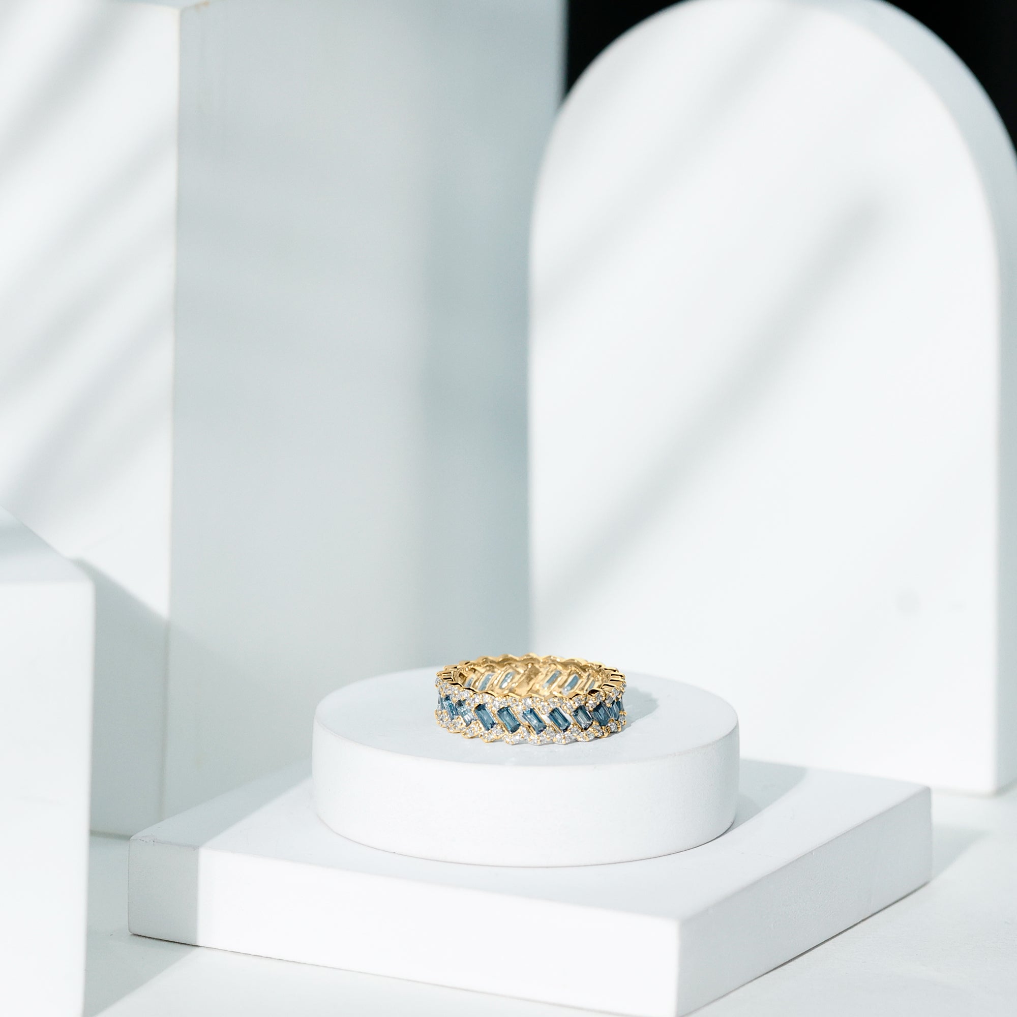 Present this stunning Blue Topaz Eternity Ring to the one you cherish, elegantly expressing your love and devotion. This ring features AAA quality Baguette-cut London Blue Topaz alongside Hi-Si quality round Diamonds, artfully arranged in a design where the Blue Topaz forms the central trail, complemented by a parallel trail of Diamonds. This Full Eternity Ring is an ideal choice for your beloved, as Blue Topaz symbolizes affection, tenderness, loyalty, and righteousness. Our exquisite Topaz and Diamond Eternity Ring is packaged in a box, allowing for safe storage when not being worn. Make a striking yet sophisticated impression with this captivating Topaz Wedding Band. It can be effortlessly worn alone or combined with other rings for a layered appearance. Offered in a range of metal colors, types, and US ring sizes from 3 to 13, this Baguette Wedding Band can be customized to perfectly align with your style and comfort. Timeless in its design and meticulously crafted, this Designer Eternity Band serves as a sparkling symbol of love, strength, and commitment.