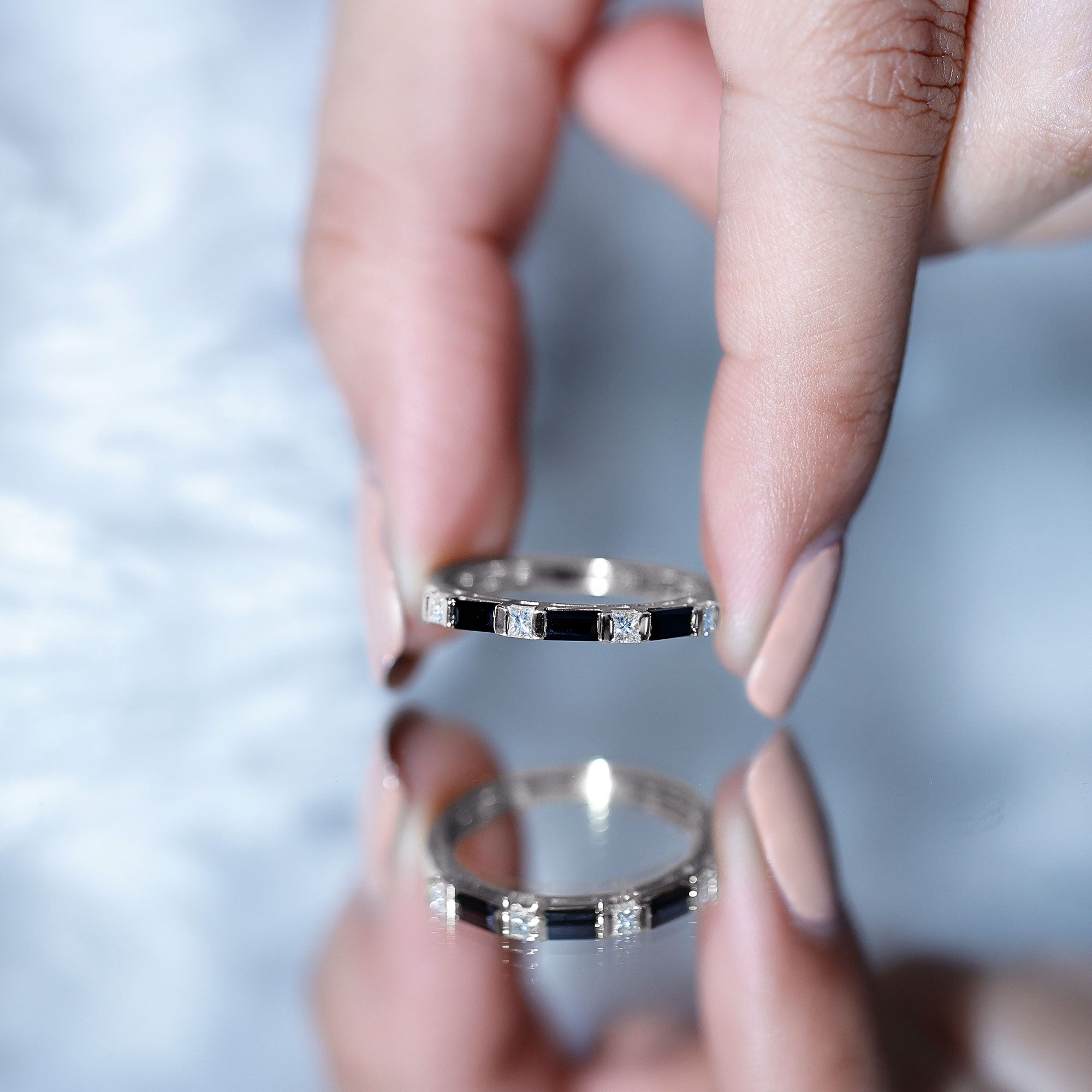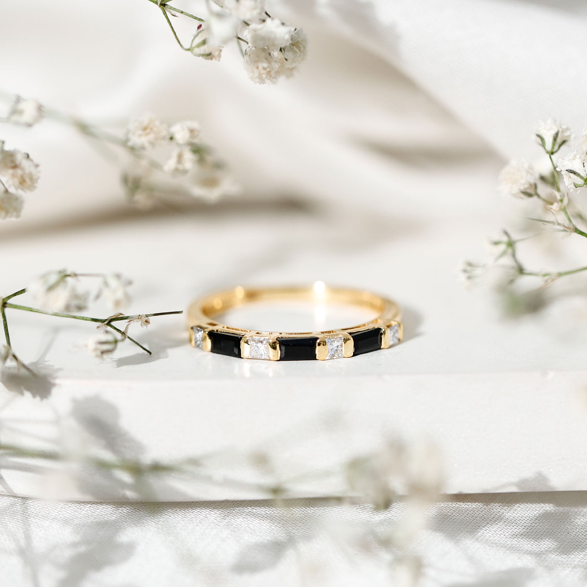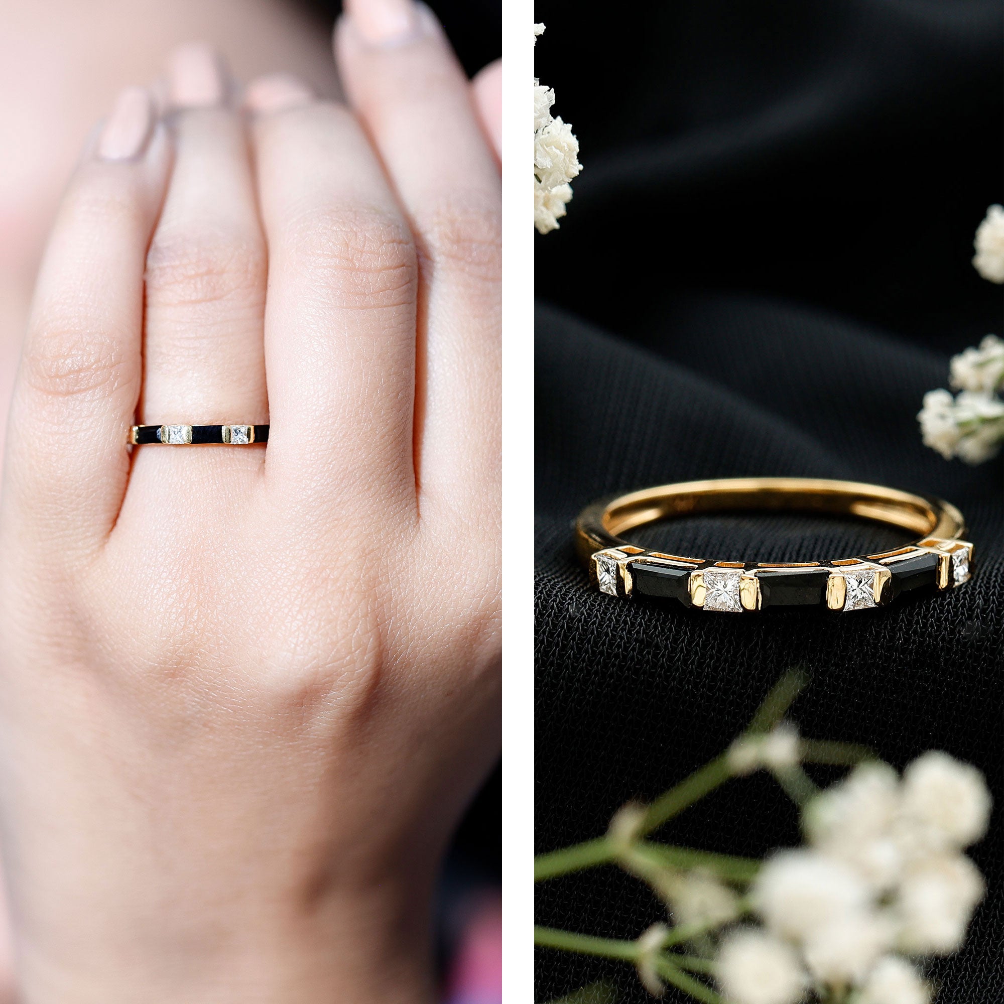 Give her something that speaks of style and sentiment. Designed for moments that matter, or simply to show you care, this Black Onyx Eternity Ring brings a refined touch to any jewelry collection. The design features baguette cut black onyx stones and princess cut real diamonds, creating a beautiful contrast of dark and light. The alternating pattern adds visual interest and a modern feel, while the secure bar setting keeps each stone in place for lasting wear. Perfect for stacking or wearing alone, the half eternity layout offers a graceful look that is both eye-catching and timeless. Whether she prefers a minimalist style or loves to mix and match, this Half Eternity Wedding Band adapts easily to her personal taste. Crafted with attention to detail using AAA quality black onyx and HI-SI quality diamonds, it is made to last and feel comfortable throughout the day. Available in US sizes 3 to 13, finding the right fit is simple. This Onyx and Diamond Wedding Band arrives in an elegant jewelry box, making it a thoughtful gift that is ready to give for birthdays, anniversaries, or just because.