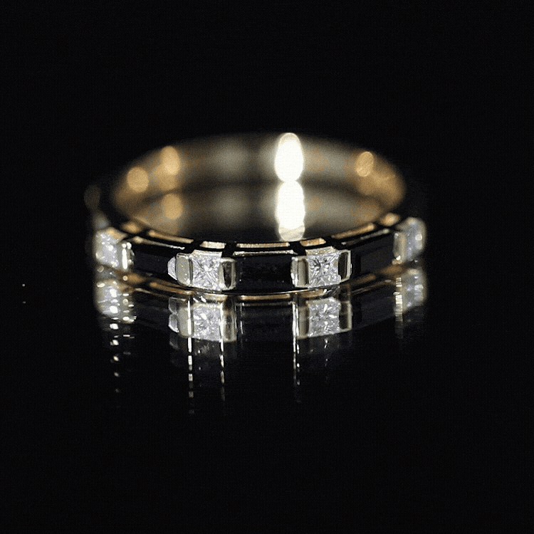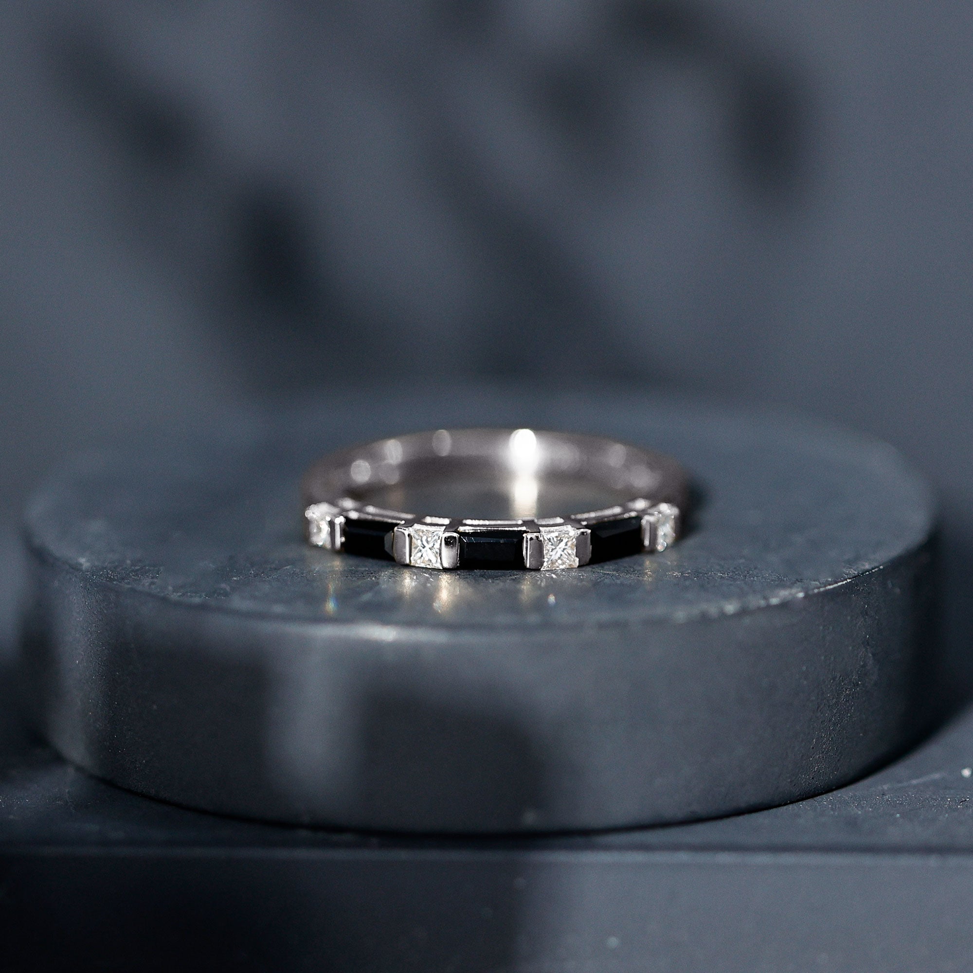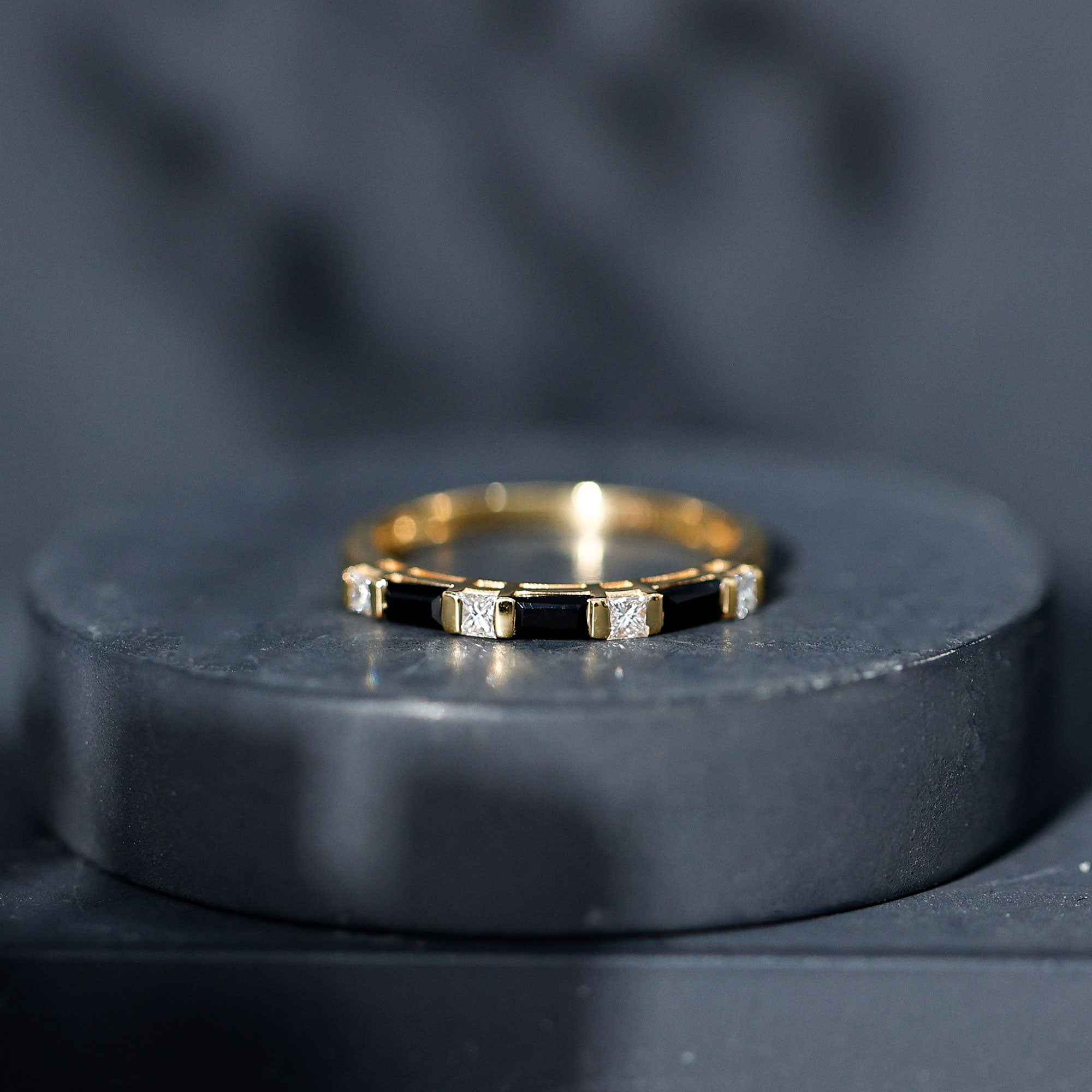 Give her something that speaks of style and sentiment. Designed for moments that matter, or simply to show you care, this Black Onyx Eternity Ring brings a refined touch to any jewelry collection. The design features baguette cut black onyx stones and princess cut real diamonds, creating a beautiful contrast of dark and light. The alternating pattern adds visual interest and a modern feel, while the secure bar setting keeps each stone in place for lasting wear. Perfect for stacking or wearing alone, the half eternity layout offers a graceful look that is both eye-catching and timeless. Whether she prefers a minimalist style or loves to mix and match, this Half Eternity Wedding Band adapts easily to her personal taste. Crafted with attention to detail using AAA quality black onyx and HI-SI quality diamonds, it is made to last and feel comfortable throughout the day. Available in US sizes 3 to 13, finding the right fit is simple. This Onyx and Diamond Wedding Band arrives in an elegant jewelry box, making it a thoughtful gift that is ready to give for birthdays, anniversaries, or just because.