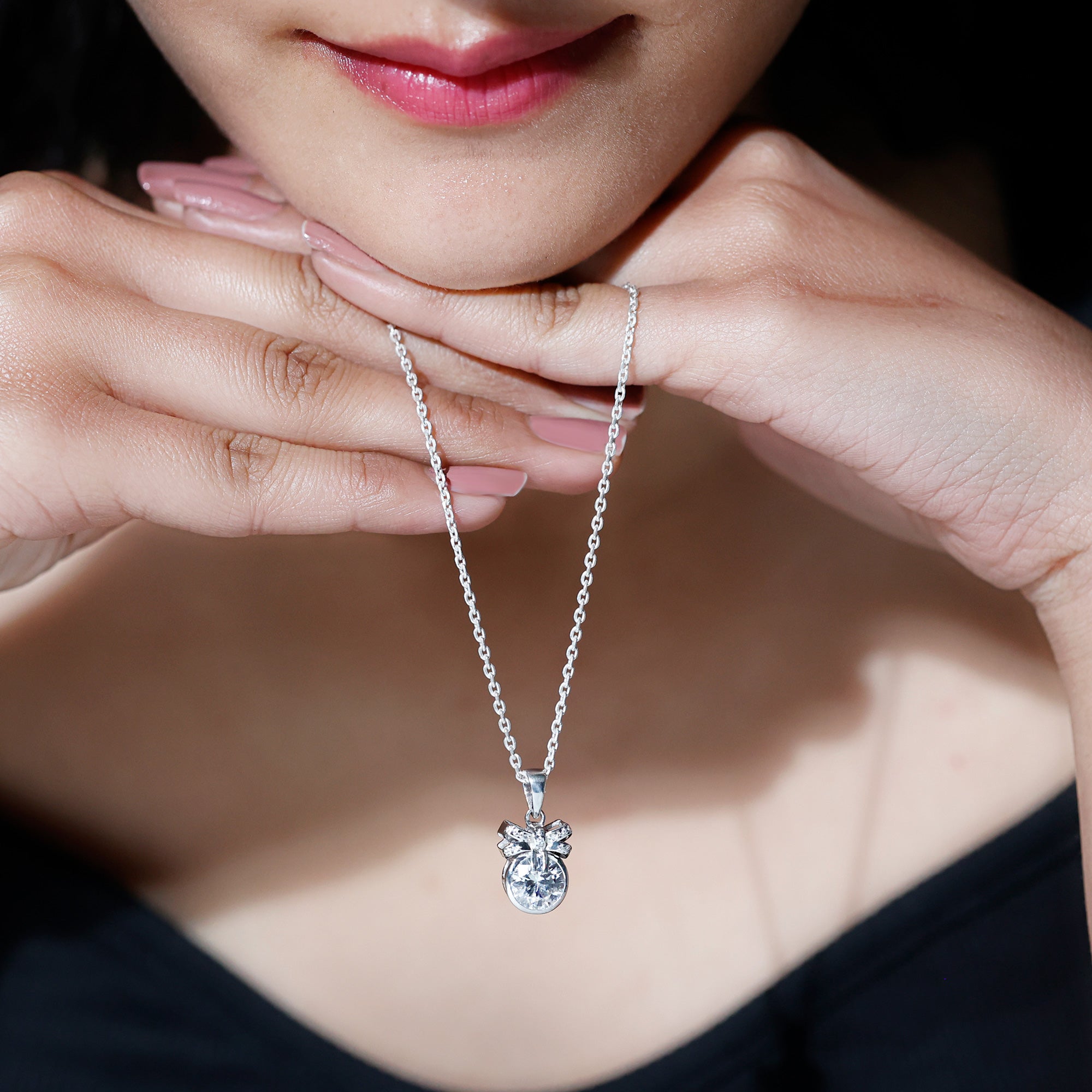 Adorn your neckline with this Moissanite Pendant Necklace, crafted with 14K White Gold Plated Silver. The pendant features an 8 MM Round Shape Moissanite securely placed in Bezel Setting and topped with a bow motif studded with smaller Moissanite. This Round Pendant beholds the classic shine of D-VS1 Quality Moissanite that is perfect to complete the look for the special day. This Chain and Pendant can be presented to your beloved on a special occasion, such as an anniversary or birthday.