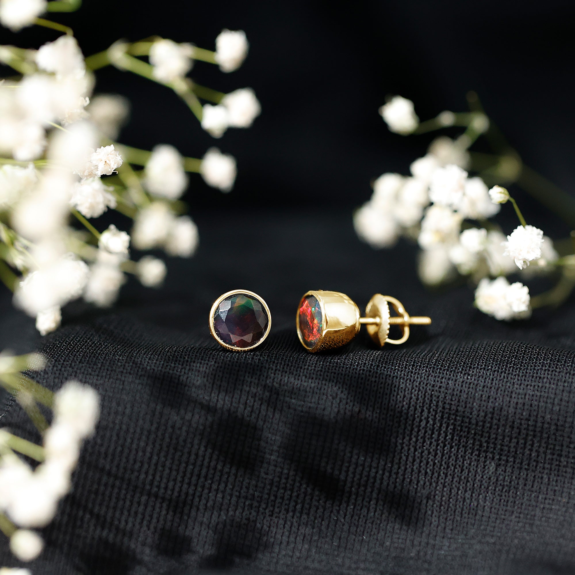 Simply stunning, these Black Opal Stud Earrings are a perfect blend of elegance and everyday wearability. Each earring features a 6 mm Round Shape Black Opal set in Bezel Setting that shimmers with deep colors, giving the stones a magical glow. Their classic stud design keeps the focus on the natural beauty of AAA Quality Black Opal, making them versatile enough to wear with anything, from casual outfits to evening dresses. The secure Screw Back Closure ensures they stay comfortably in place all day, so you can wear them confidently without worry. Thoughtfully packaged in a signature jewelry box and ready to gift, these October Birthstone Earrings make a meaningful present for birthdays, anniversaries, holidays or simply to celebrate a special moment. Minimalistic yet striking, these Black Opal Earrings are perfect for women who love jewelry that feels personal and timeless. Whether she is adding a subtle sparkle to her daily look or accessorizing for a night out, these Black Opal Studs bring a touch of color, sophistication and magic to every ensemble.