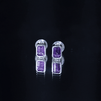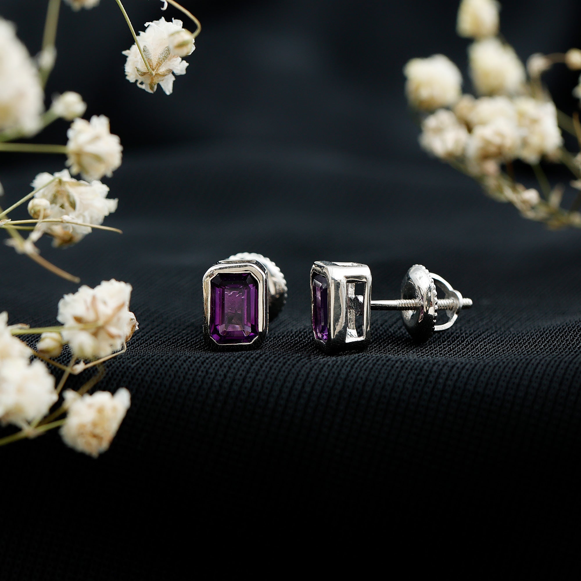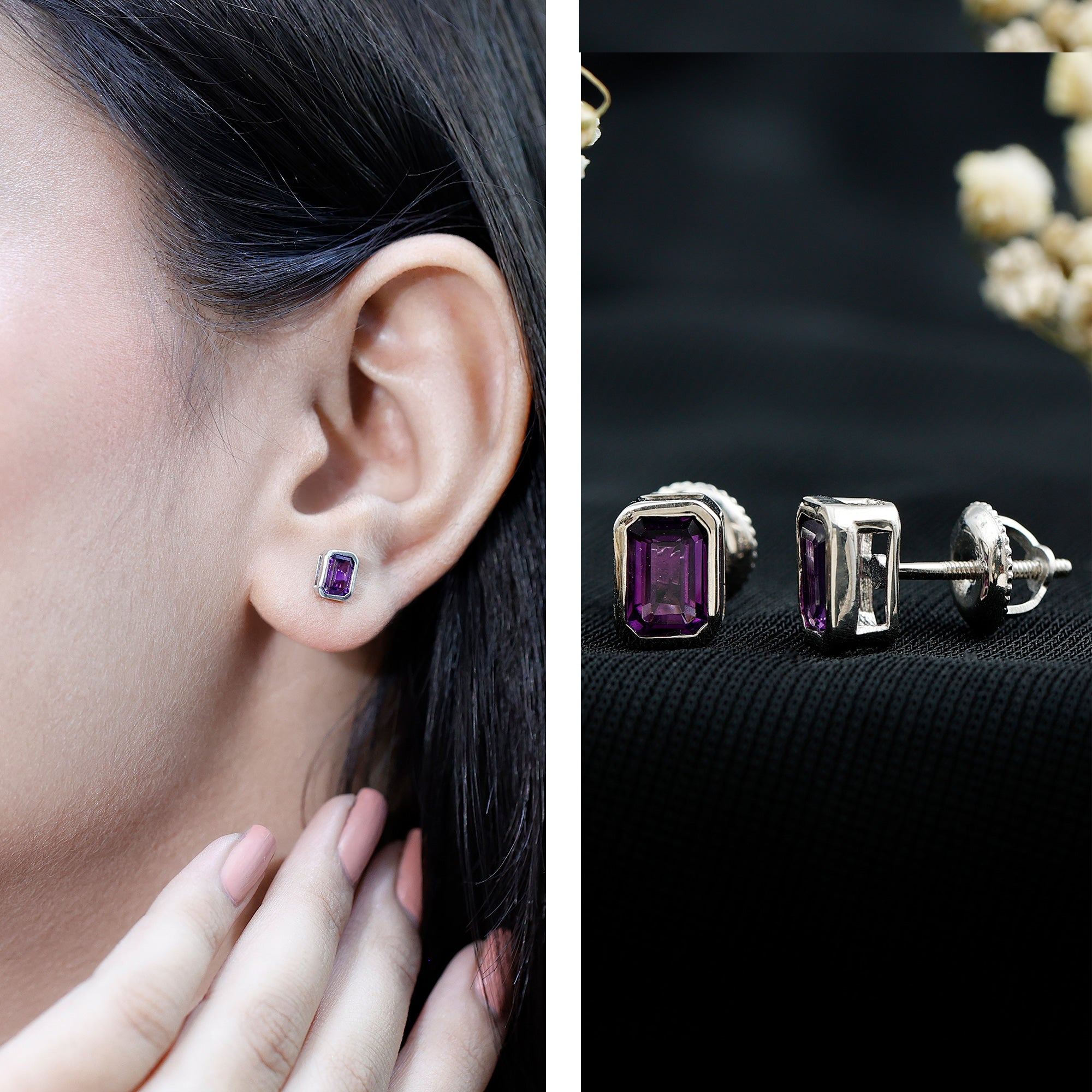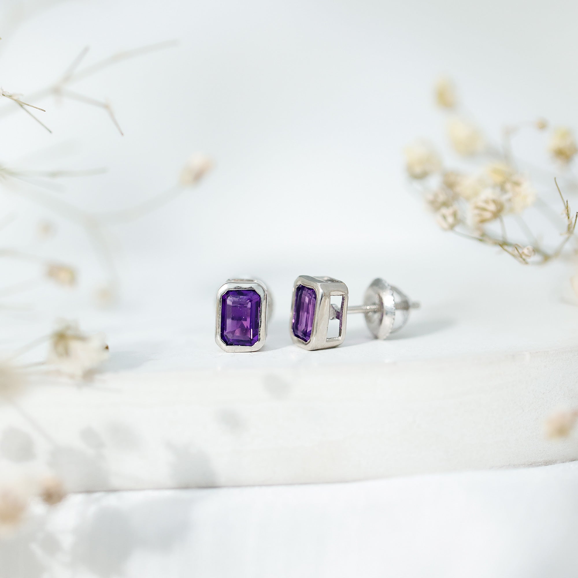 Timeless, bold, and full of color - these Amethyst Stud Earrings are designed to bring refined elegance and personal meaning to your jewelry collection. Featuring 4X6 MM emerald cut Amethyst gemstones held by bezel setting, which surrounds each stone in a sleek frame, providing both a modern finish and secure look, ideal for everyday wear. Set in 14K white gold plated silver, the violet hue of the Amethyst gleams with regal richness and sophisticated charm. The Solitaire Stud Earrings are fitted with screw back closures, offering added safety and comfort, ensuring they stay perfectly in place no matter the occasion. Amethyst, the birthstone of February, is known for symbolizing clarity, peace, and protection. It is also a thoughtful gift for wedding anniversaries or any milestone where sentiment meets style. Whether you are looking for a meaningful birthday gift, a chic pop of color for your formalwear, or a minimalist piece to wear daily, these February Birthstone Earrings fit effortlessly into every moment. Their rich color and handcrafted quality make these Amethyst Earrings a timeless choice, perfect for birthdays, graduations, Valentines Day, or simply treating yourself to something beautiful. With their combination of strength, symbolism, and elegance, these earrings are more than accessories, they are keepsakes to treasure for years to come.