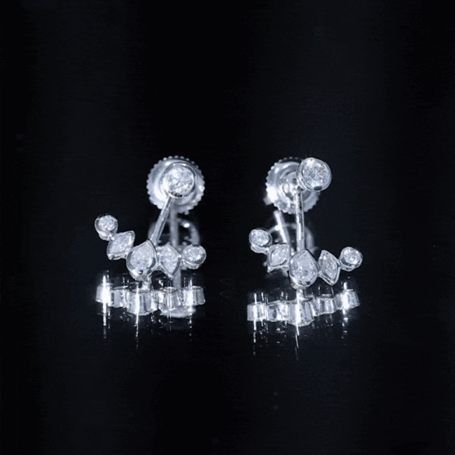 These earrings combine a structured setting style with a layered ear jacket silhouette, creating a look that feels contemporary yet balanced. The design allows the sparkle of the stones to remain the focal point while the surrounding metalwork provides a clean and defined frame.