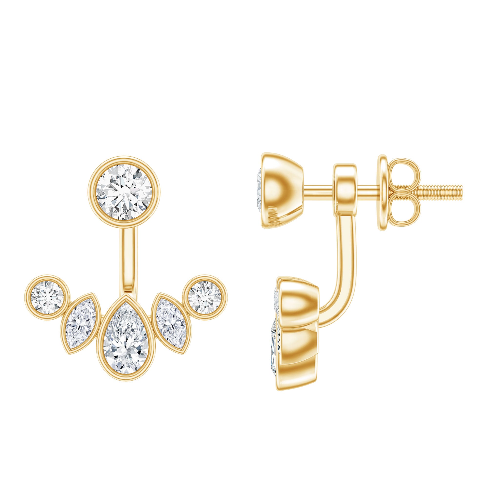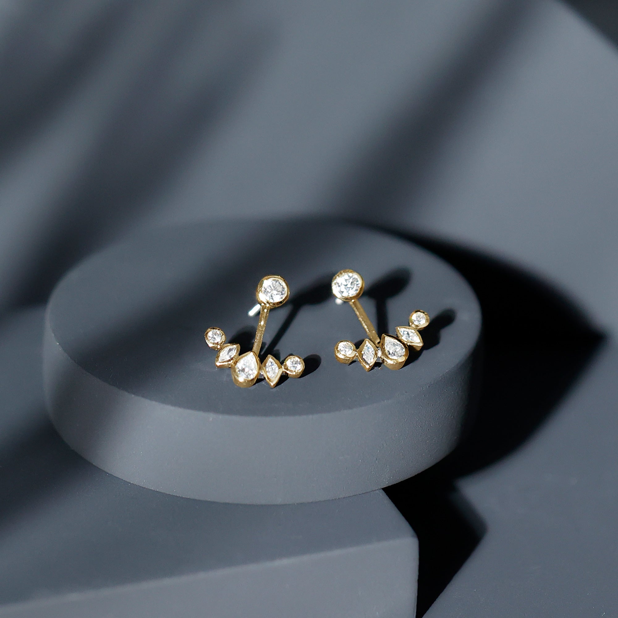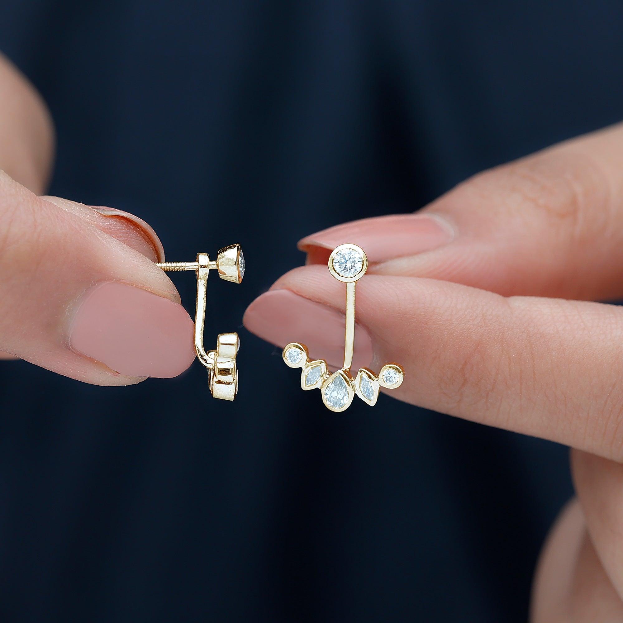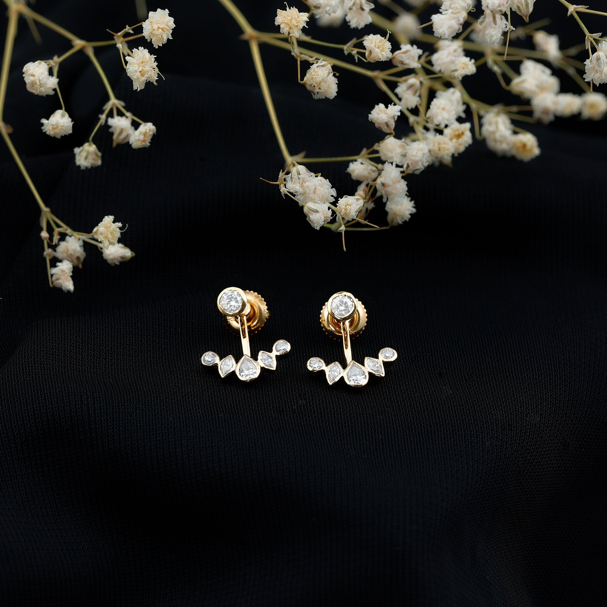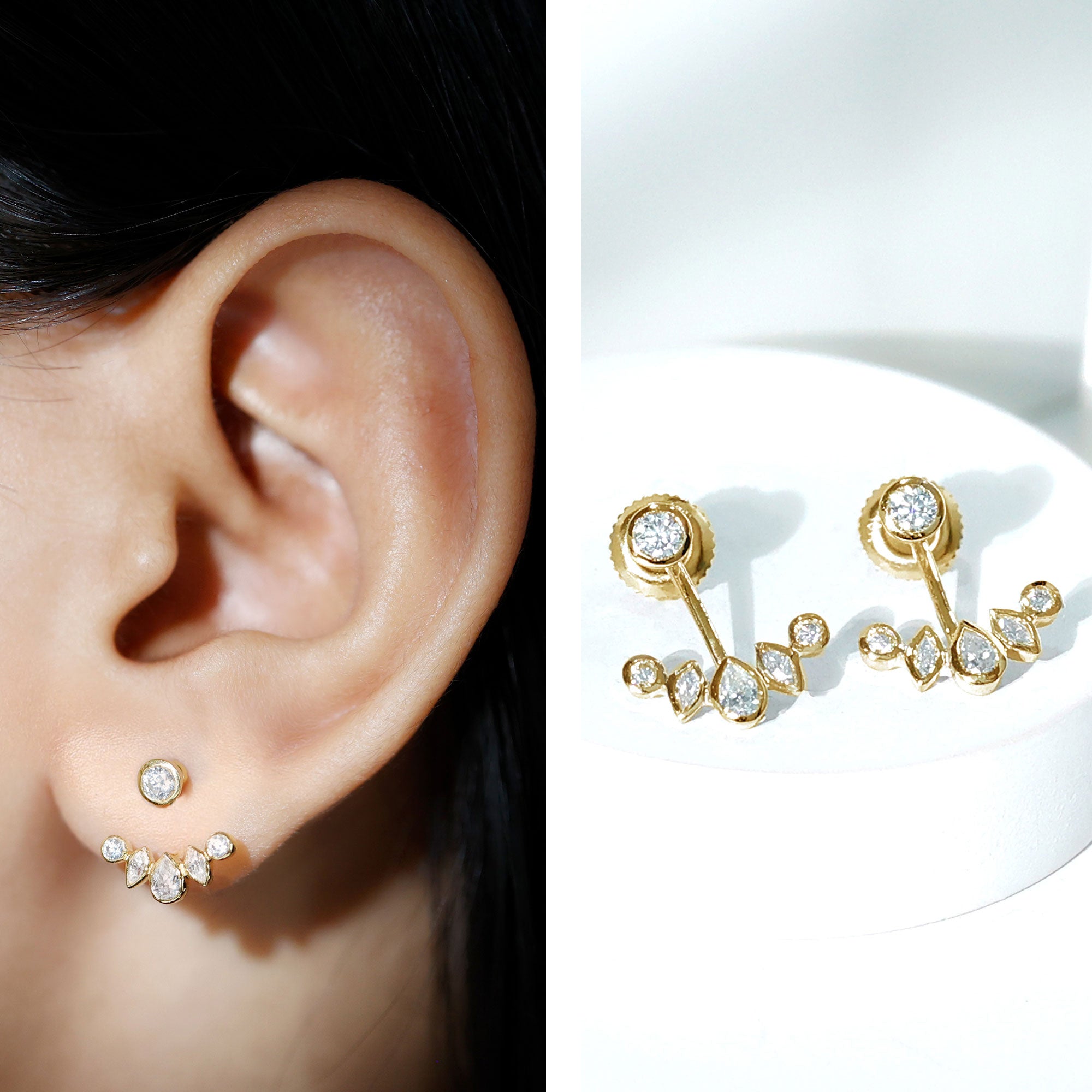 Ear jacket earrings are designed to create dimension by combining two coordinated elements: a front-facing stud and a decorative jacket that sits behind the earlobe. This arrangement allows the design to appear layered while remaining comfortable and secure when worn.