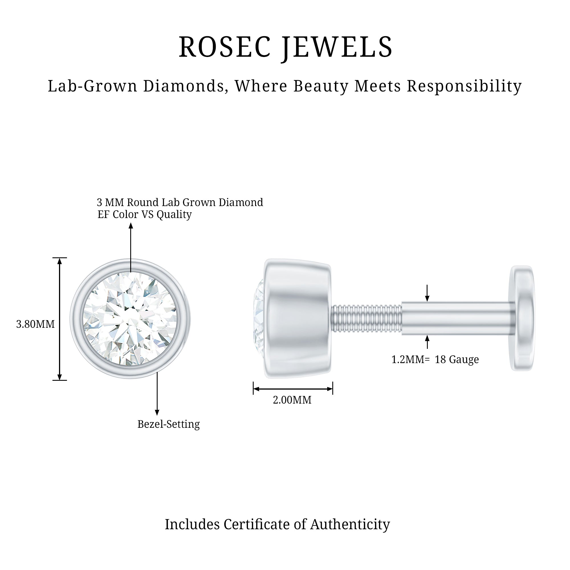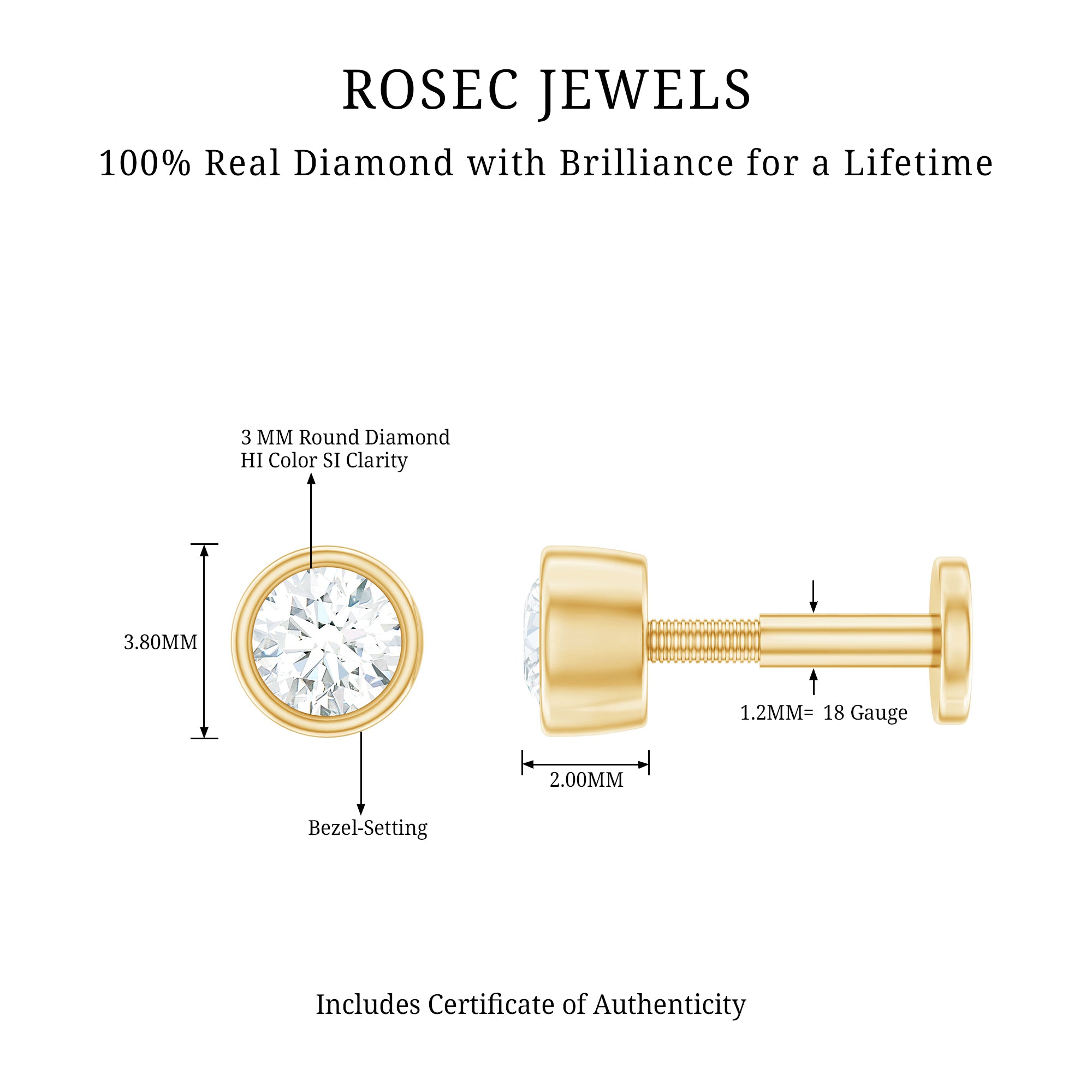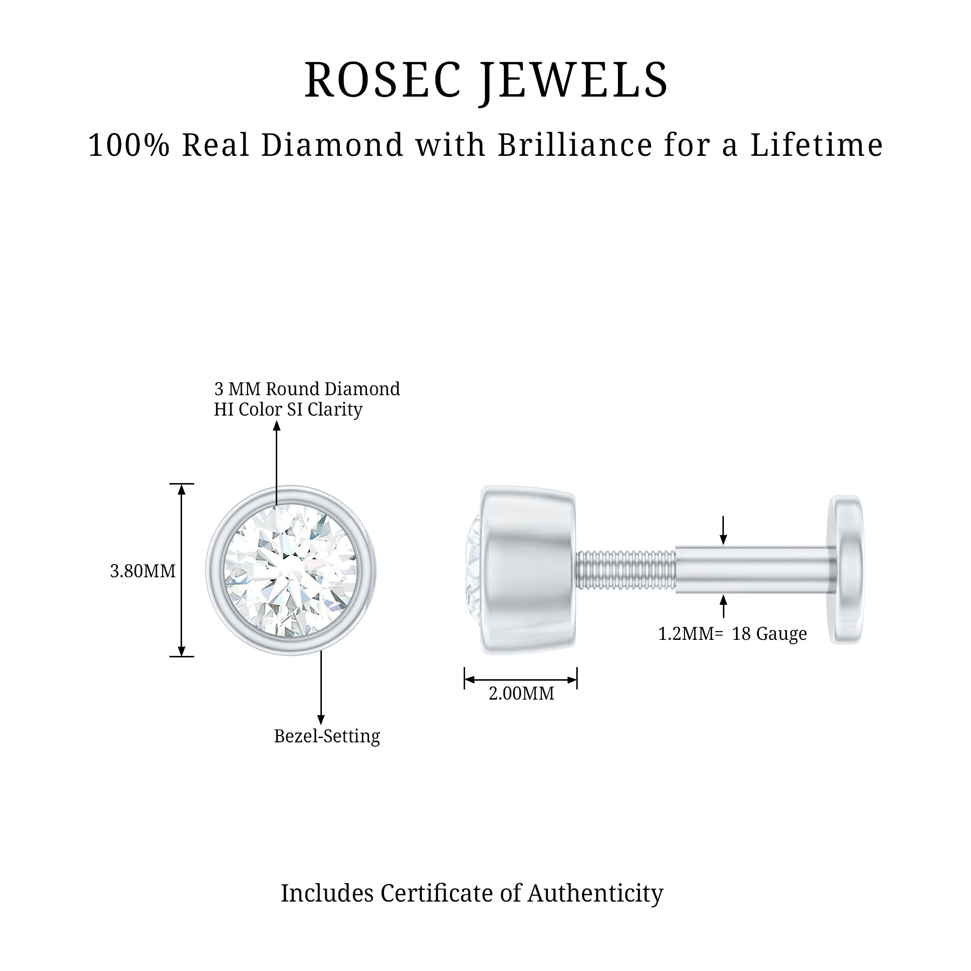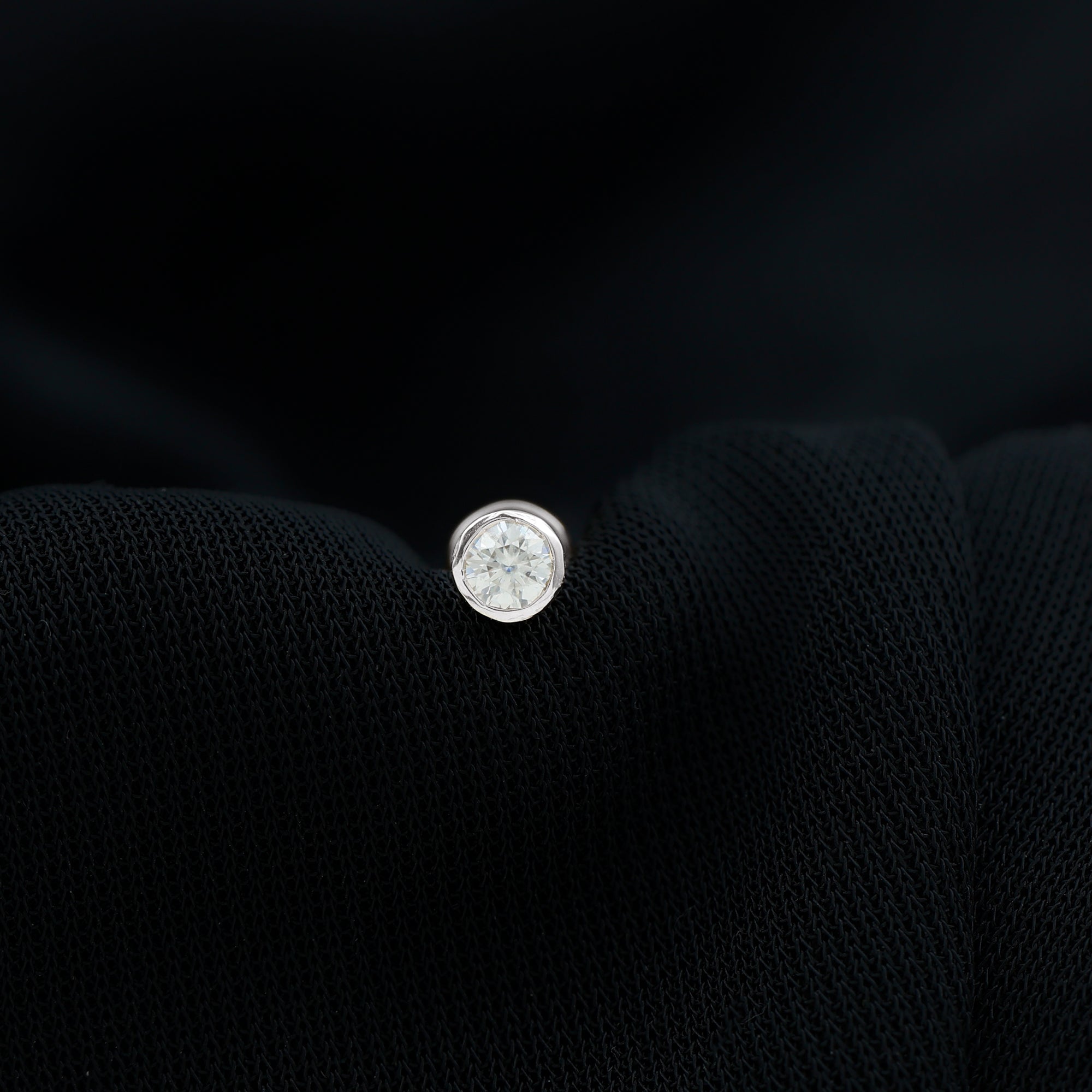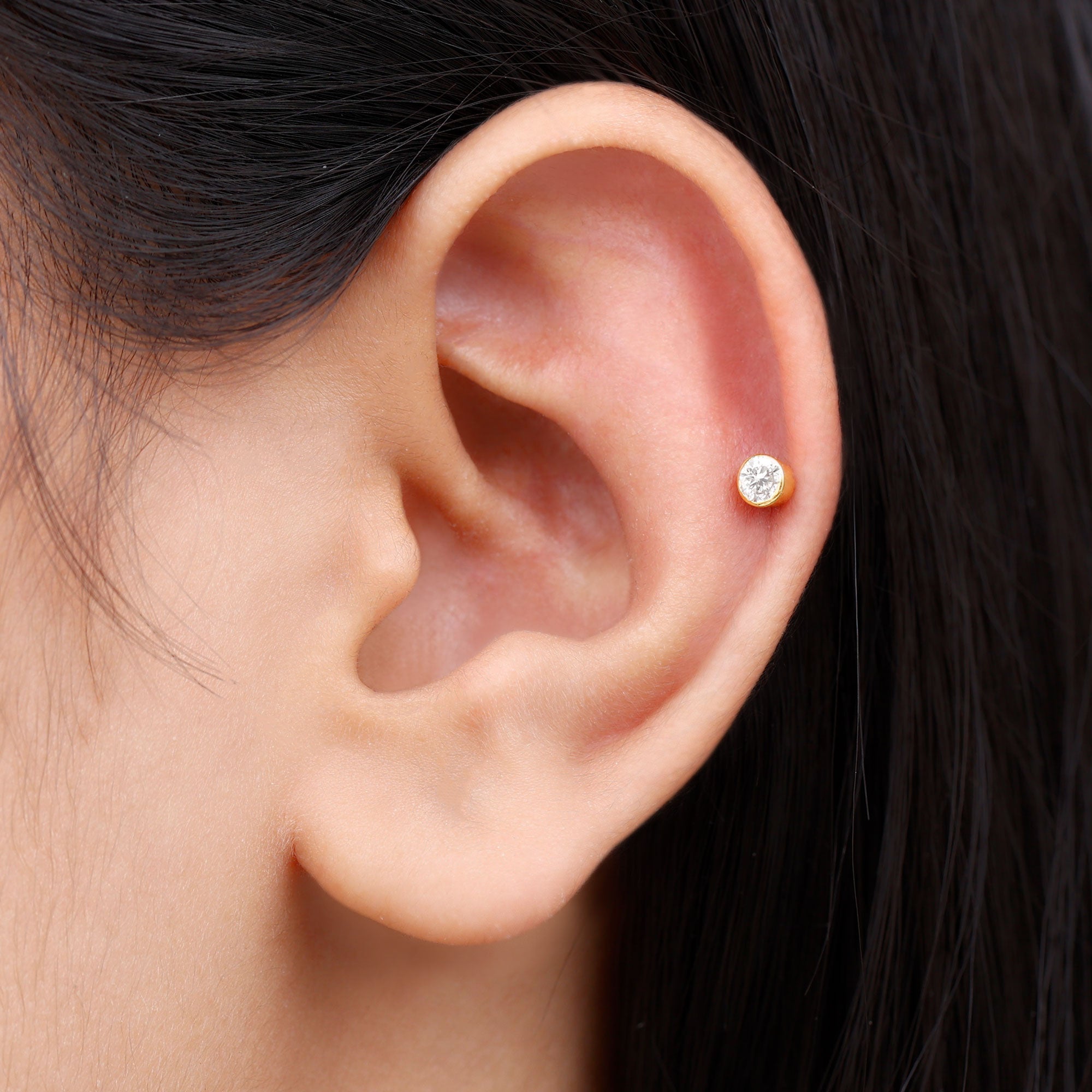 Highlight the simplicity and elegance with our 3 MM Diamond Cartilage Earring. This stunning conch earring features a captivating round diamond secured by bezel setting. This stunning diamond earpiece is perfectly suited for Helix, Conch, Upper Lobe, and Cartilage piercings. Exude elegance with this piercing earring, a striking addition to your ear stack collection. This Helix Earring Stud is ideal for those who seek unconventional beauty.