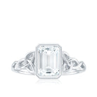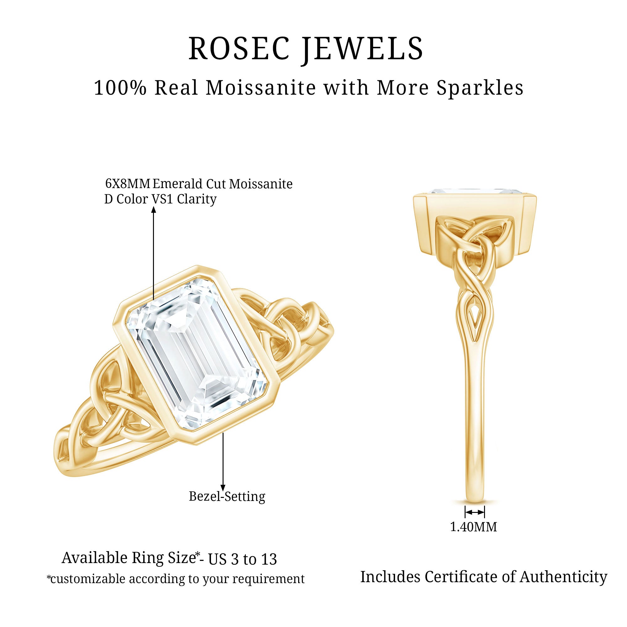 Treat yourself to the breathtaking charm of this Celtic Engagement Ring, showcasing a stunning 6X8 MM Emerald Cut Moissanite as a brilliant solitaire in secure bezel setting, enhanced by delicate round cut hidden moissanite. This Solitaire Engagement Ring is made from top-quality metal, giving it a classic and luxurious vibe that is bound to win your heart. Its intricate and lovely Celtic design wraps around the band, making this Solitaire Moissanite Ring a classy and one-of-a-kind way to show your love and commitment to your partner. The outstanding quality and meticulous attention to detail in the craftsmanship of this Emerald Cut Moissanite Engagement Ring guarantee that it will be a beloved and cherished piece for many years ahead. So, wear this Celtic Knot Ring and make a lasting statement of your love. With D color and VS1 clarity moissanites, this gem offers incredible brilliance at an affordable price comparable to traditional diamonds. The high polish finish and meaningful design give it a timeless essence you will adore. Available in various sizes and metal choices, this Emerald Cut Solitaire Ring comes beautifully packaged and ready for gifting.