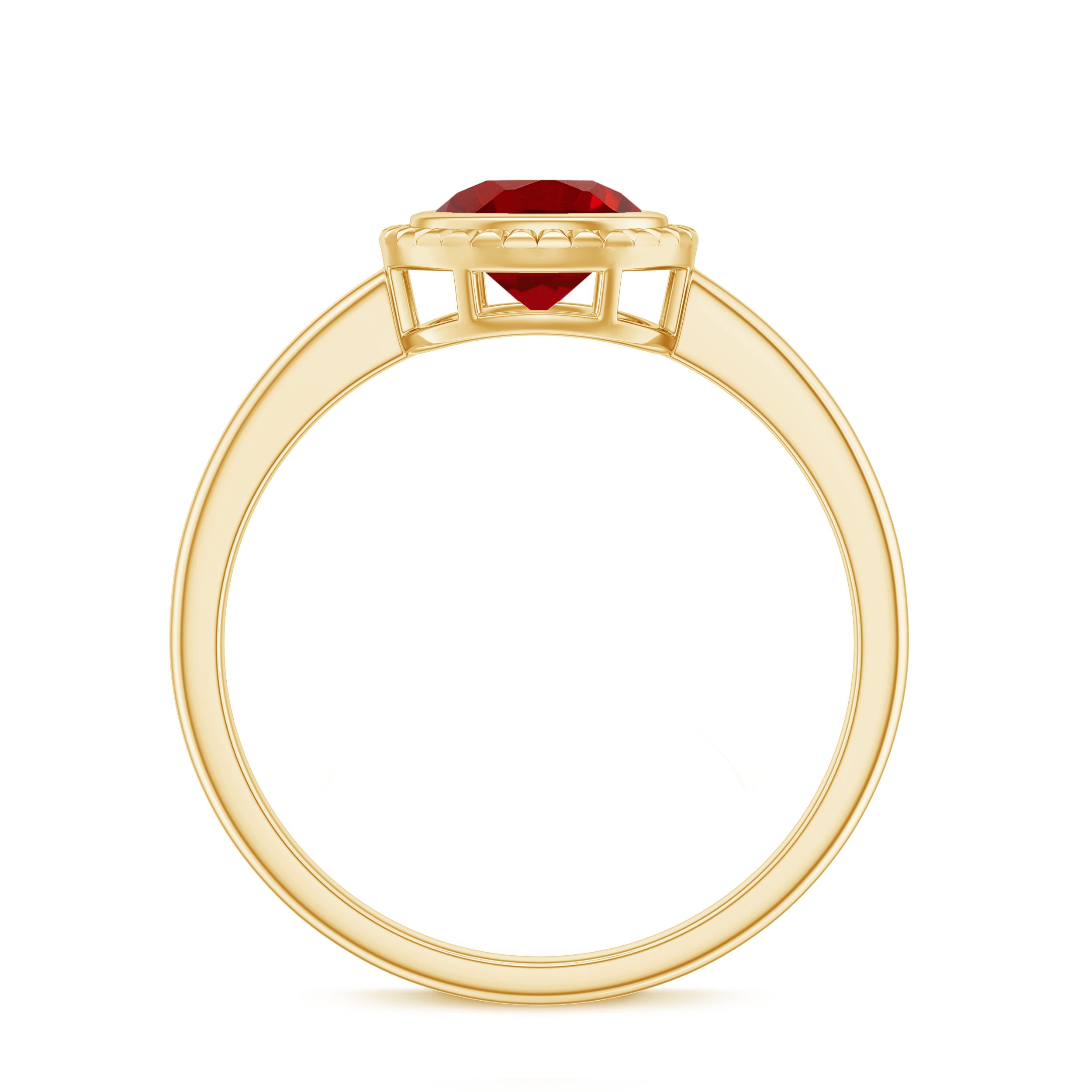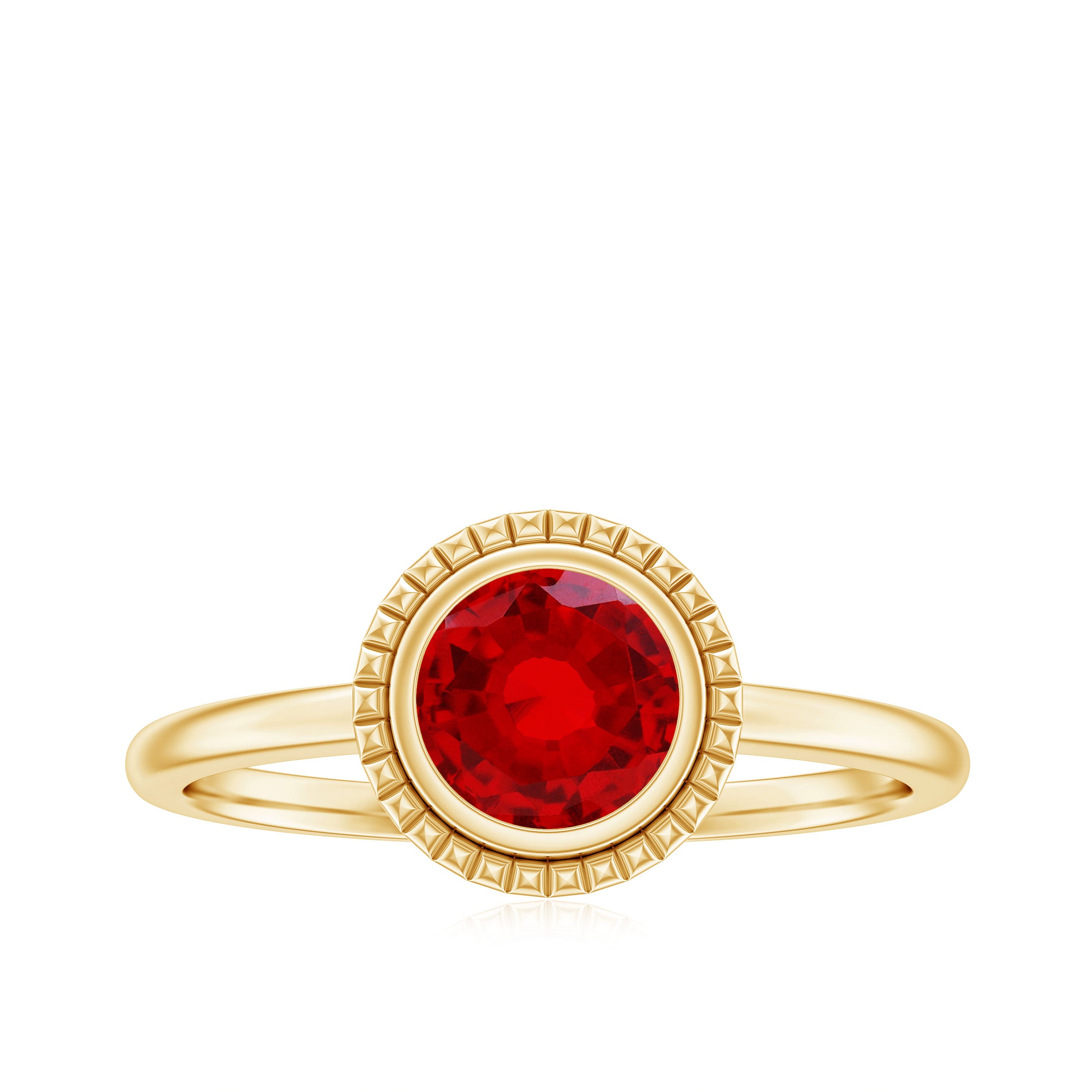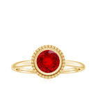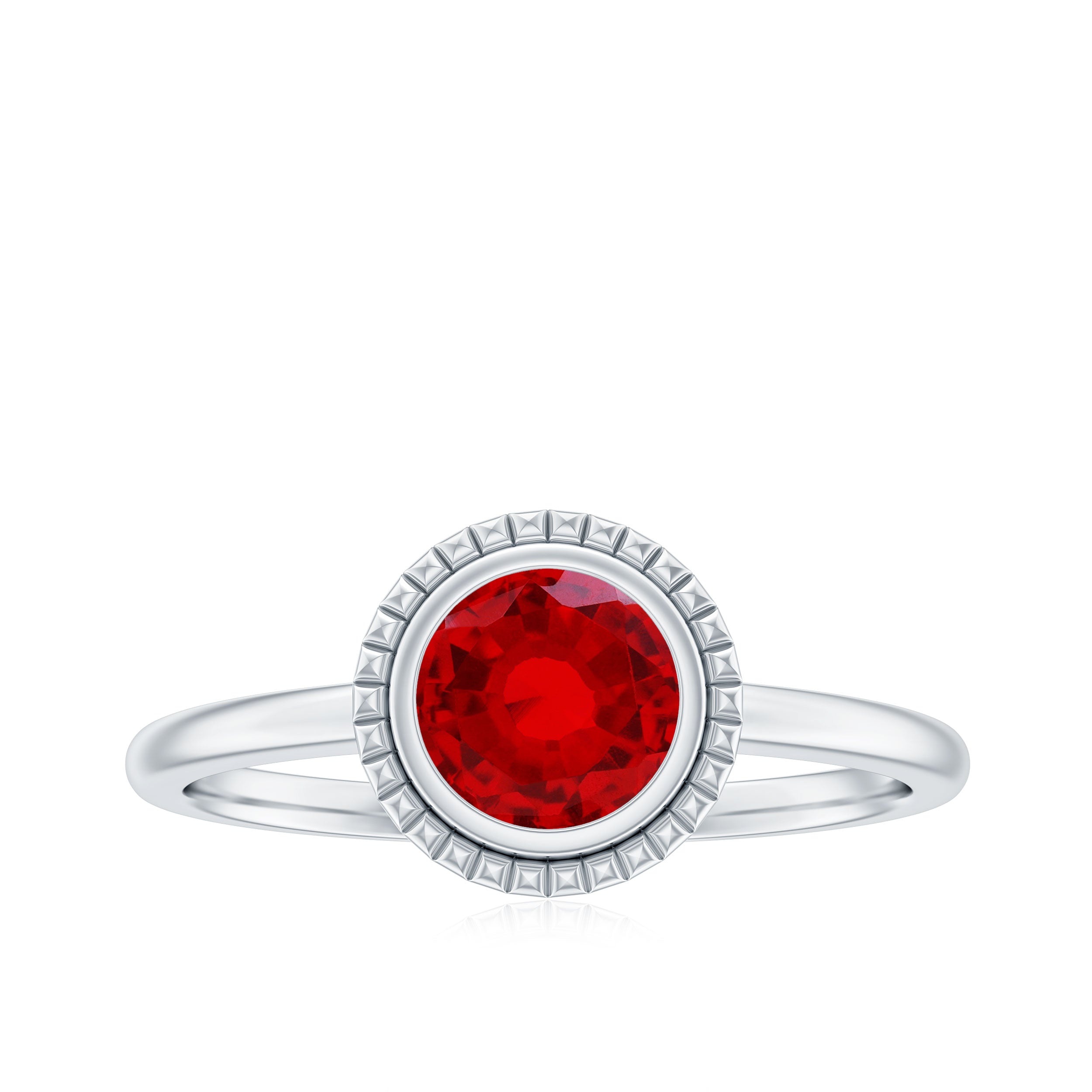 This elegant Lab Created Ruby Ring is all about meaning and style in one perfect piece. It features a 6 MM round cut lab grown ruby, held securely in smooth bezel setting. The ruby’s bold color takes the spotlight, while the engraved detailing adds just the right touch of charm. Whether you are starting a new chapter or simply reminding someone how much they mean to you, this Ruby Solitaire Ring is a beautiful way to do it. It is simple and timeless, everything a promise ring should be. The bezel setting not only keeps the gemstone protected but also gives the design a sleek and modern twist. Made with care using sustainable and ethical practices, this Ruby Proposal Ring is perfect for those who want their jewelry to reflect their values. Every detail is thoughtfully crafted, from the AAAA quality lab grown ruby to the fine engraved detailing gives it that perfect shine. Whether it is for a promise, an anniversary, or just because, you can be sure this Bezel Set Ruby Ring will be worn and loved for years. Available in multiple sizes to get that perfect fit, it is a meaningful piece designed to last.