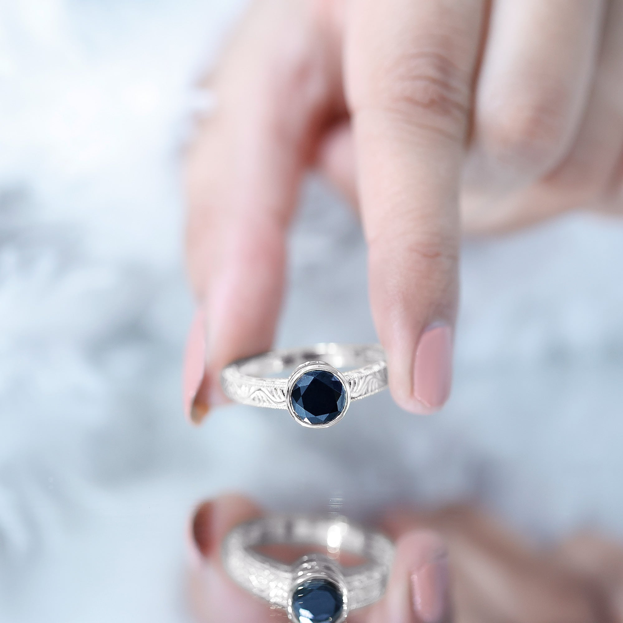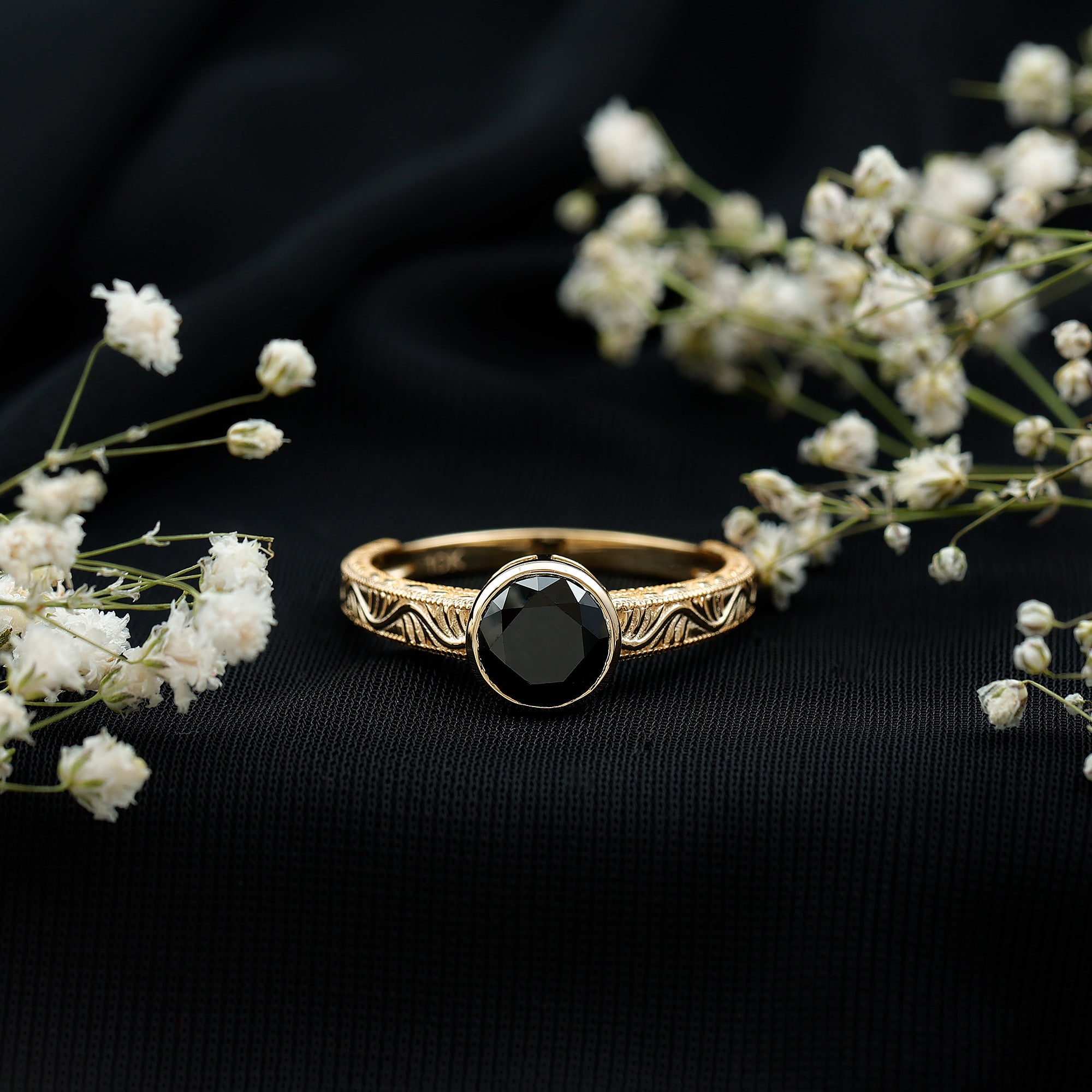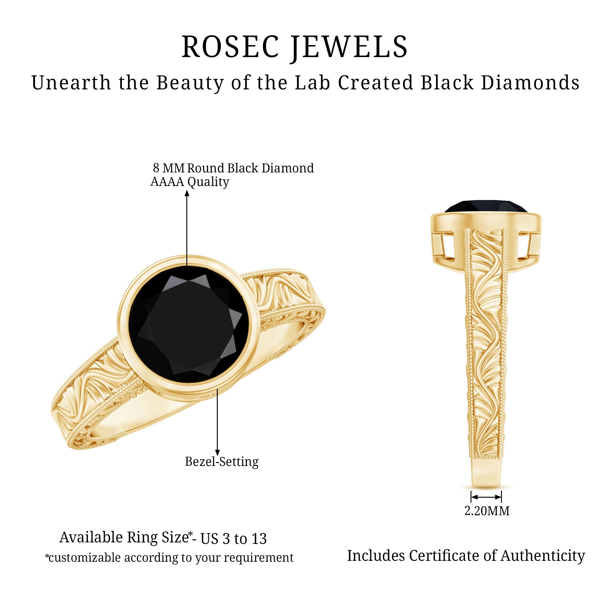 Express your emotions to your beloved with this captivating Solitaire Ring adorned with a Round Shape Lab Created Black Diamond set beautifully as a solitaire in bezel setting. The engraved details add a touch of elegance and sophistication, making it a truly special and meaningful piece. Let this enchanting Black Gemstone Ring be a symbol of your love and devotion, a cherished token that will speak volumes about your feelings for her.