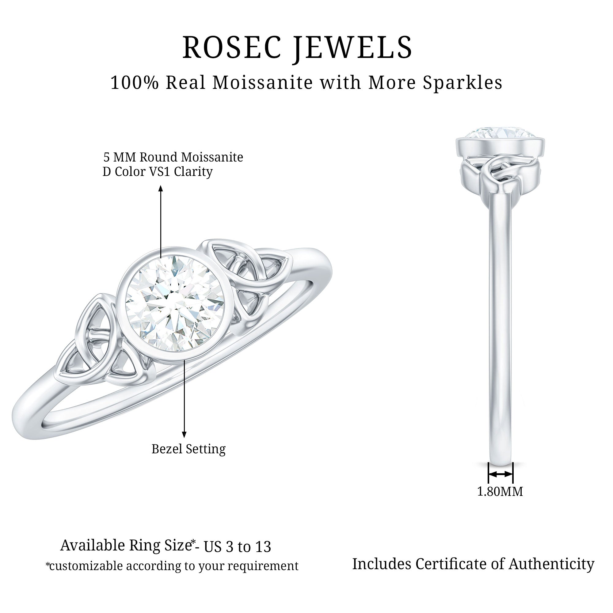 Make a timeless statement with this Moissanite Solitaire Ring. Featuring 5 MM round shape Moissanite set in a secure bezel setting, its guaranteed to be your new favorite. Rooted in tradition, inspired by love, this Moissanite Promise Ring tells a story far deeper than words. Symbolizing eternity, unity, and a bond that cannot be broken, the intricate Celtic knotwork on this Solitaire Ring makes it a heartfelt tribute to lasting love and meaningful connection. The Trinity Knot is the most well-known Celtic design, represents eternity and continuity. These knots can represent the past, present and future of the relationship. Crafted in high-quality metal and adorned with a D-VS1 quality moissanite, this Celtic Knot Engagement Ring offers a luminous, ethical alternative to traditional stones, ideal for the bride who values both meaning and sustainability. Whether you are making a proposal or commemorating a love that has already proven its strength over time, this Trinity Knot Ring transforms every occasion into a memorable one. Graceful, timeless, and rich in symbolism, it serves as the ideal representation of an everlasting love. Whether you are enhancing your daily attire or introducing a hint of brilliance, this Round Moissanite Ring is guaranteed to attract attention.