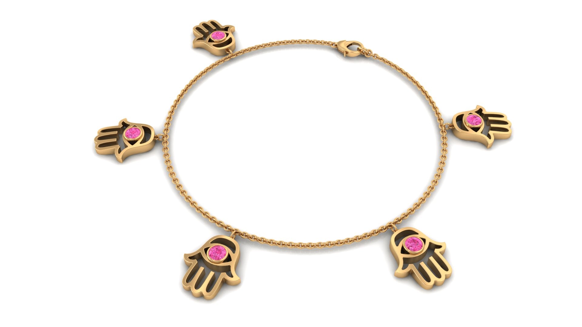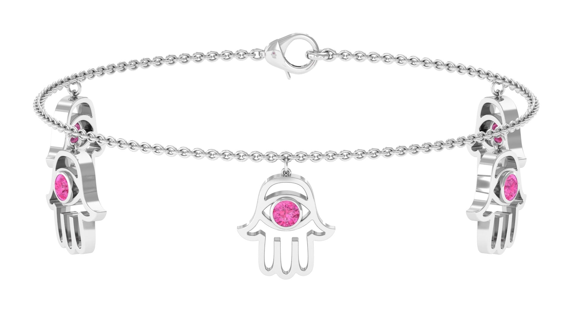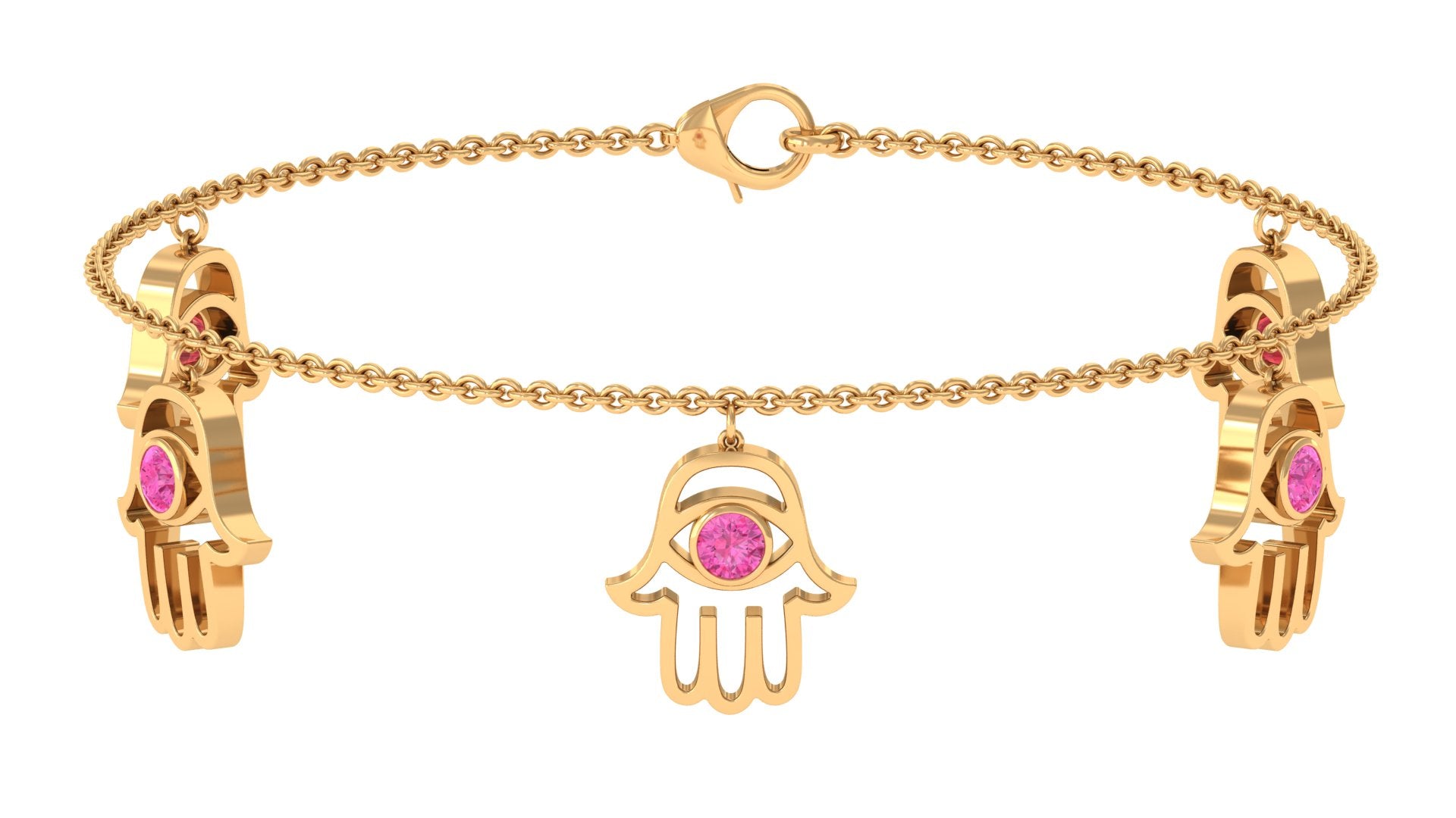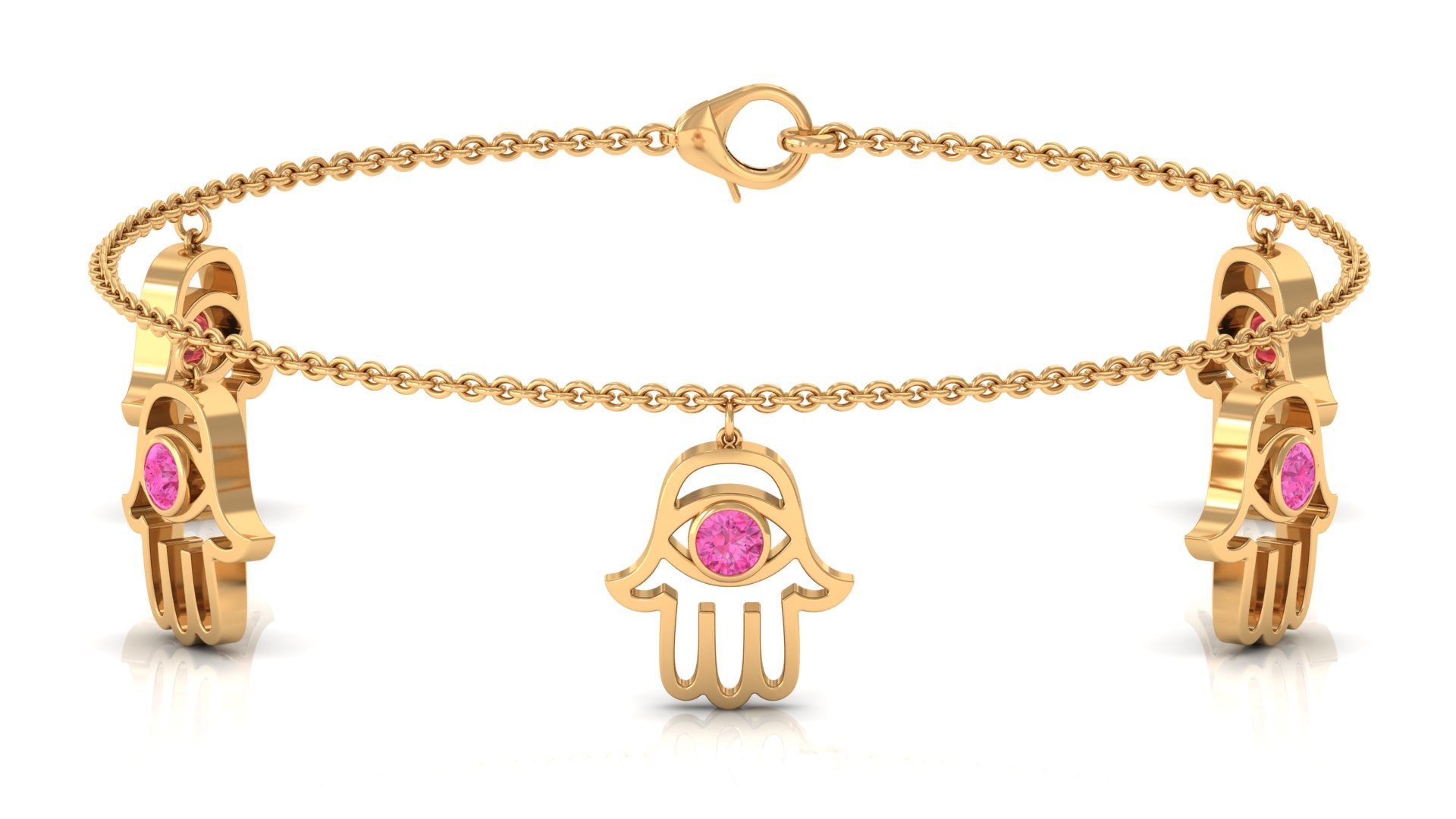 Graceful, meaningful, and effortlessly stylish, this Pink Sapphire Bracelet is designed to bring beauty and symbolism to your everyday look. Each delicate Hamsa hand charm gently sways from the chain, showcasing a dainty pink sapphire securely held in bezel setting. The soft blush tone of the sapphire adds a touch of feminine elegance while symbolizing love, compassion, and emotional harmony. The Hamsa hand, known across many cultures as a symbol of protection and good fortune, brings added significance to this charming Chain Charm Bracelet. Whether worn for its spiritual meaning or simply for its aesthetic appeal, the Hamsa Bracelet offers a perfect balance of style and sentiment. Crafted with attention to detail, the chain is finished with a sturdy lobster clasp that allows for easy adjustment and ensures a comfortable fit for any wrist size. Its lightweight design makes it ideal for daily wear, either on its own for a subtle style or layered with other favorites for a more stylish and modern look. Perfect as a thoughtful gift or a treat for yourself, this Pink Sapphire Chain Bracelet adds a touch of grace, positivity, and timeless charm to any jewelry collection.