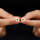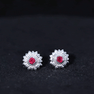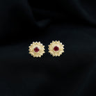 Add a graceful touch to your look with these beautiful Flower Stud Earrings, designed to bring charm and color to any outfit. At the center of each earring is a round ruby, carefully set in bezel setting that keeps the stone secure while highlighting its rich red color. The ruby acts as the heart of the design, drawing attention with its natural beauty. Surrounding the center stone are delicate metal leaves arranged to form a lovely sunflower-inspired shape. This floral design adds an elegant feel, making the Ruby Stud Earrings stand out. The thoughtful details give the Ruby Flower Earrings a timeless look that can be worn on many occasions. They are available in different metal options, allowing you to choose the one that best matches your personal style. They are suitable for everyday wear as well as special events. The screw back closures provide a secure and comfortable fit, so you can wear them with confidence throughout the day.