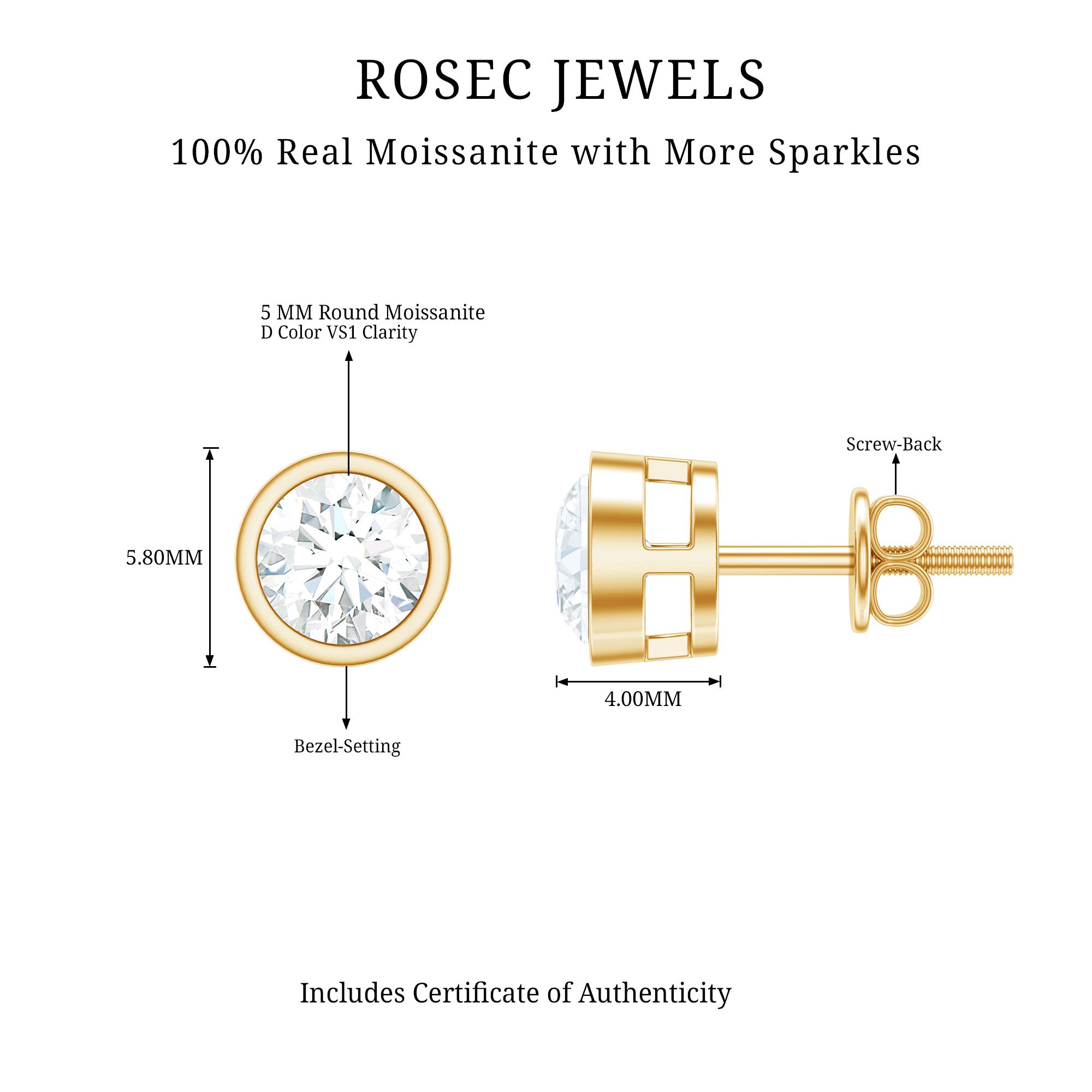 The Everyday Stud Earrings are adorned with the sparkling Brilliant Cut 5 MM Round Shape Moissanite gemstone in the secured Bezel Setting. These Moissanite Stud Earrings are the perfect accessory to complement all the outfits, like casual, office wear, outings with friends, traveling, and many more. These Bezel Set Earrings hold the adorable shine of D-VS1 quality moissanite that adds a layer of extra shine. The simplistic design makes them perfect for both men and women. These will be delivered to you in the classic jewelry box with the certificate of gemstone authentication. The style is modern and timeless, making it easy for anyone to wear and enjoy. These Solitaire Moissanite Earrings also make a thoughtful and practical gift. With their simple design, bright sparkle, and comfortable fit, these Screw Back Earrings are a lovely addition to any jewelry collection, easy to wear, easy to love, and perfect for everyday moments or special occasions.