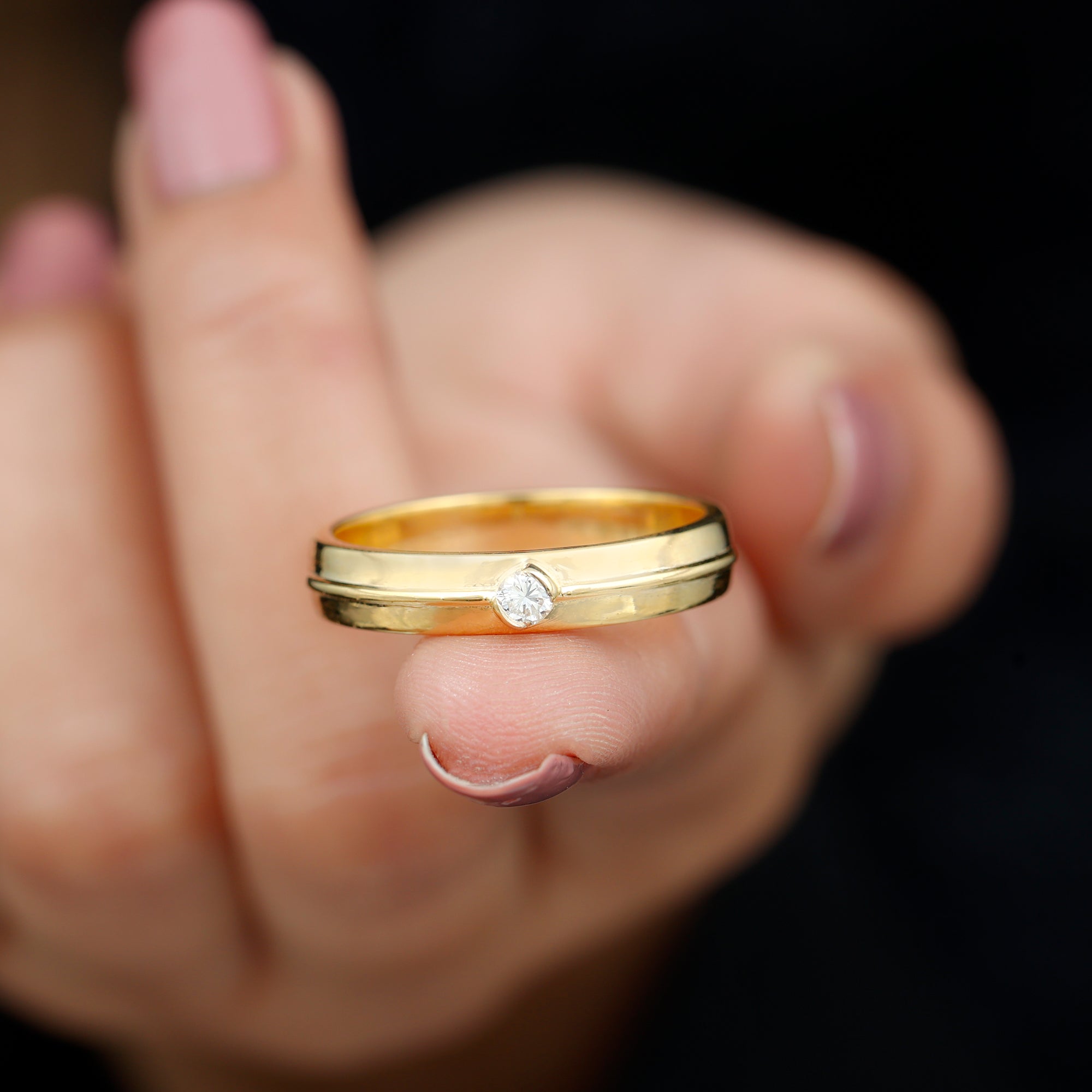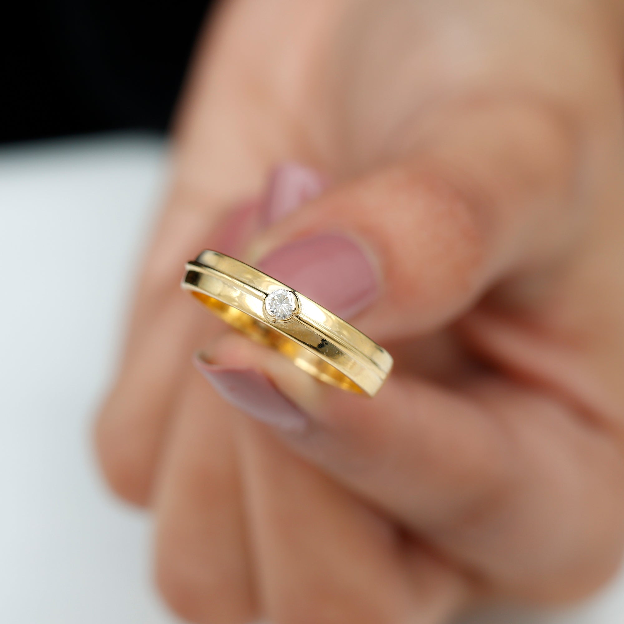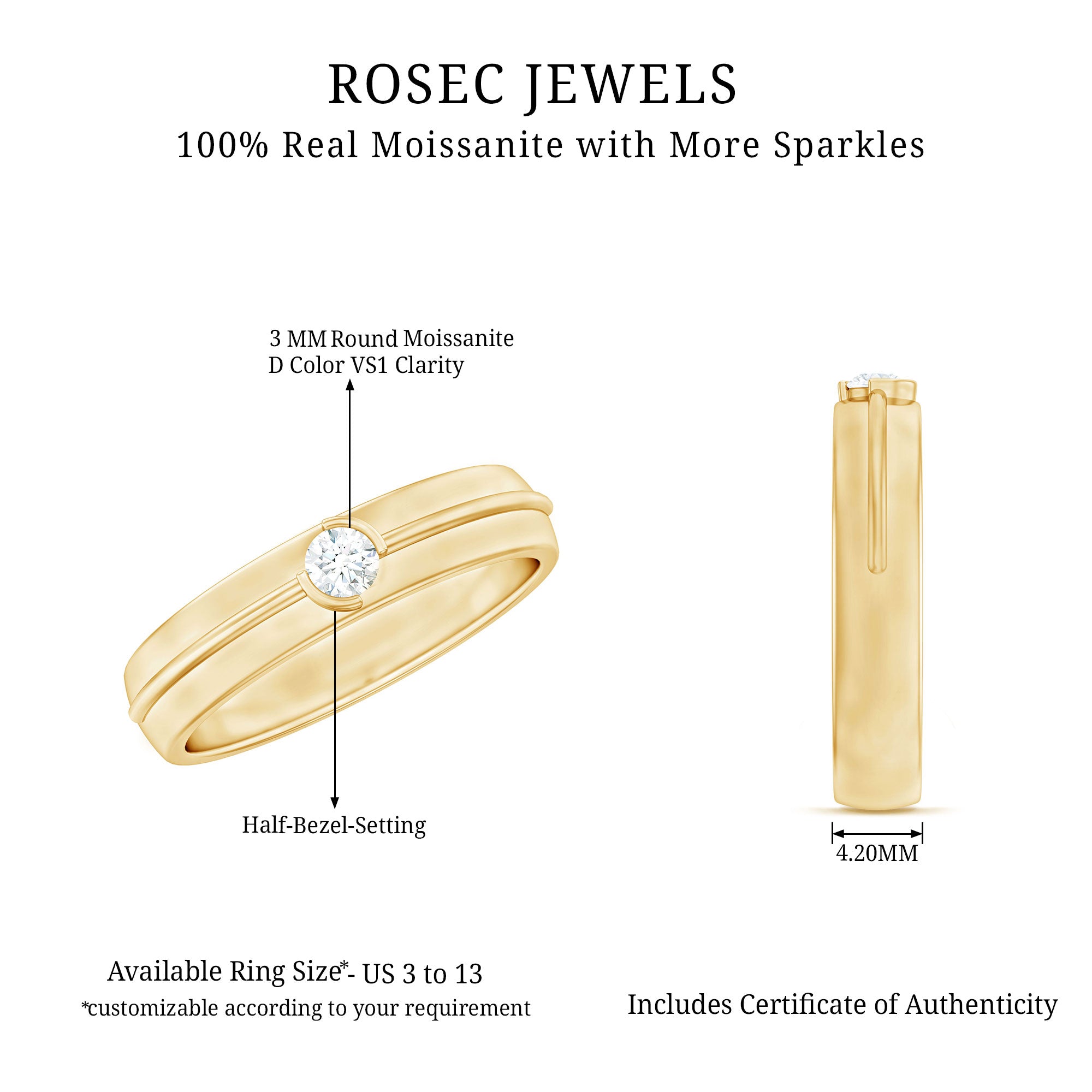 This Mens Moissanite Wedding Band blends bold simplicity with refined craftsmanship, creating a timeless piece designed for everyday wear and lifelong significance. At the heart of the design is a round brilliant cut moissanite, securely set in half bezel setting. The setting provides a sleek, modern frame around the stone, protecting its edges while still allowing plenty of light to enhance its natural brilliance and fire. The band itself features a broad, smooth surface with a subtle engraved line running down the center, leading the eye directly to the sparkling moissanite. This Male Wedding Band has a design that speaks to understated confidence, perfect for the man who values both style and substance. With its comfortable fit and durable construction, this Solitaire Wedding Band is ideal for daily wear. Whether chosen as a wedding ring or a personal symbol of commitment, this Modern Mens Wedding Band offers a sophisticated balance of tradition and modern design. Complete with a timeless silhouette and a brilliant center stone, this band is a meaningful choice built to last a lifetime.