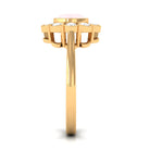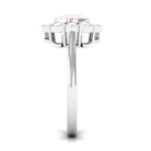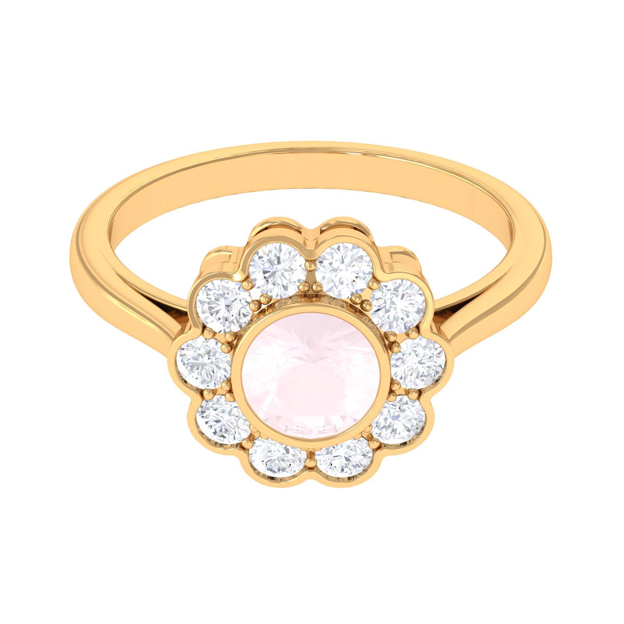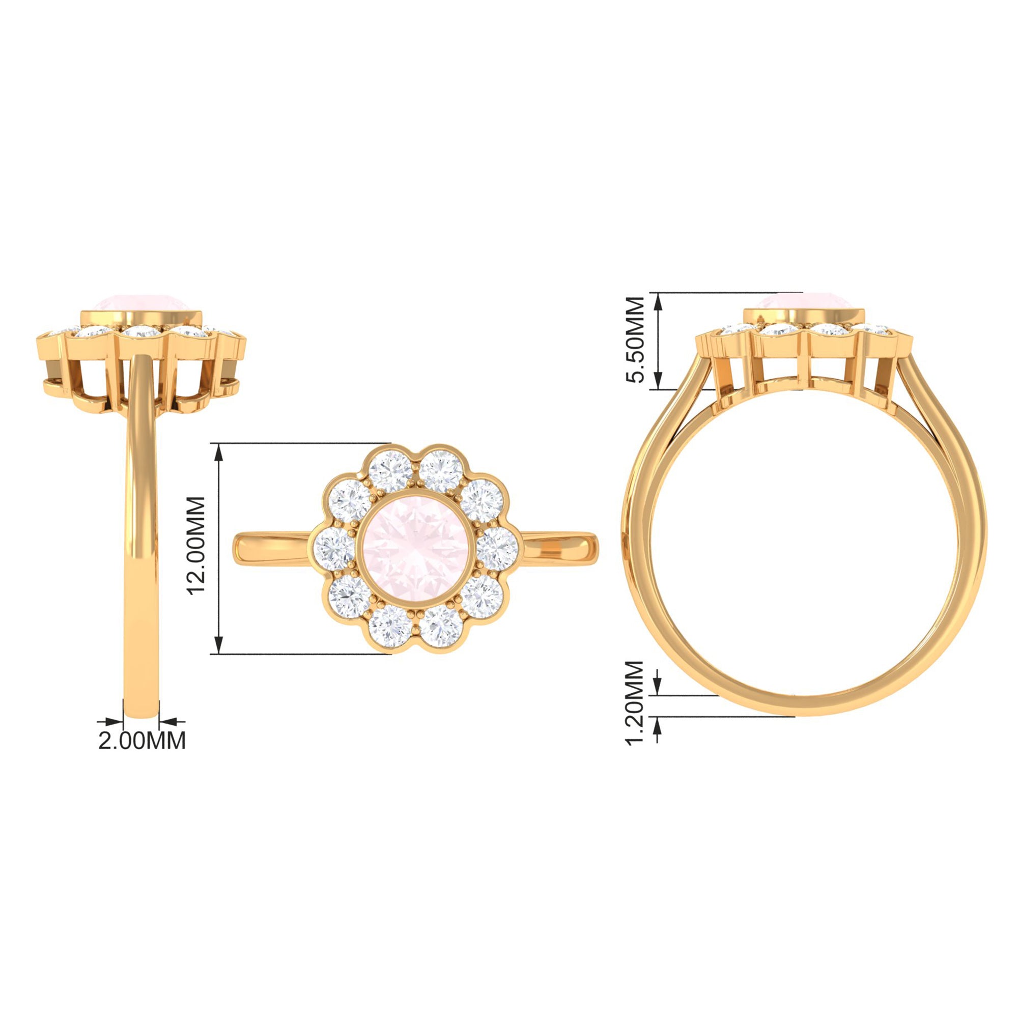 This exquisite halo engagement ring boasts a stunning floral design, featuring a round-cut rose quartz set in a bezel setting with a Diamond halo. It is beautifully crafted with solid gold, adding to its luxurious appeal. Wear this rose quartz ring and be the center of attention.