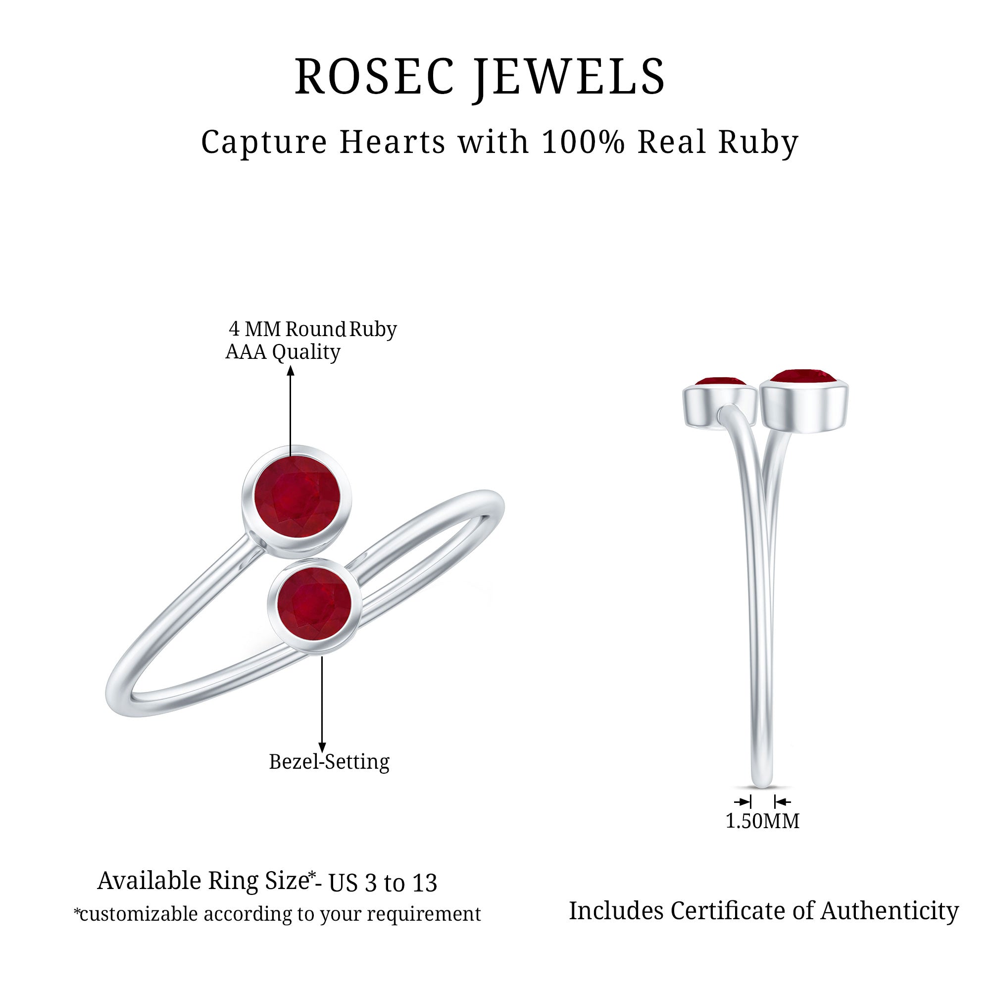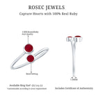 If youre two hearts that beat as one, this Ruby Two Stone Promise Ring is the one to commemorate your love with! Stealing all the limelight with their romantic pop of red, it features twin stones of Round Shape Ruby, held by Bezel Setting. Set in a Bypass Shank, this Certified Ruby Promise Ring is a perfect fusion of classic and contemporary. Whats more, it fetches a premium quality grade of AAA, so that your beloved can flaunt it all day, everyday!