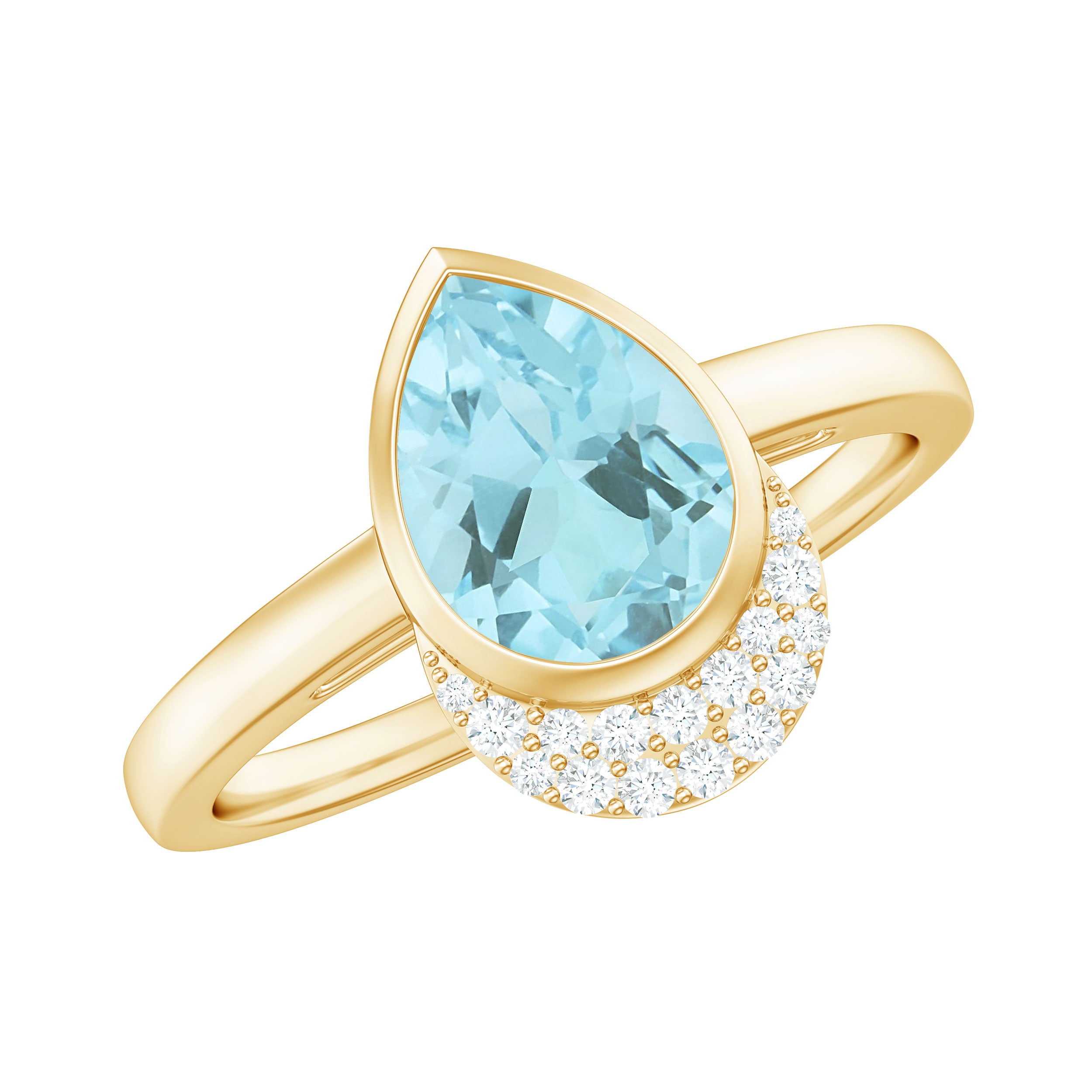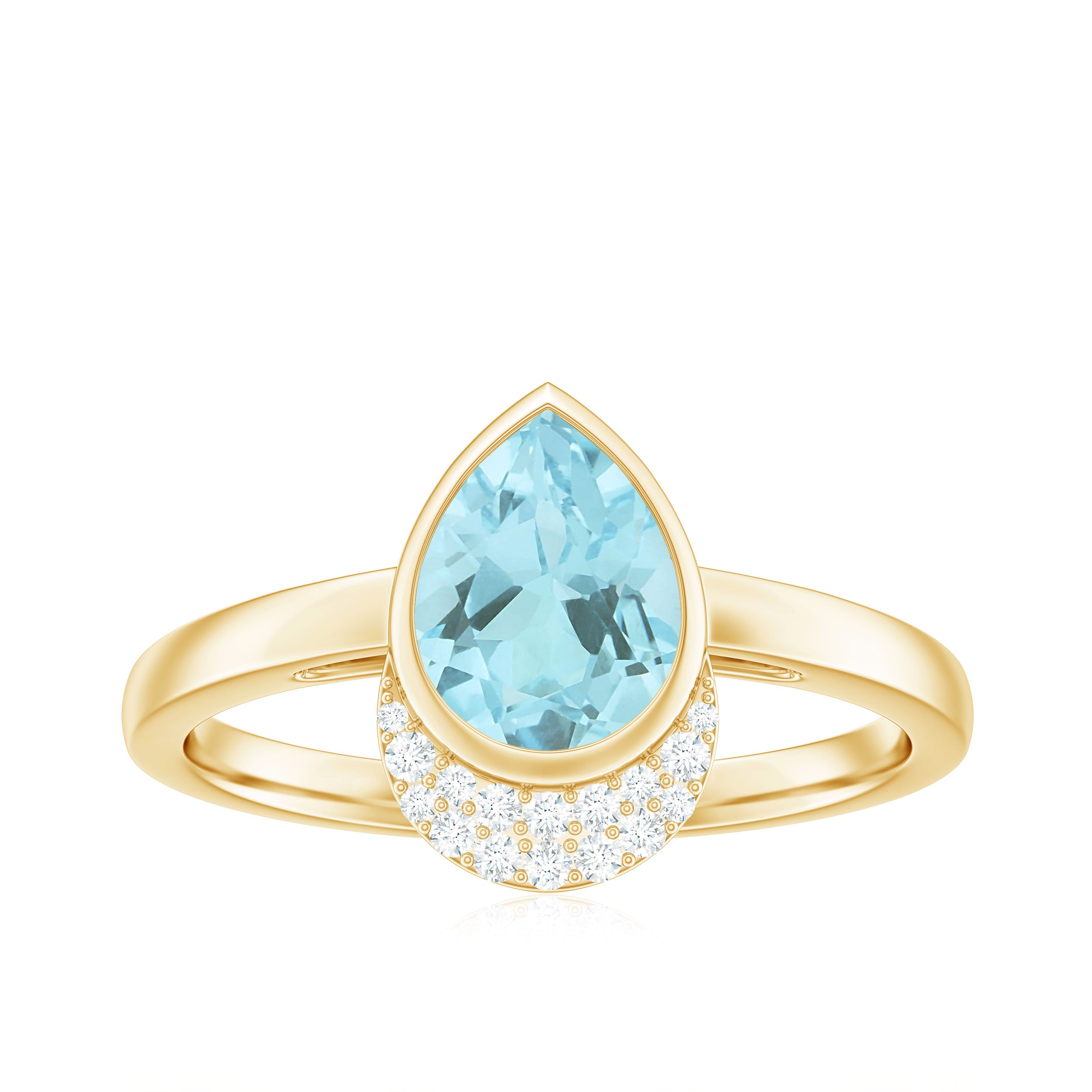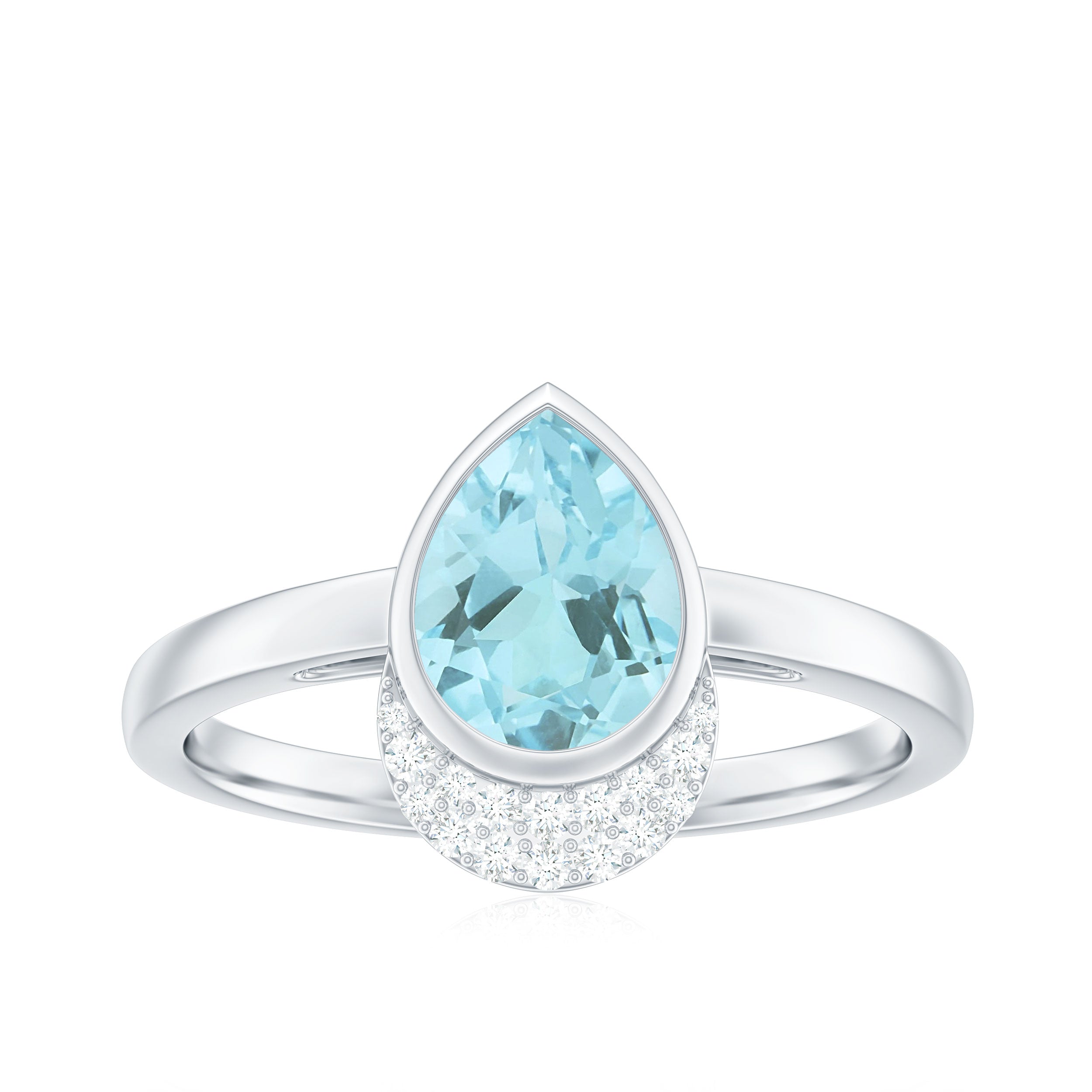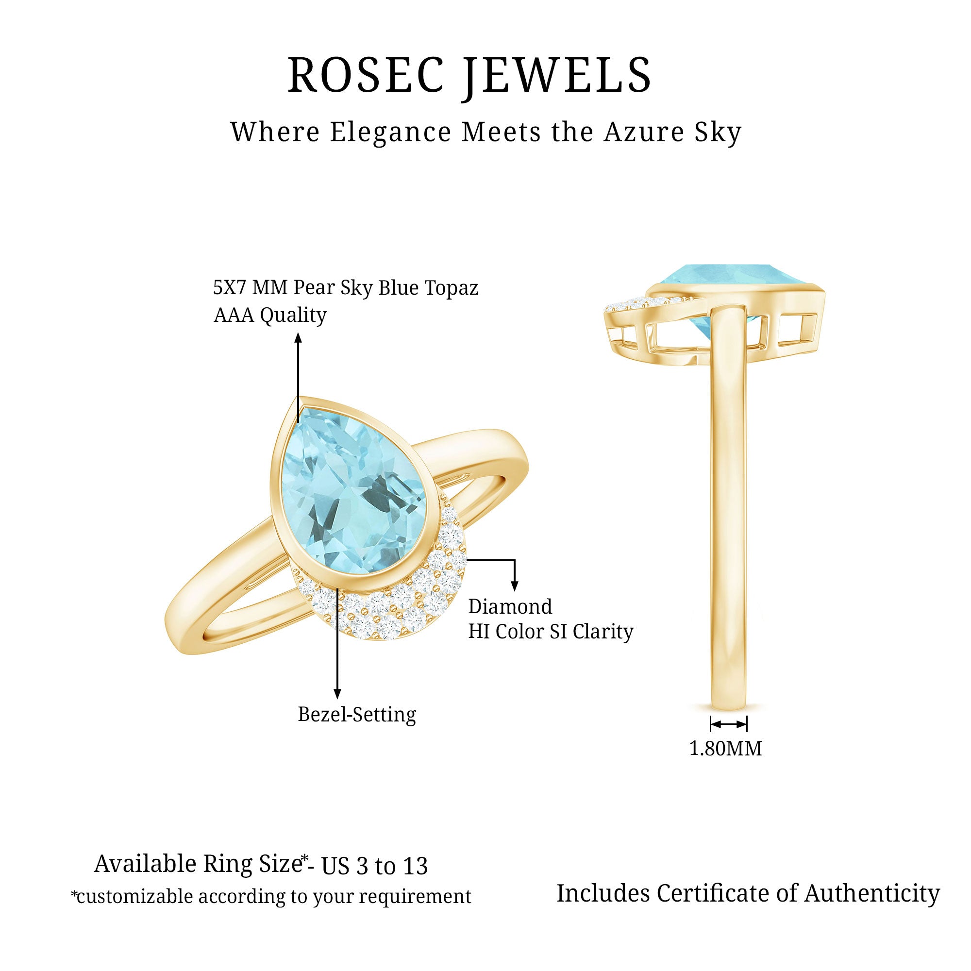 Immerse yourself in the serene beauty of the Sky Blue Topaz Ring, where elegance meets an ethereal charm. This exquisite ring features 5X7 MM Pear Shaped Aquamarine in Bezel Setting with Diamonds. The 3A Quality Aquamarine is reminiscent of tranquil ocean waters under a sunlit sky. This Topaz and Diamond Ring sparkles with every movement, casting a mesmerizing glow that captures the essence of love. With its captivating design and soothing blue hues, this Topaz Engagement Ring is a token of affection and a celebration of lifes enchanting moments. With its spellbinding charm and soothing hue this Engagement Ring captures its essence in an everlasting way.