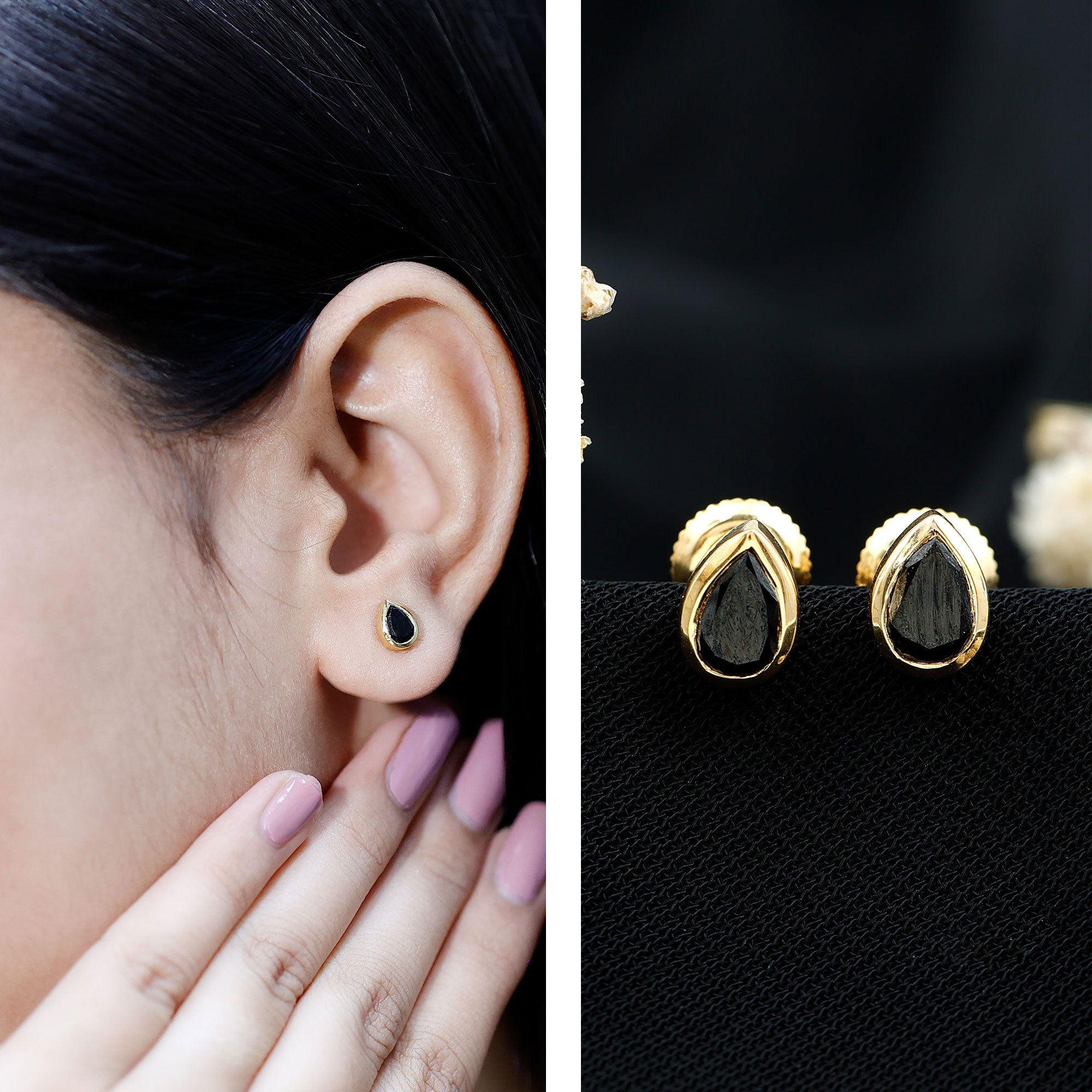 Crafted in 14K yellow gold plated silver, these Black Diamond Earrings bring a subtle style to any look without trying too hard. Each earring features a 4X6 MM pear shaped real black diamond, held securely in a smooth bezel setting that gives the design a polished and contemporary finish. The pear shape offers a soft elegance, while the overall look keeps the design feeling fresh and effortlessly wearable. The bezel setting not only enhances the stone’s shape but also adds a layer of protection, ideal for everyday wear. Fitted with screw-back closures, these Black Diamond Stud Earrings stay snug and secure, so you can move through your day with comfort and confidence. As the April birthstone, black diamonds represent strength, resilience, and clarity, making these Pear Shaped Earrings a thoughtful gift or personal reminder of inner power. Whether you are adding to your own collection or picking out something meaningful for someone special, these April Birthstone Earrings bring a bold, modern vibe to a timeless style. Understated but far from ordinary, they are the kind of piece you will reach for again and again.